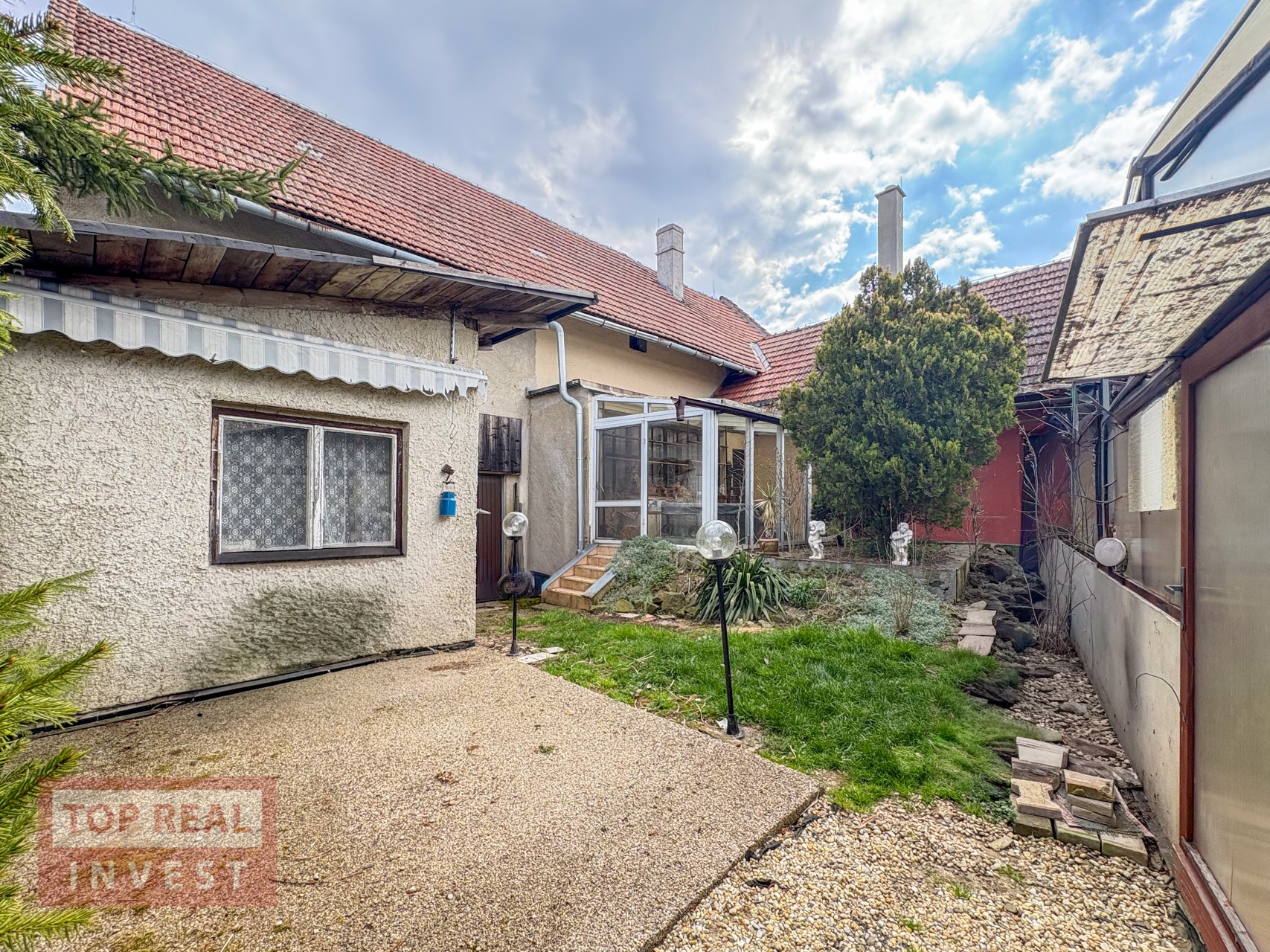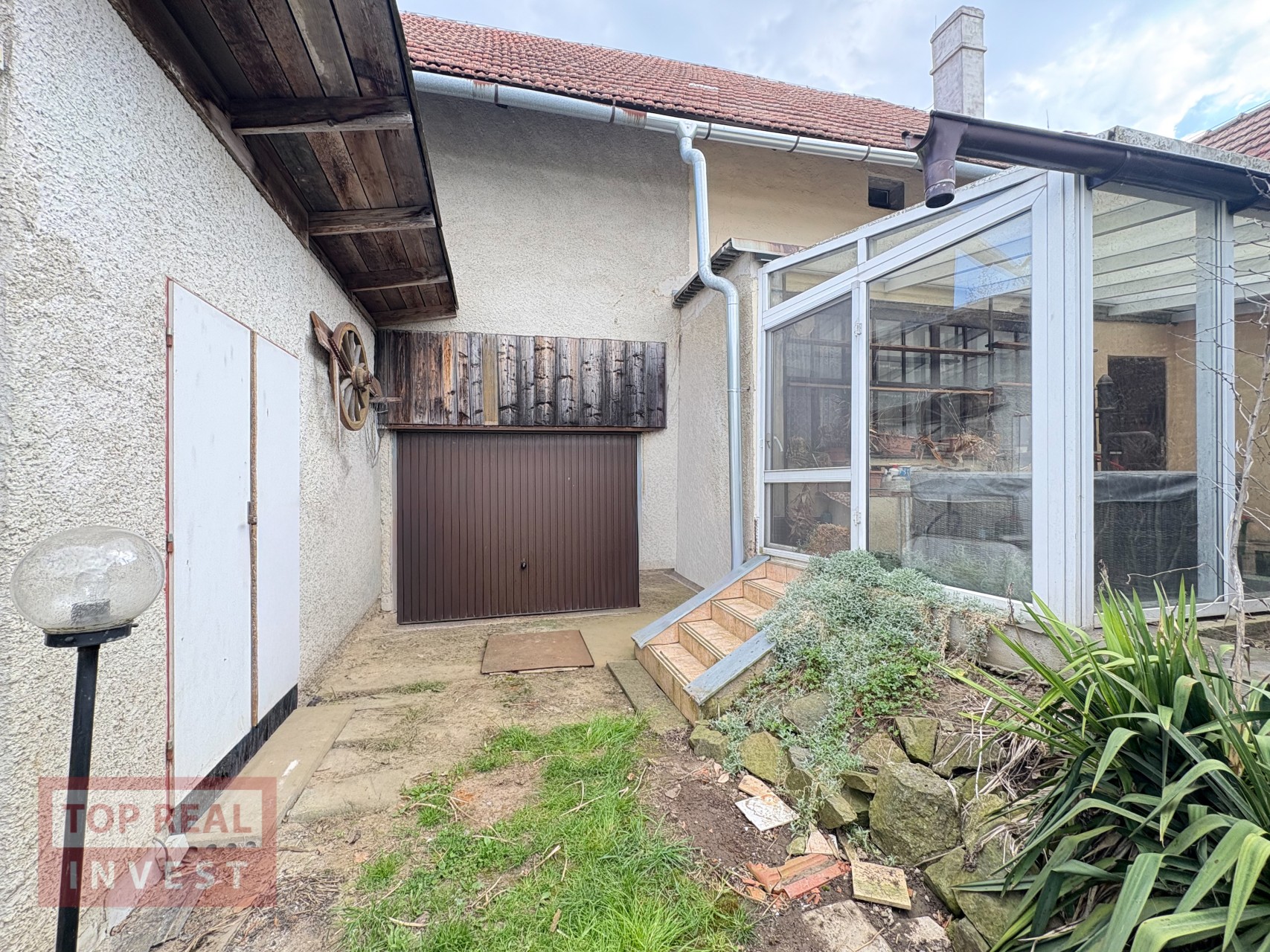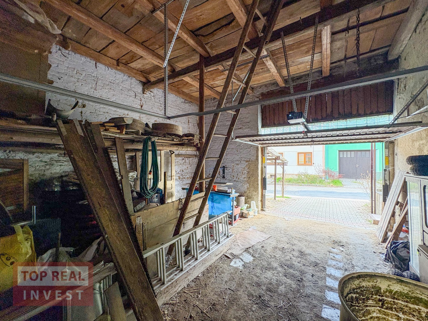 Součástí domu je také garáž s průjezdem na pozemek za domem, což je velmi praktické řešení. A studna, která byl používána na zalévání zahrady.