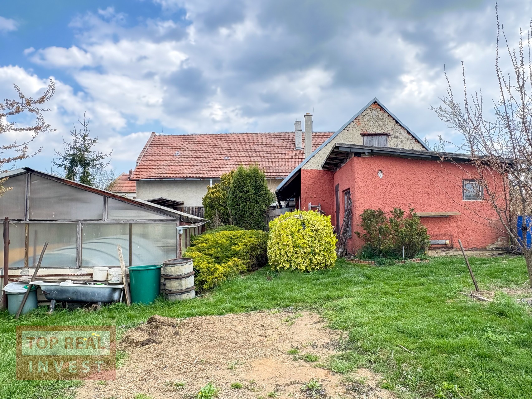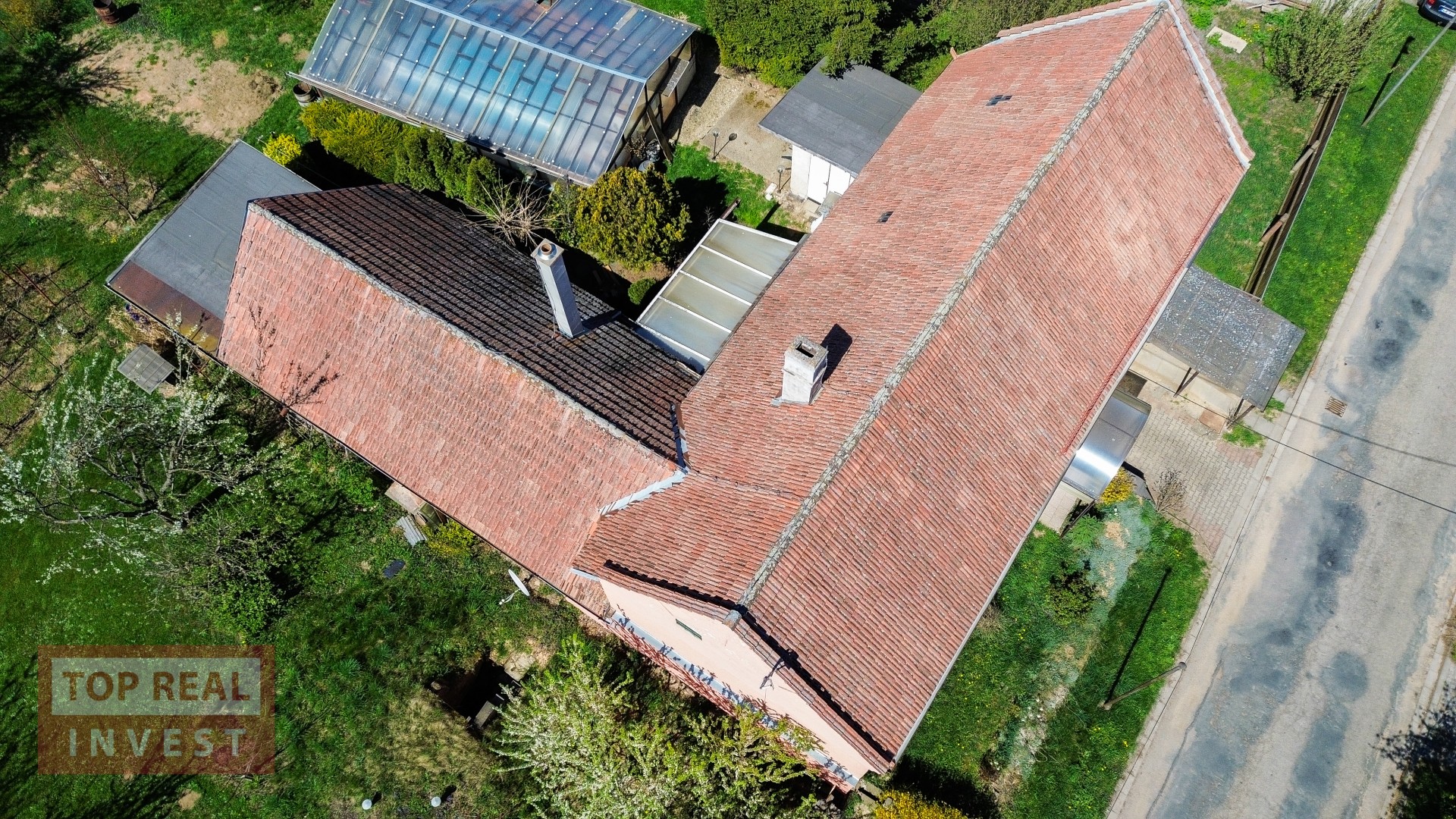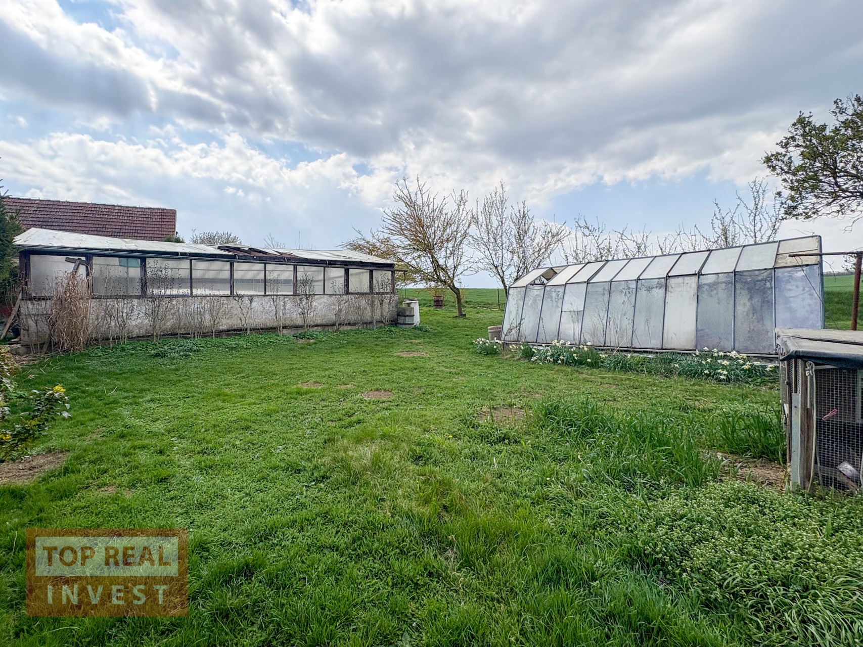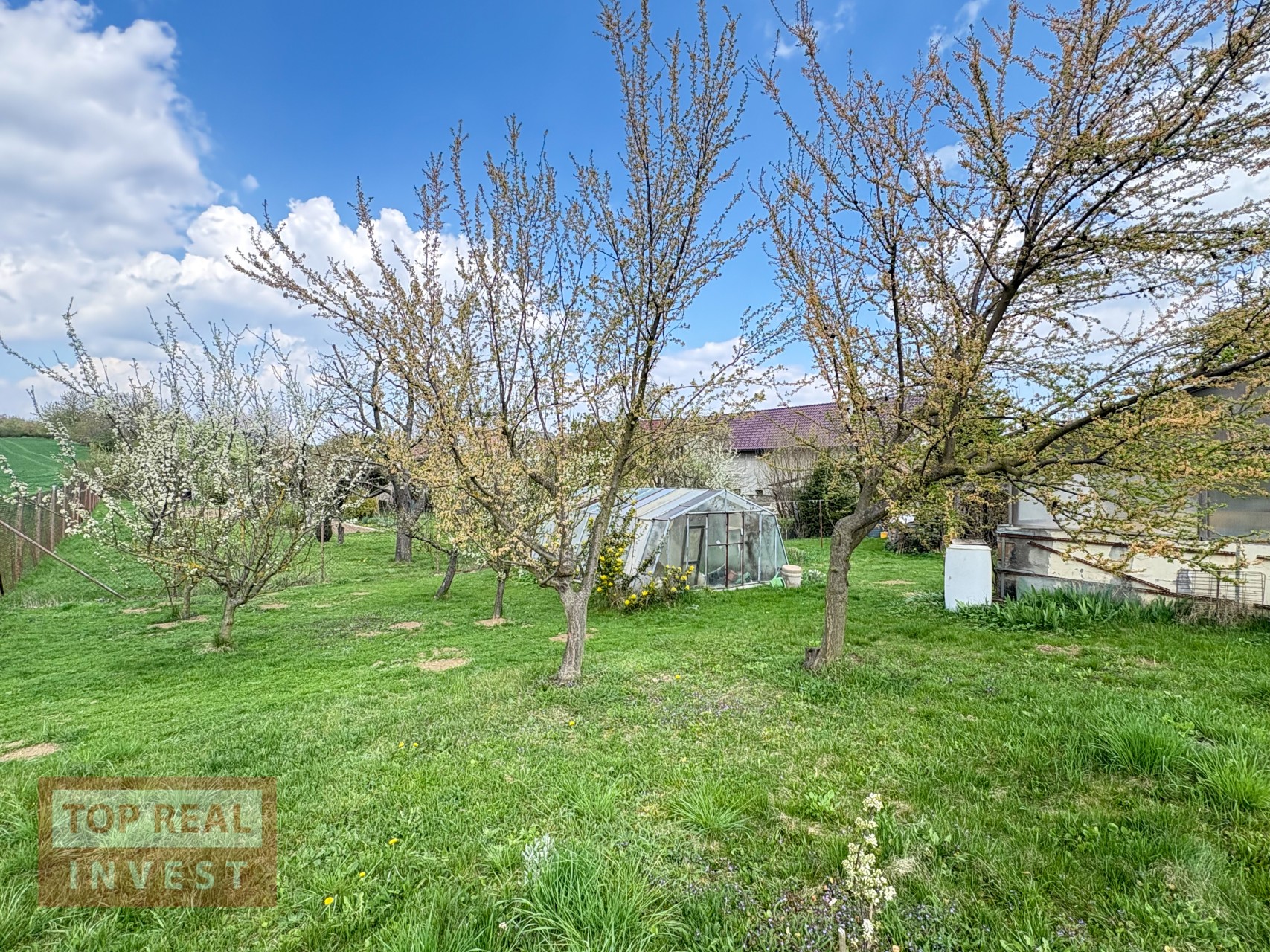 Velkým benefitem nemovitosti je rozlehlá zahrada, která navazuje na okolní pole a nabízí krásný výhled do krajiny. Na zahradě se nachází ovocné stromy, dva skleníky, studna, kůlna a zimní zahrada. Majitelé zde vybudovali také bazén se zastřešením. Díky své velikosti poskytuje zahrada dostatek prostoru pro pěstování, odpočinek i další využití.
