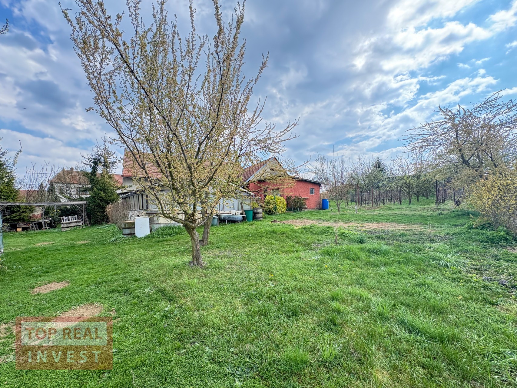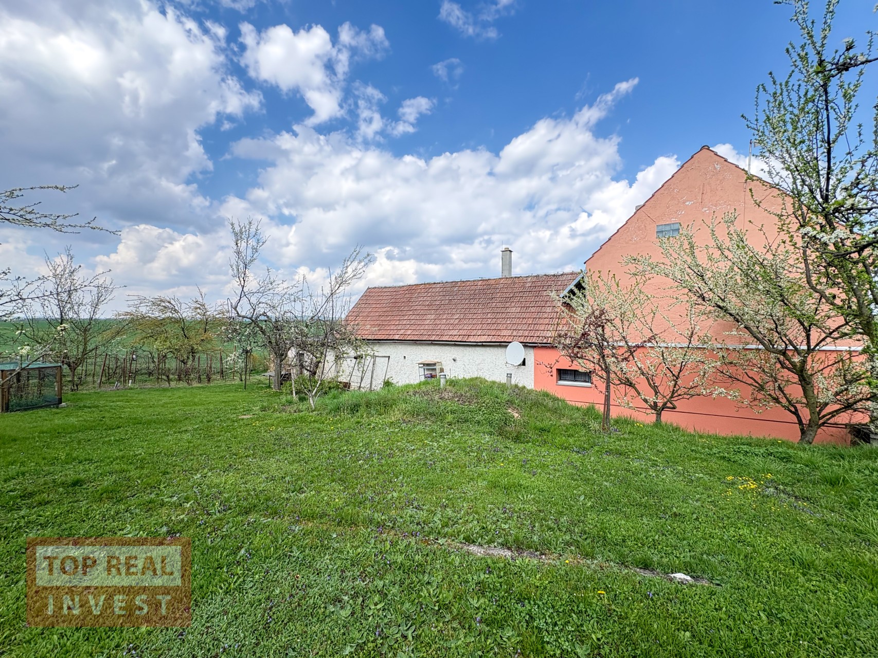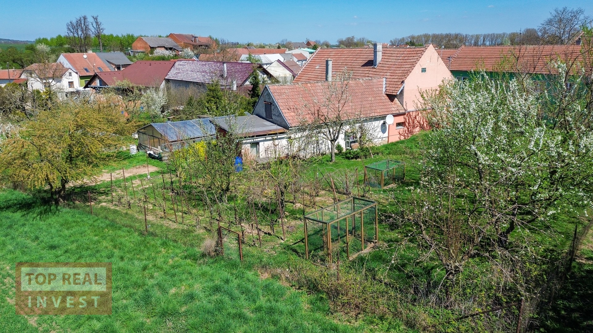 Velkým benefitem nemovitosti je rozlehlá zahrada, která navazuje na okolní pole a nabízí krásný výhled do krajiny. Na zahradě se nachází ovocné stromy, dva skleníky, studna, kůlna a zimní zahrada. Majitelé zde vybudovali také bazén se zastřešením. Díky své velikosti poskytuje zahrada dostatek prostoru pro pěstování, odpočinek i další využití.