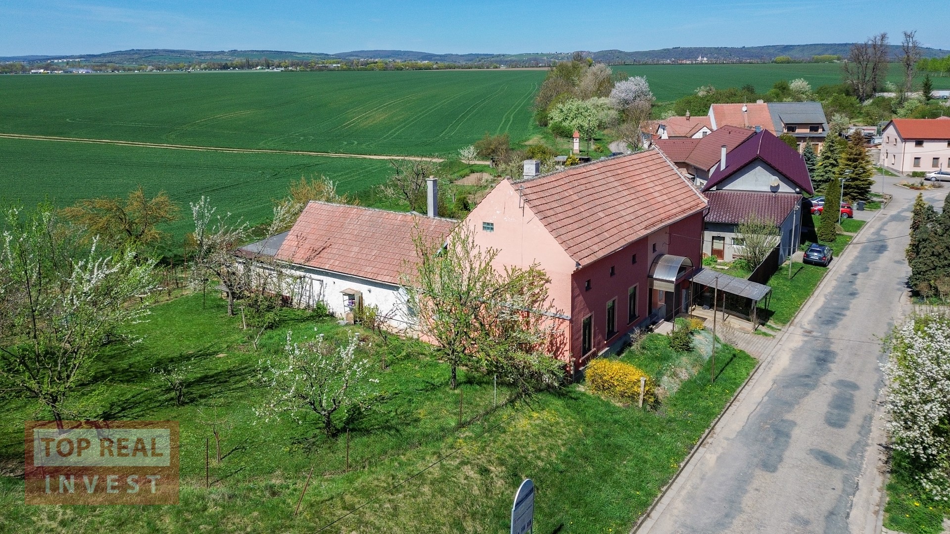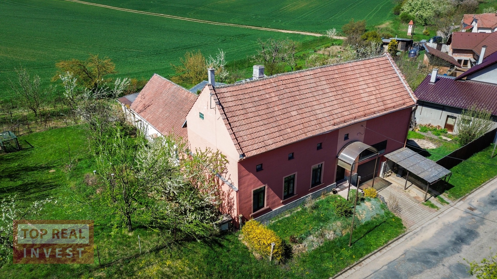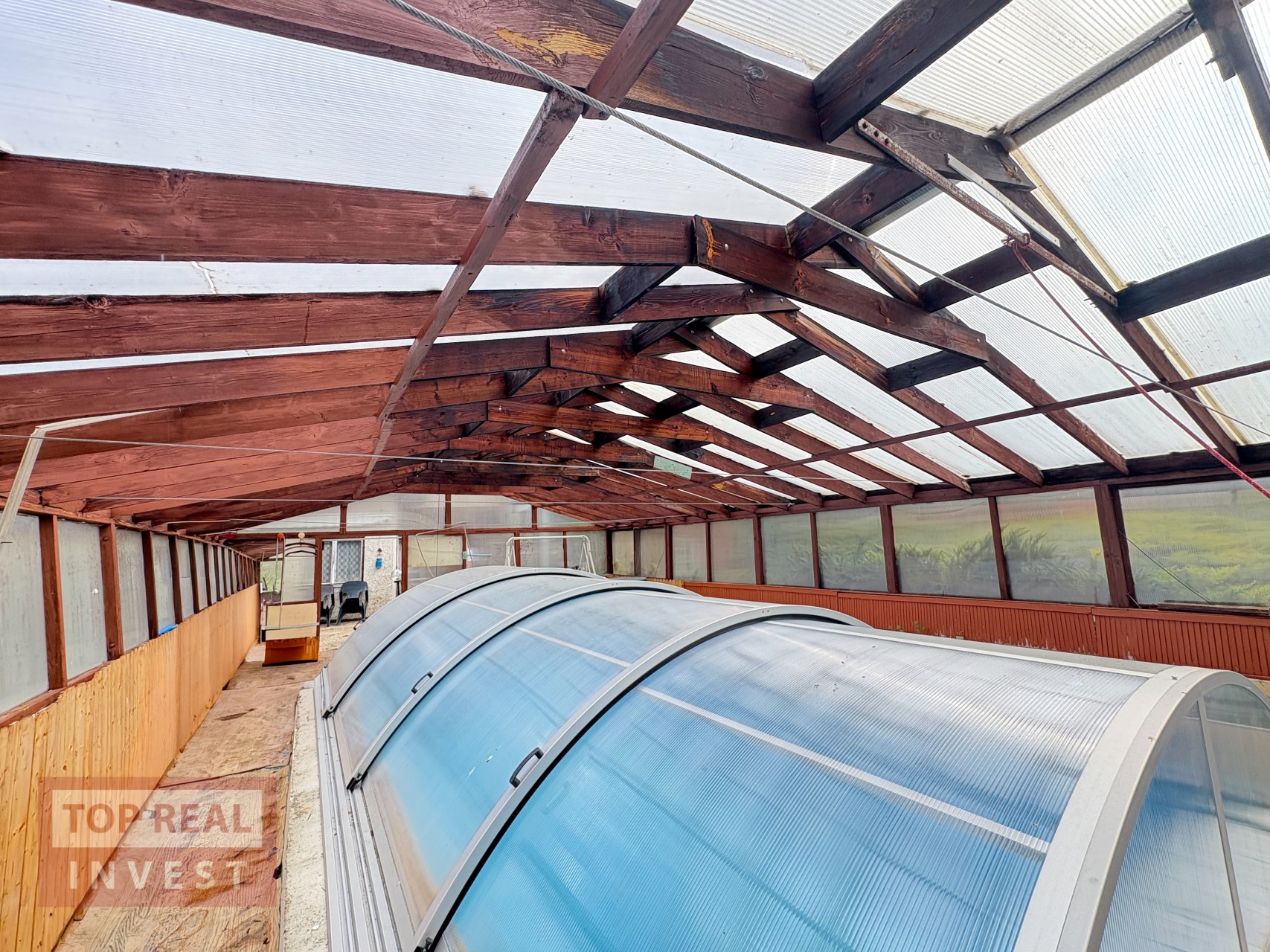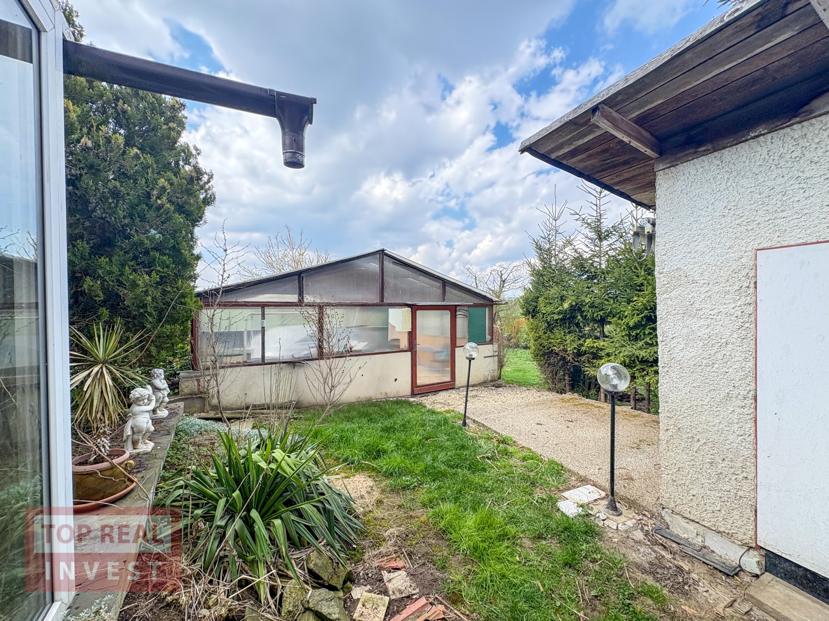 Velkým benefitem nemovitosti je rozlehlá zahrada, která navazuje na okolní pole a nabízí krásný výhled do krajiny. Na zahradě se nachází ovocné stromy, dva skleníky, studna, kůlna a zimní zahrada. Majitelé zde vybudovali také bazén se zastřešením. Díky své velikosti poskytuje zahrada dostatek prostoru pro pěstování, odpočinek i další využití.