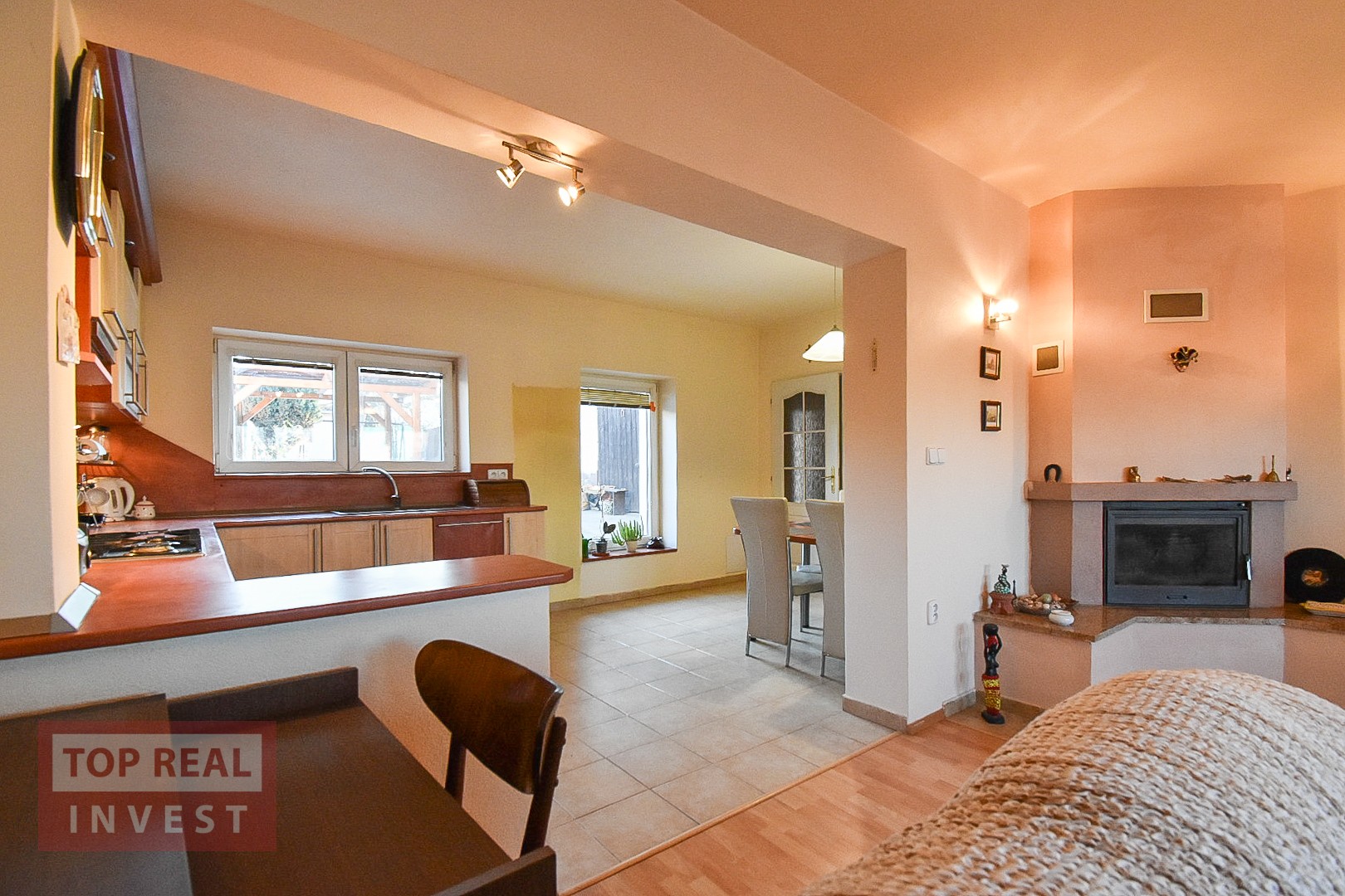 Srdcem domu je velkoryse řešený obytný prostor, kde je kuchyně s jídelní částí plynule propojena s obývacím pokojem. Díky tomuto řešení působí interiér velmi otevřeně a prostorně. V obývacím pokoji je instalována krbová vložka, z krbu jsou průduchy do chodby a kuchyně, zajišťuje efektivní přitápění.