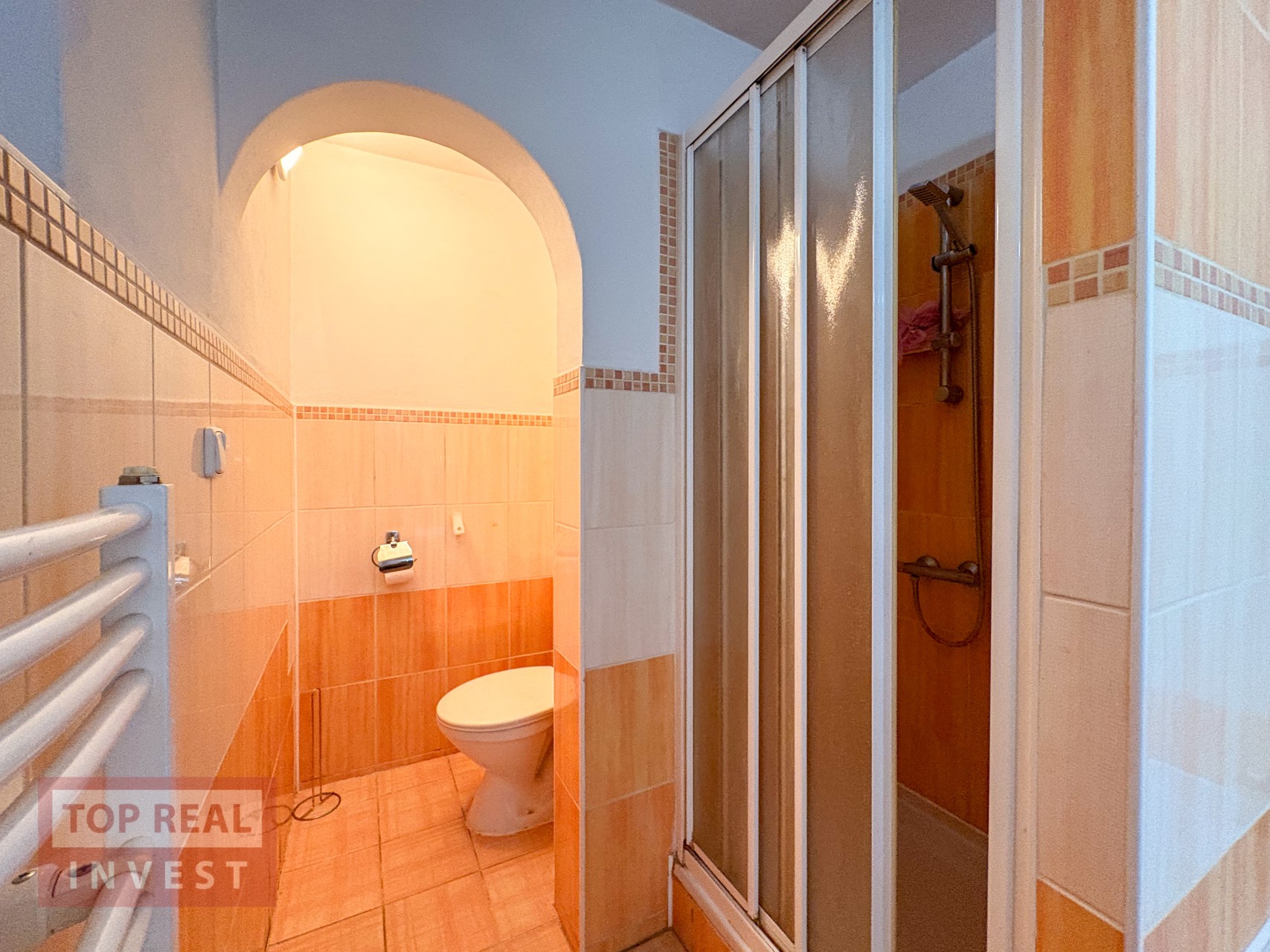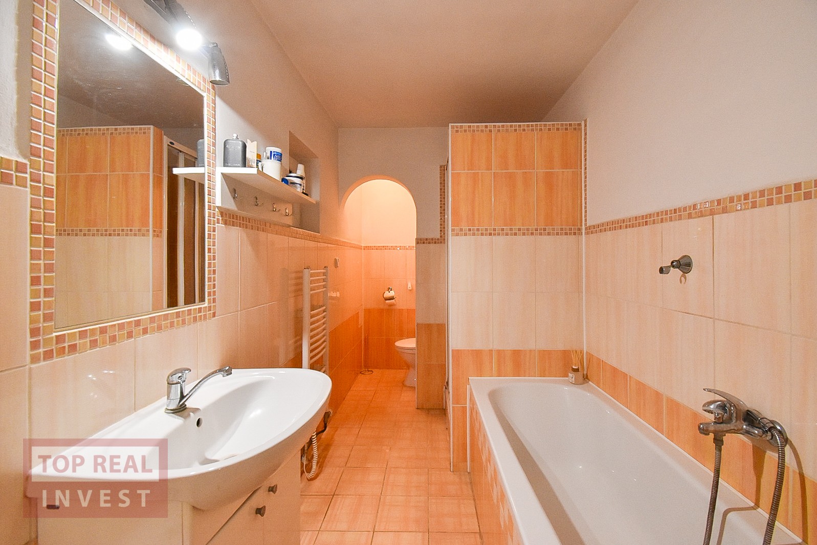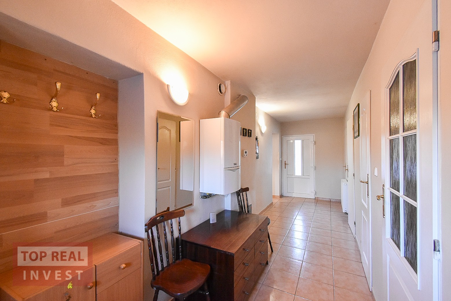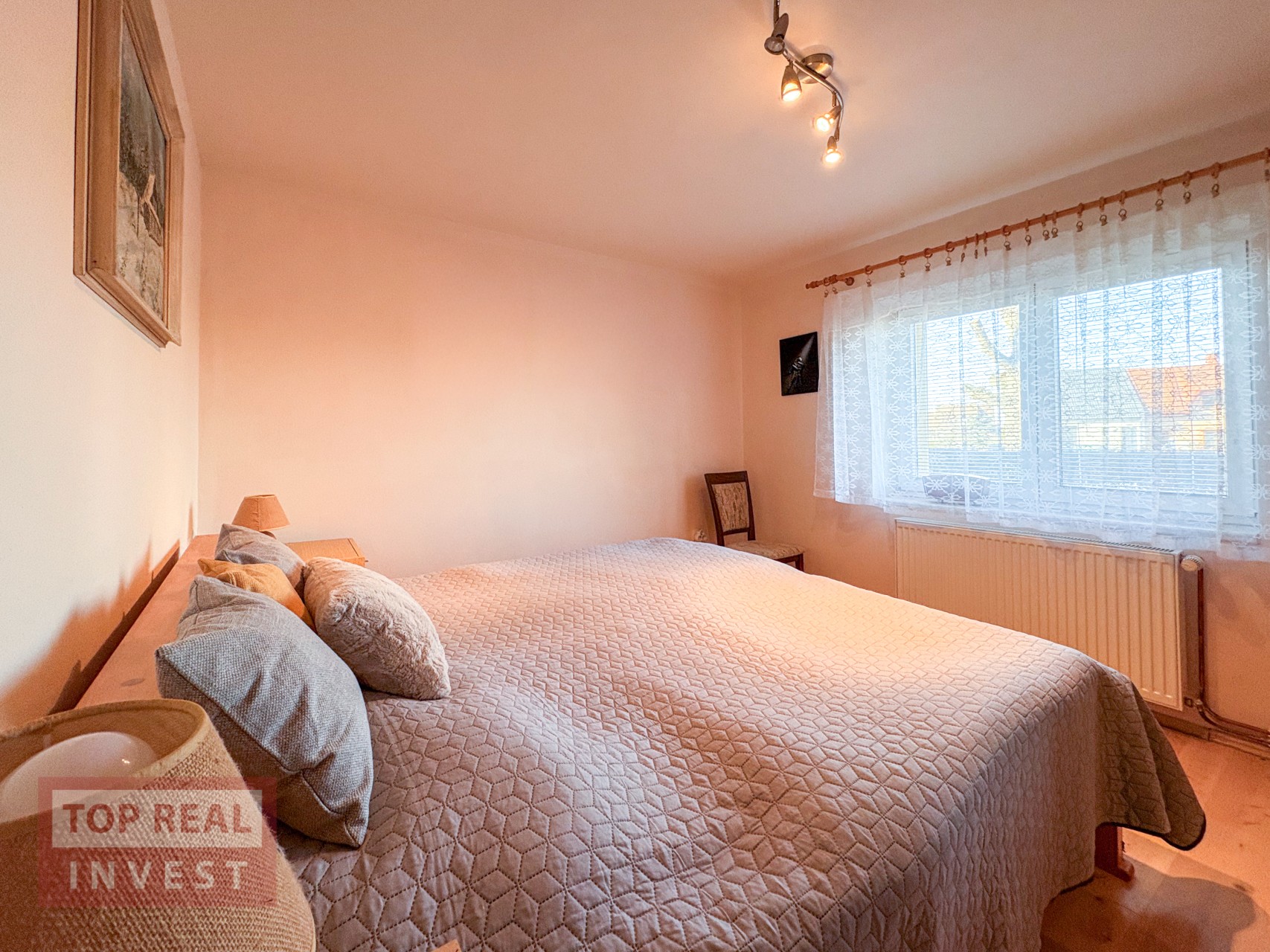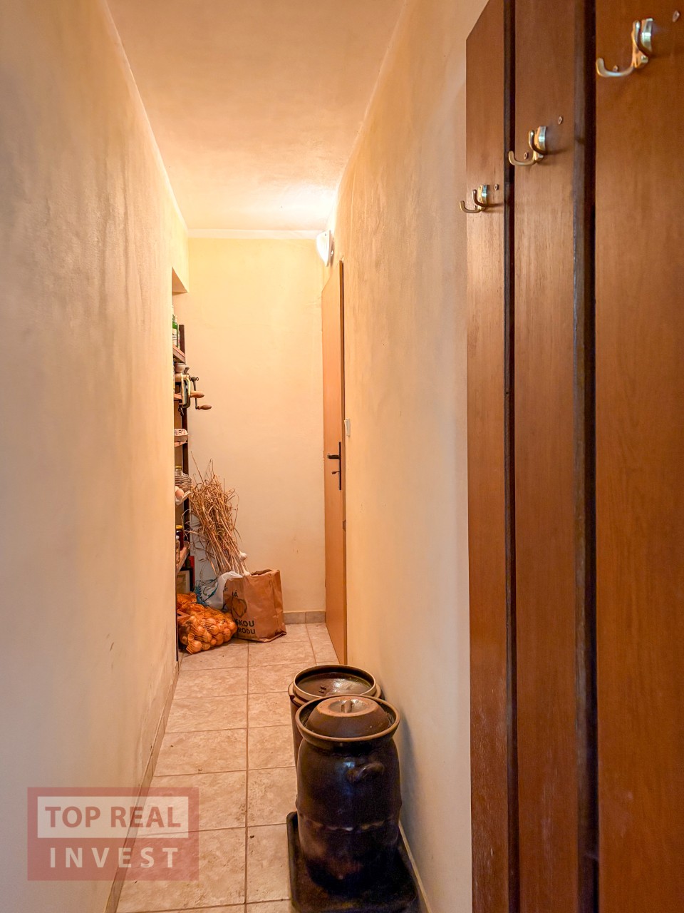 Obytná část domu v přední části je propojena dlouhou vstupní chodbou, ze které se dostanete jak na zahradu za domem, tak do všech místností – ložnice, prostorné koupelny s vanou i sprchovým koutem, propojené s WC, dále do šatny, kuchyně a sklepa. V koupelně je připraven prostor pro pračku, ohřev vody i vytápění zajišťuje plynový kotel, s možností doplnění bojleru v koupelně.
