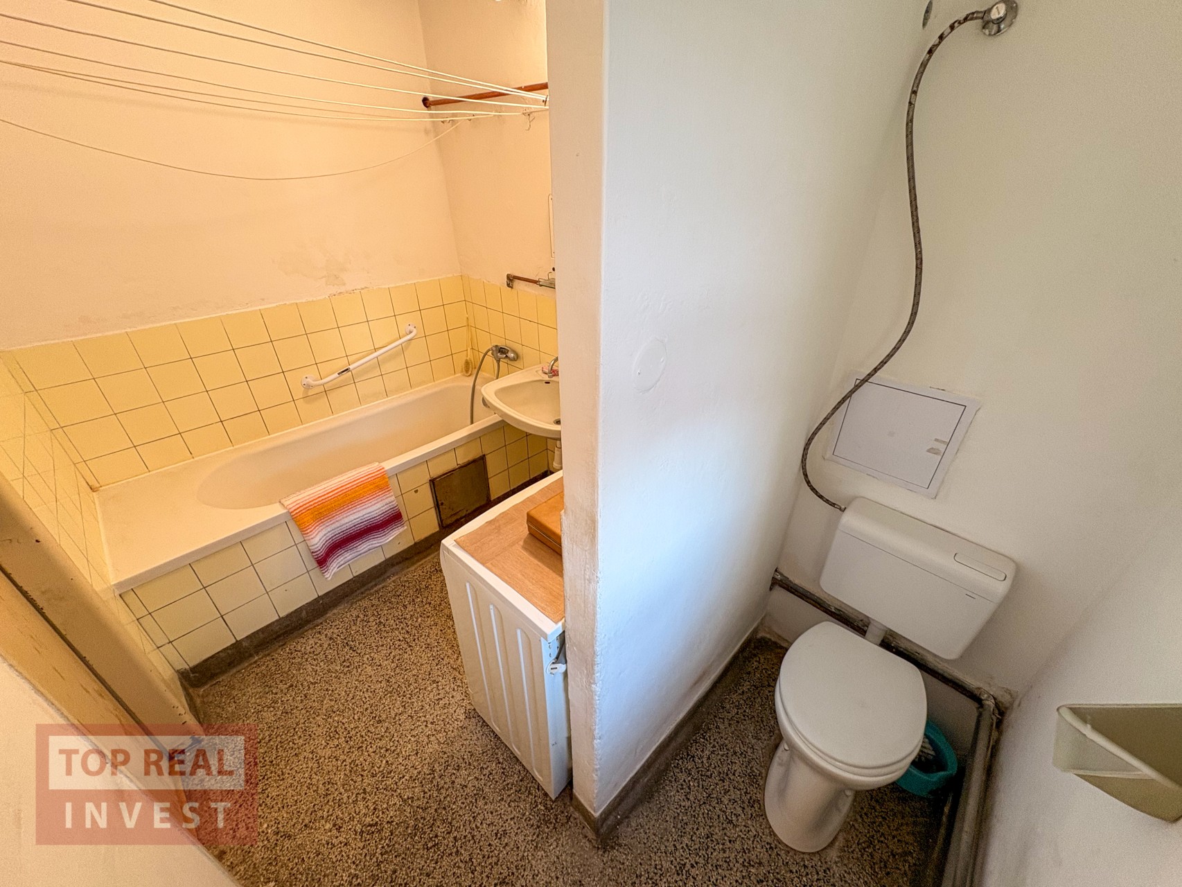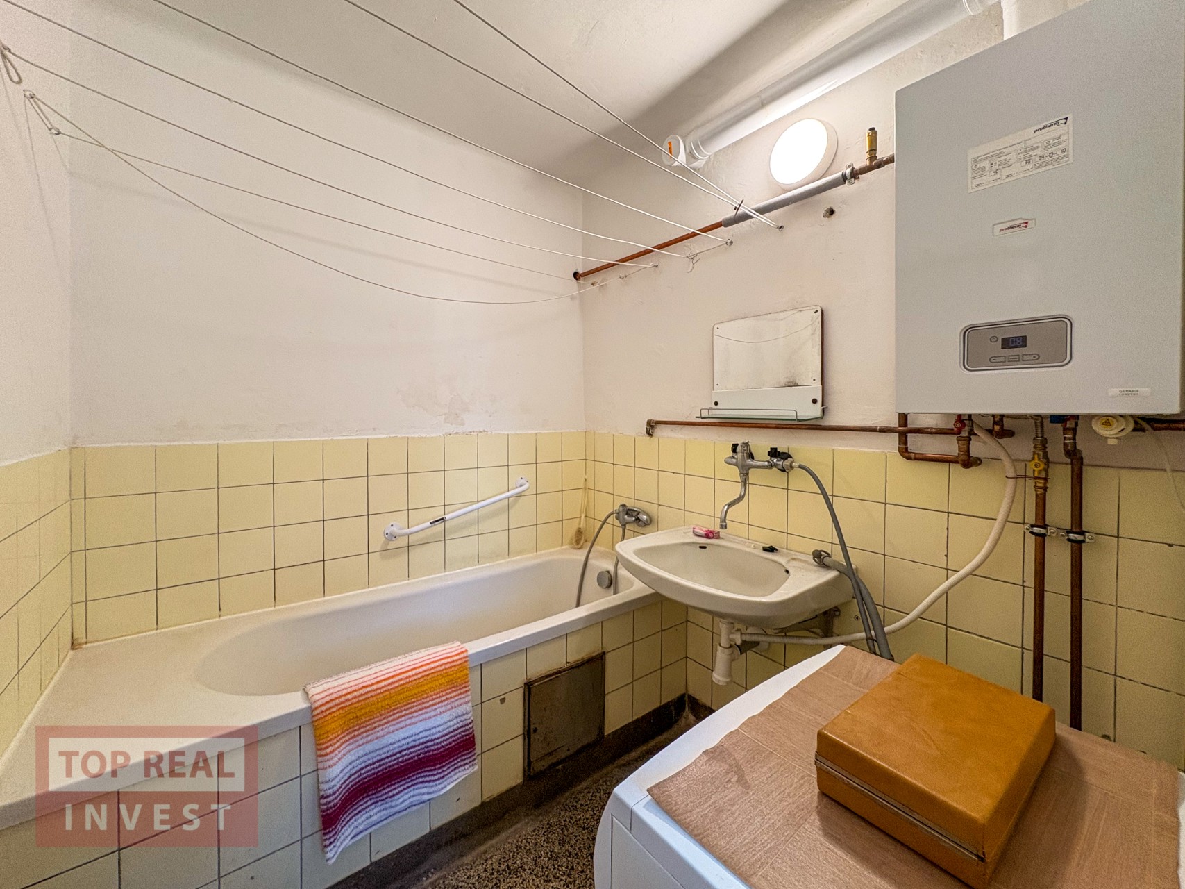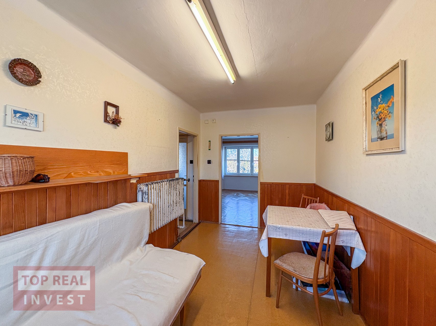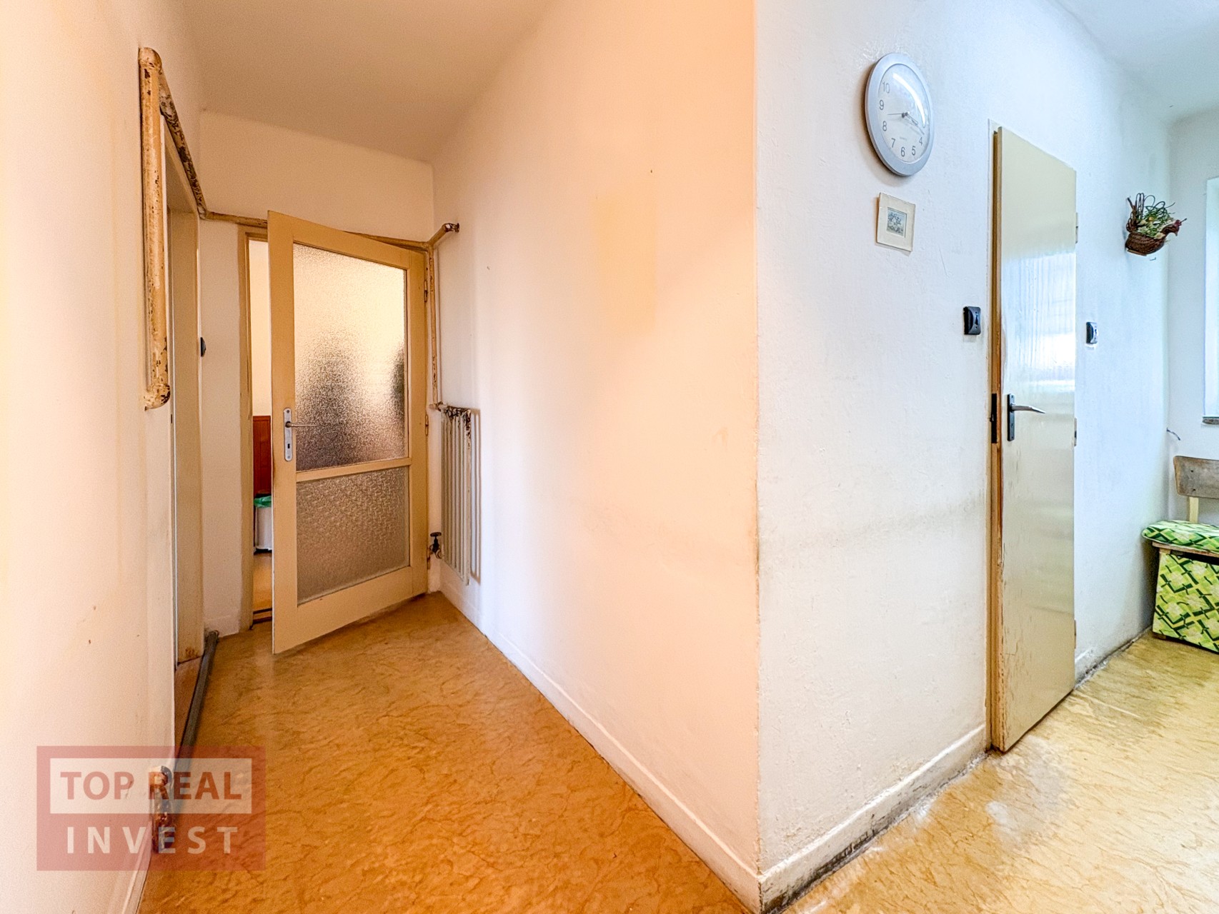 Dominantou bytu je nejprostornější obývací pokoj, ze kterého je příjemný výhled na ZŠ Slovan. Z obývacího pokoje se dále vstupuje do ložnic i chodby, což nabízí praktické a logické dispoziční řešení. Na chodbě byl vybudován kuchyňský kout a je zde také vstup do prostorné koupelny, která disponuje vanou, umyvadlem, místem pro pračku i plynovým kotlem, zajišťujícím vytápění bytu a ohřev vody. Koupelna je spojena s WC, které je odděleno cihlovou přepážkou, a velkým benefitem je větratelné okno.