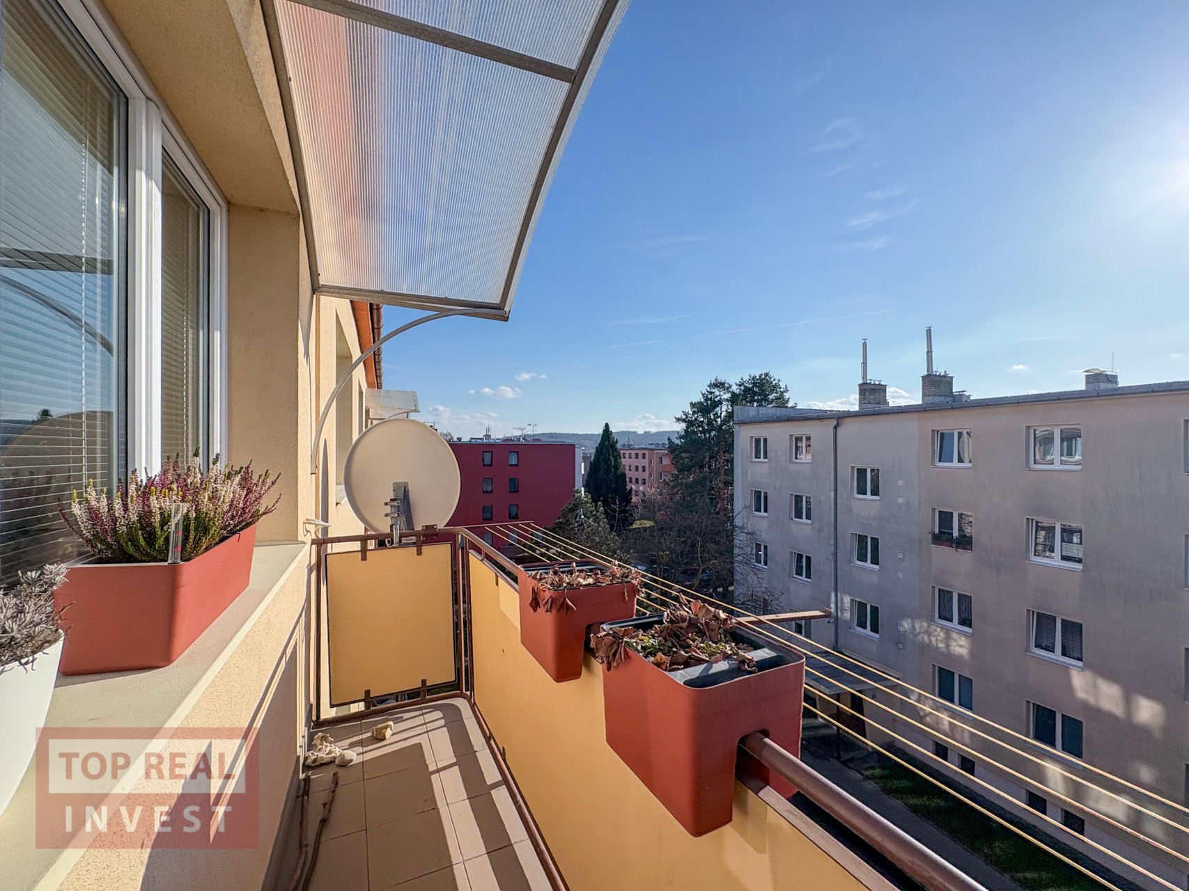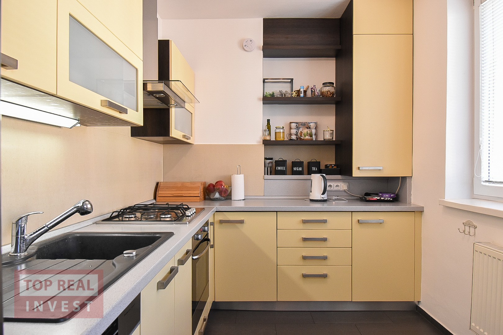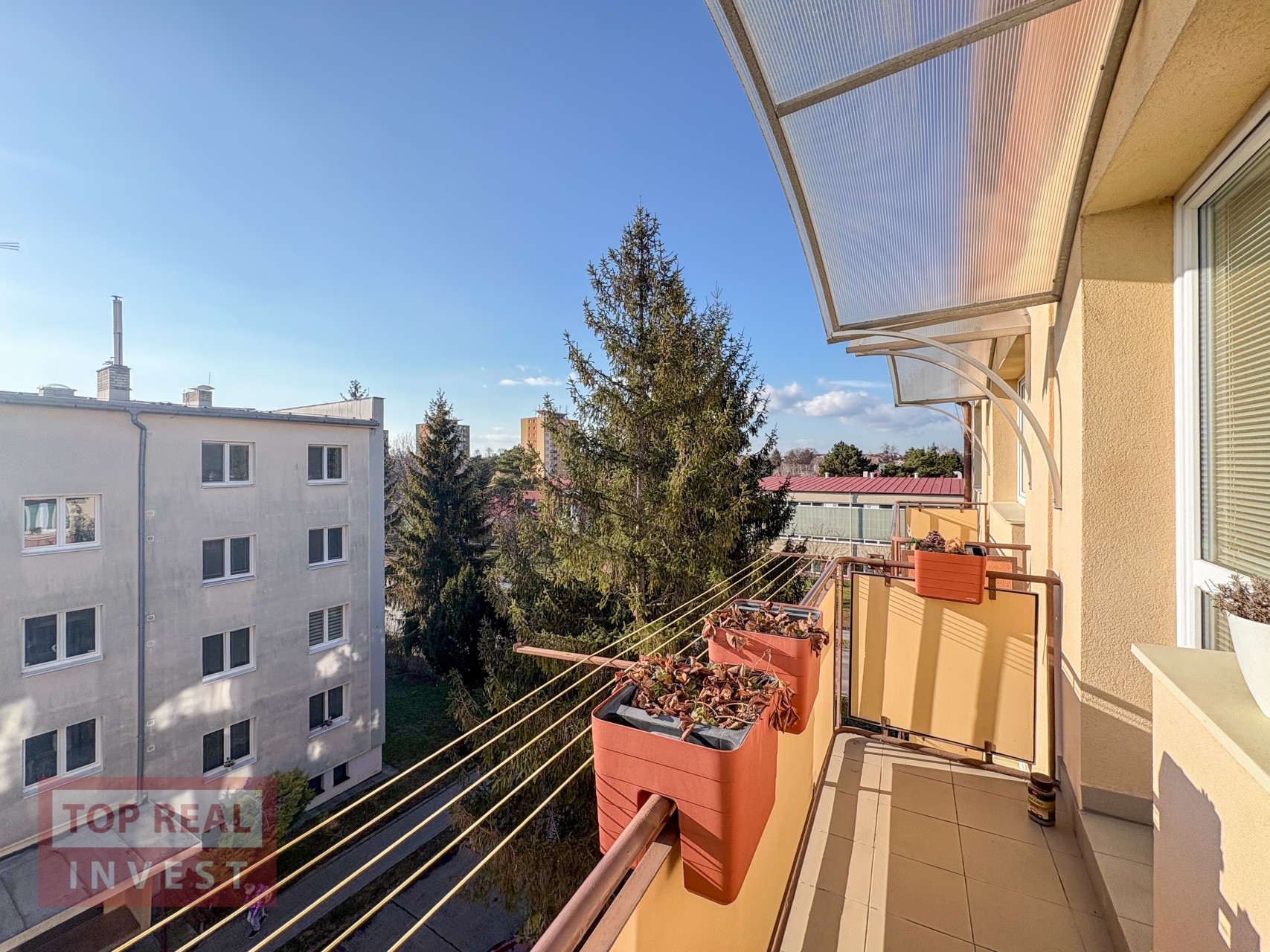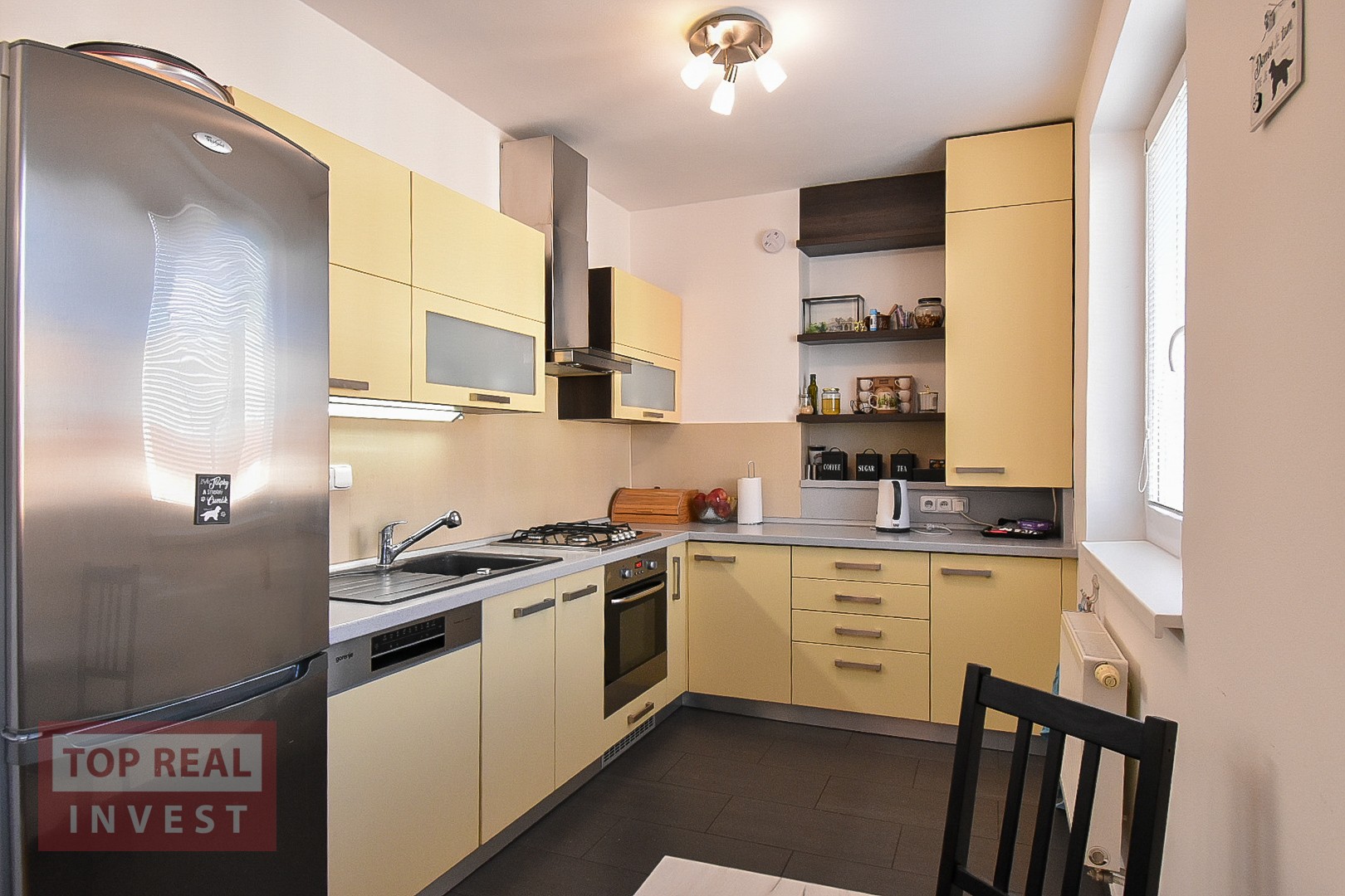 Byt nabízí užitnou plochu 72 m² včetně příslušenství a zaujme především svou praktickou dispozicí a dostatkem úložného prostoru. Dominantou bytu je obývací pokoj propojený s kuchyňským koutem, odkud je přístup do dalších neprůchozích pokojů.
