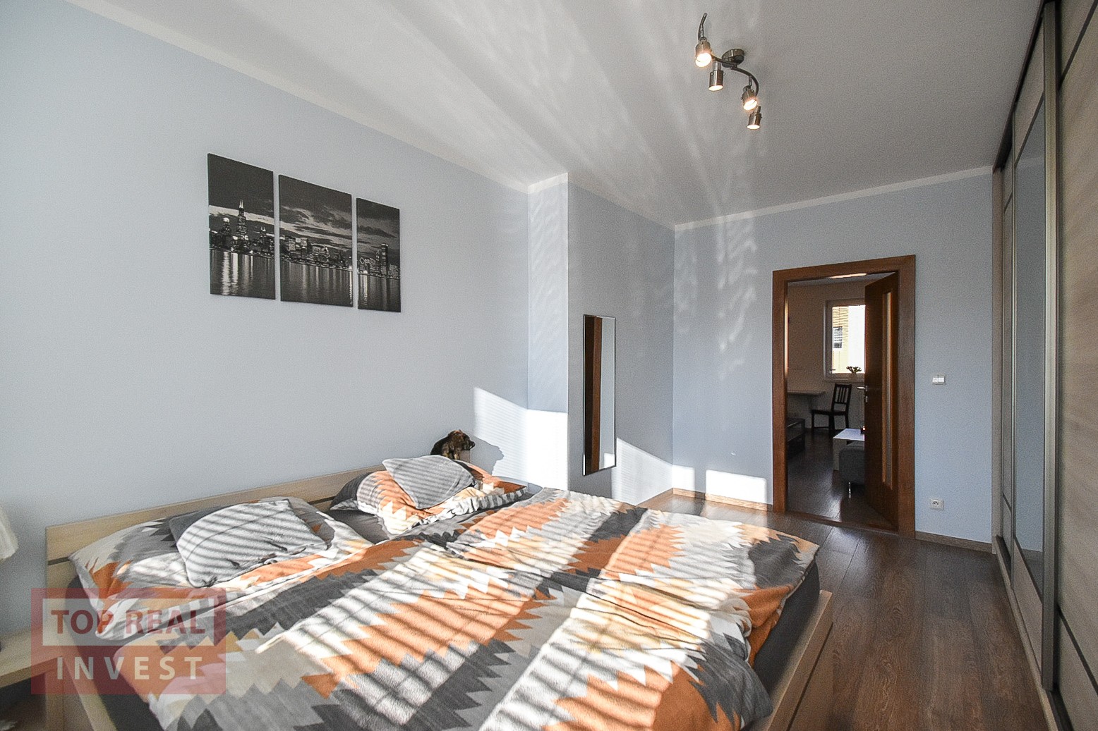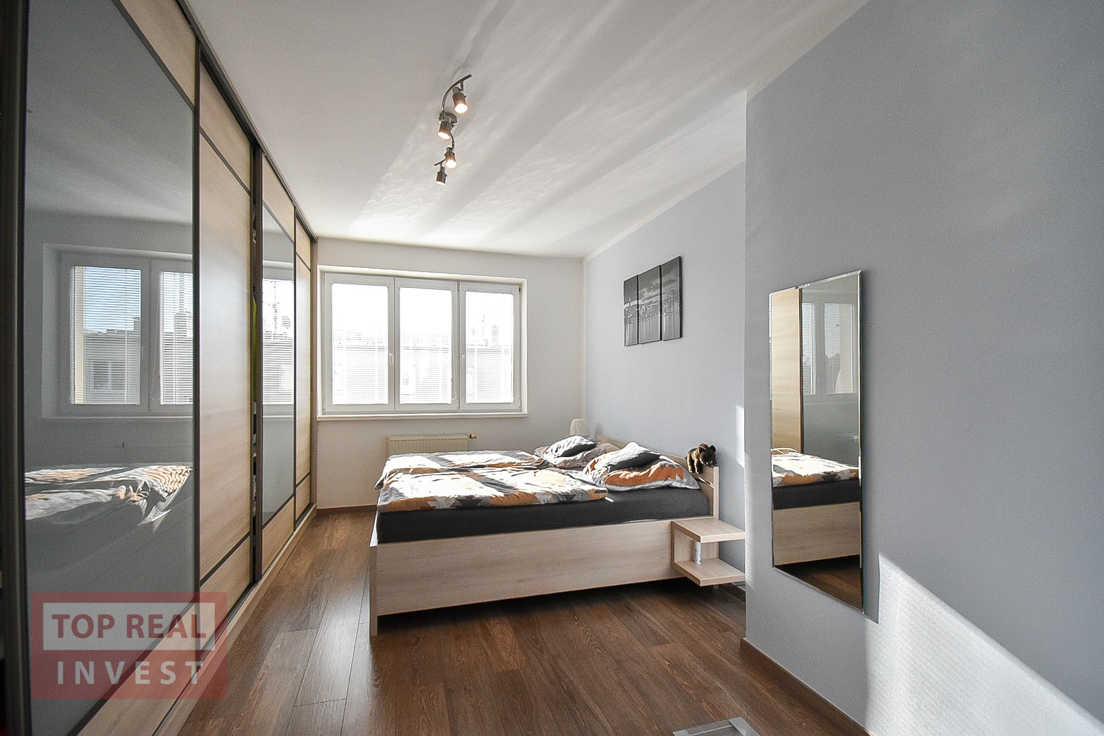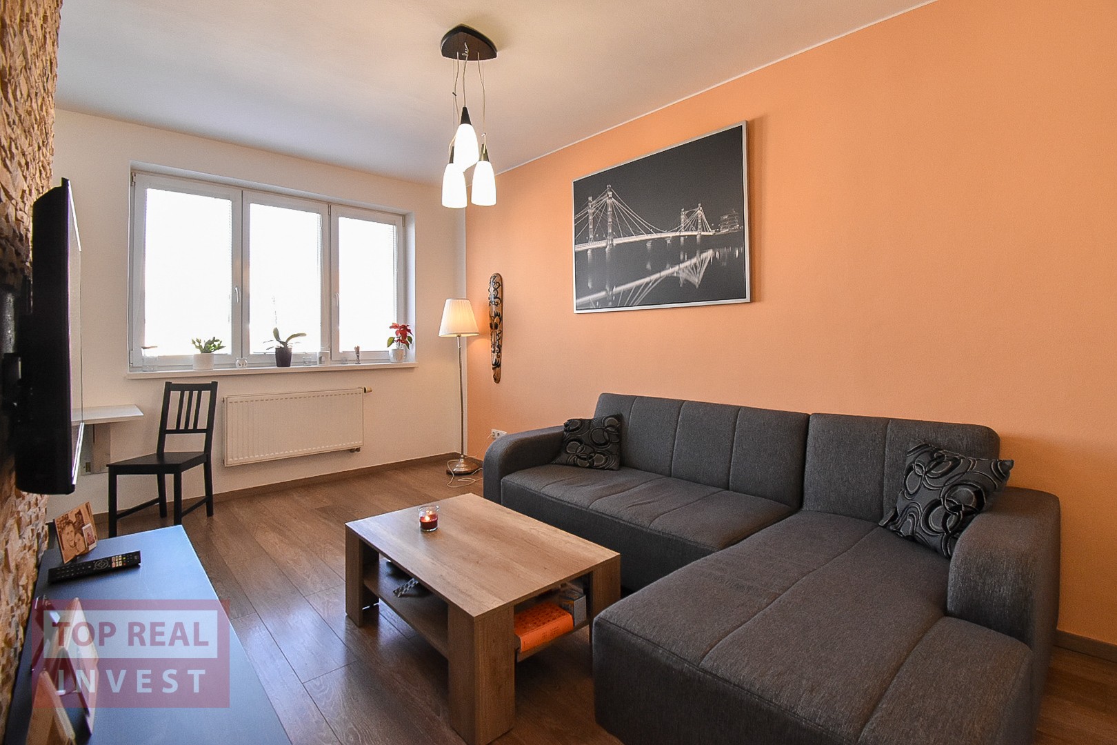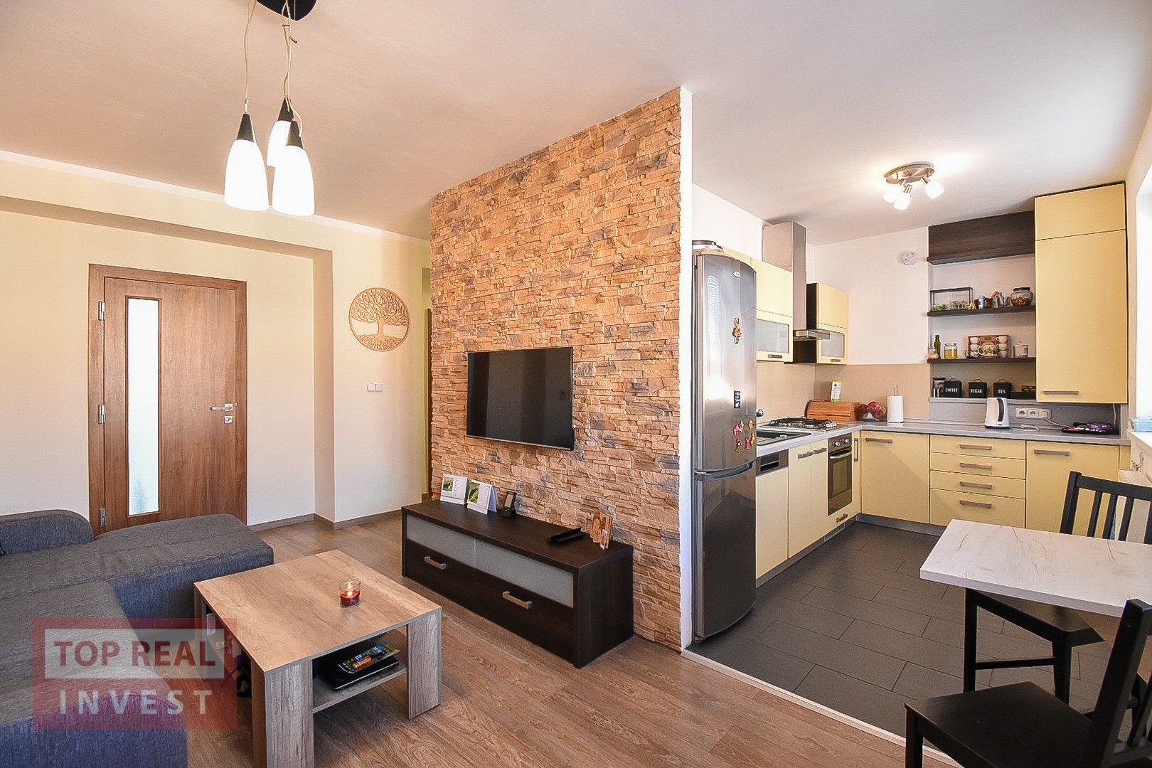 Byt nabízí užitnou plochu 72 m² včetně příslušenství a zaujme především svou praktickou dispozicí a dostatkem úložného prostoru. Dominantou bytu je obývací pokoj propojený s kuchyňským koutem, odkud je přístup do dalších neprůchozích pokojů.