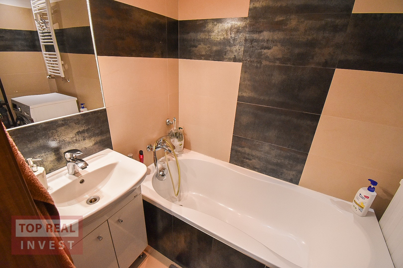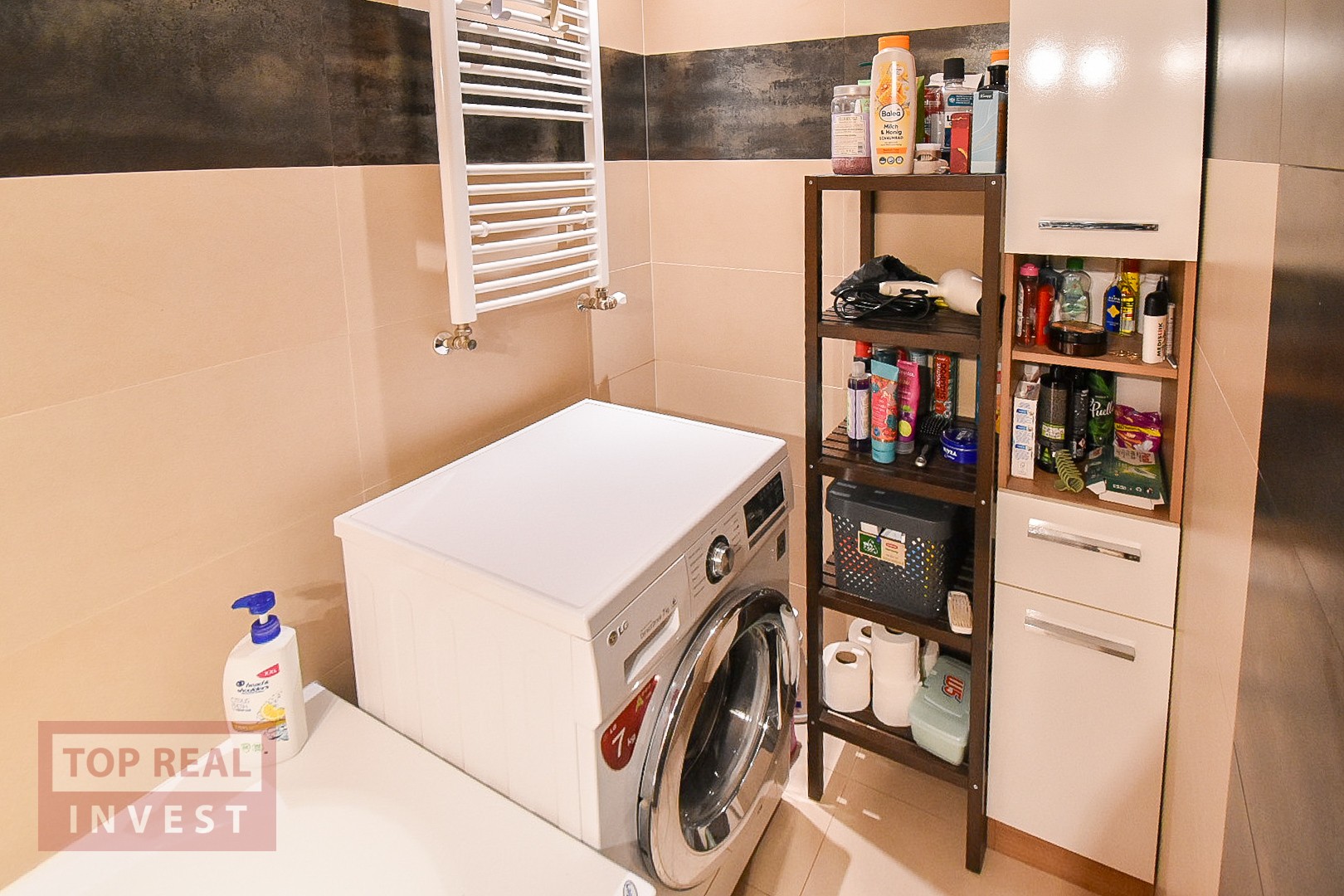 Kuchyň je vybavena elektrickou troubou, plynovou varnou deskou a myčkou nádobí. V koupelně se nachází vana a prostor pro pračku.