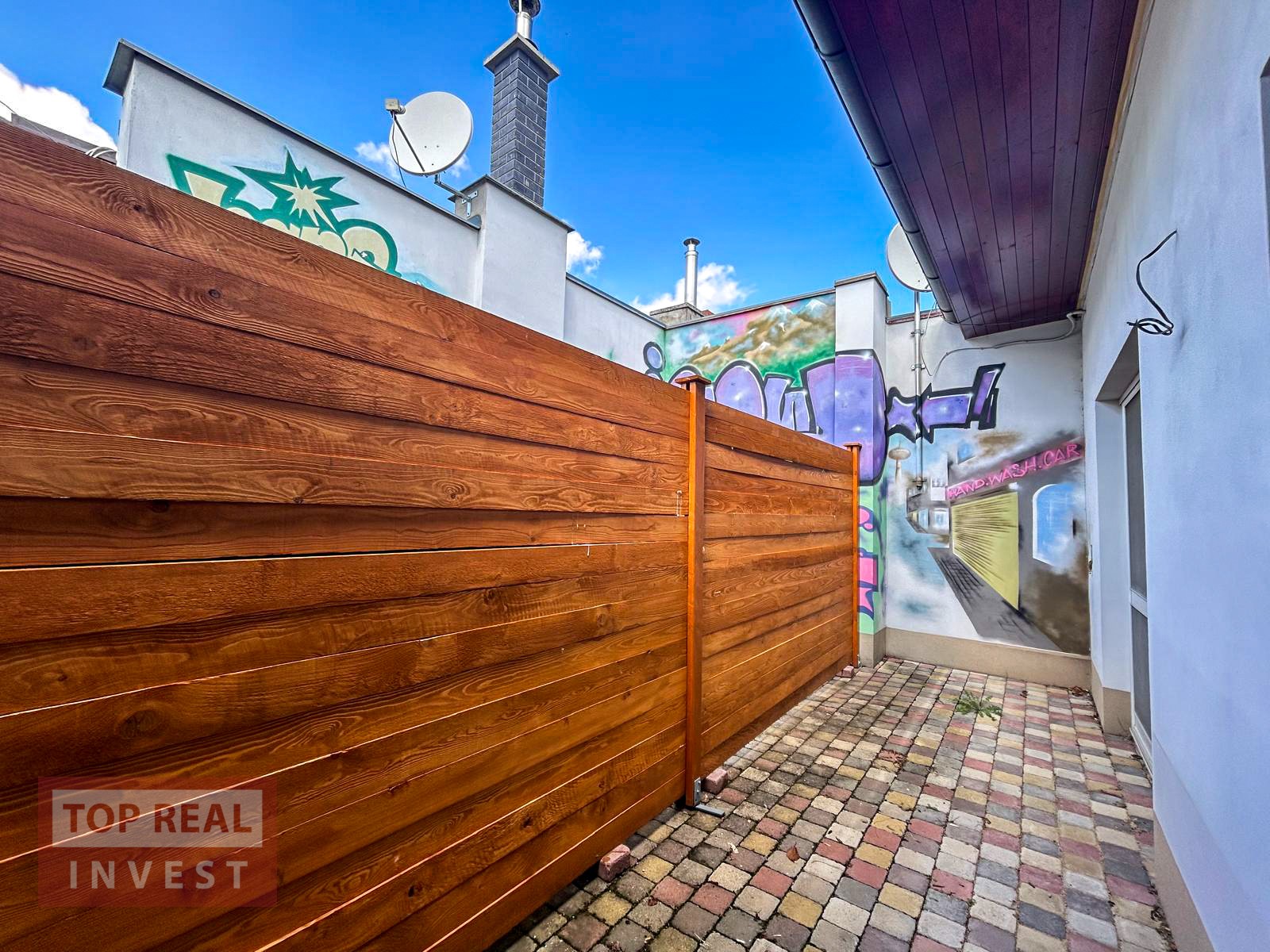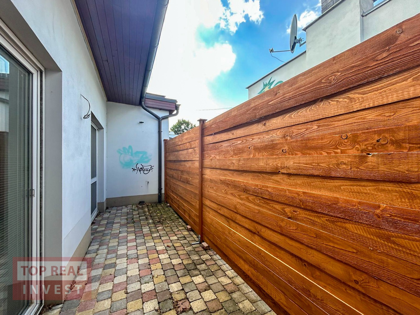 Pokoje jsou neprůchozí, každý se vstupem na malý dvůr o výměře 13m2, který patří k domu. Přístup na pozemek je řešen elegantními posuvnými okny, která dodávají pokojům světlost a propojení s venkovním prostorem. Koupelna je prostorná, vybavená vanou, sprchovým koutem a místem pro pračku. Světlo do koupelny přivádí střešní okno, které dodává prostoru příjemnou atmosféru. Naproti koupelny je samostatné WC a praktická technická místnost.