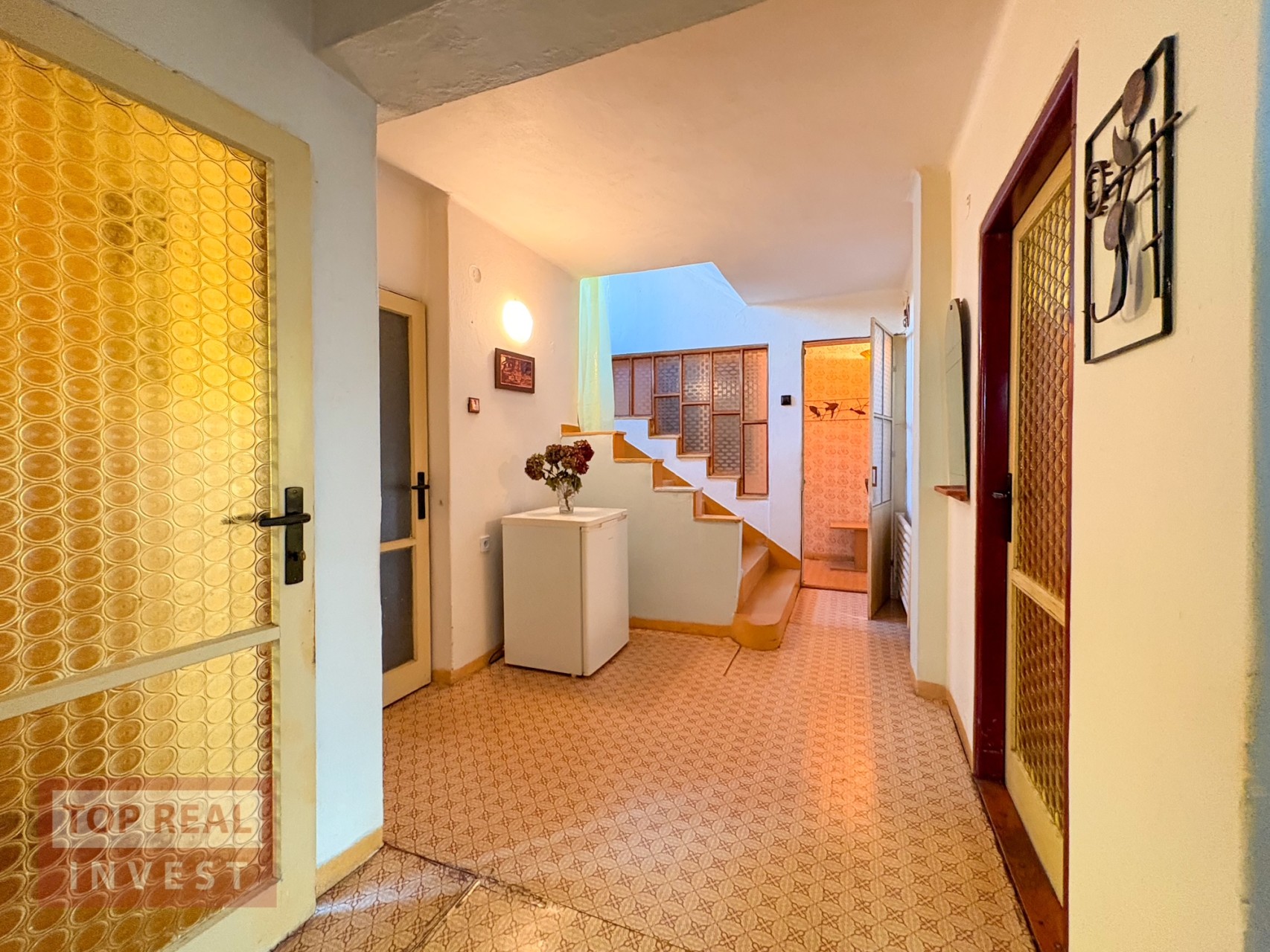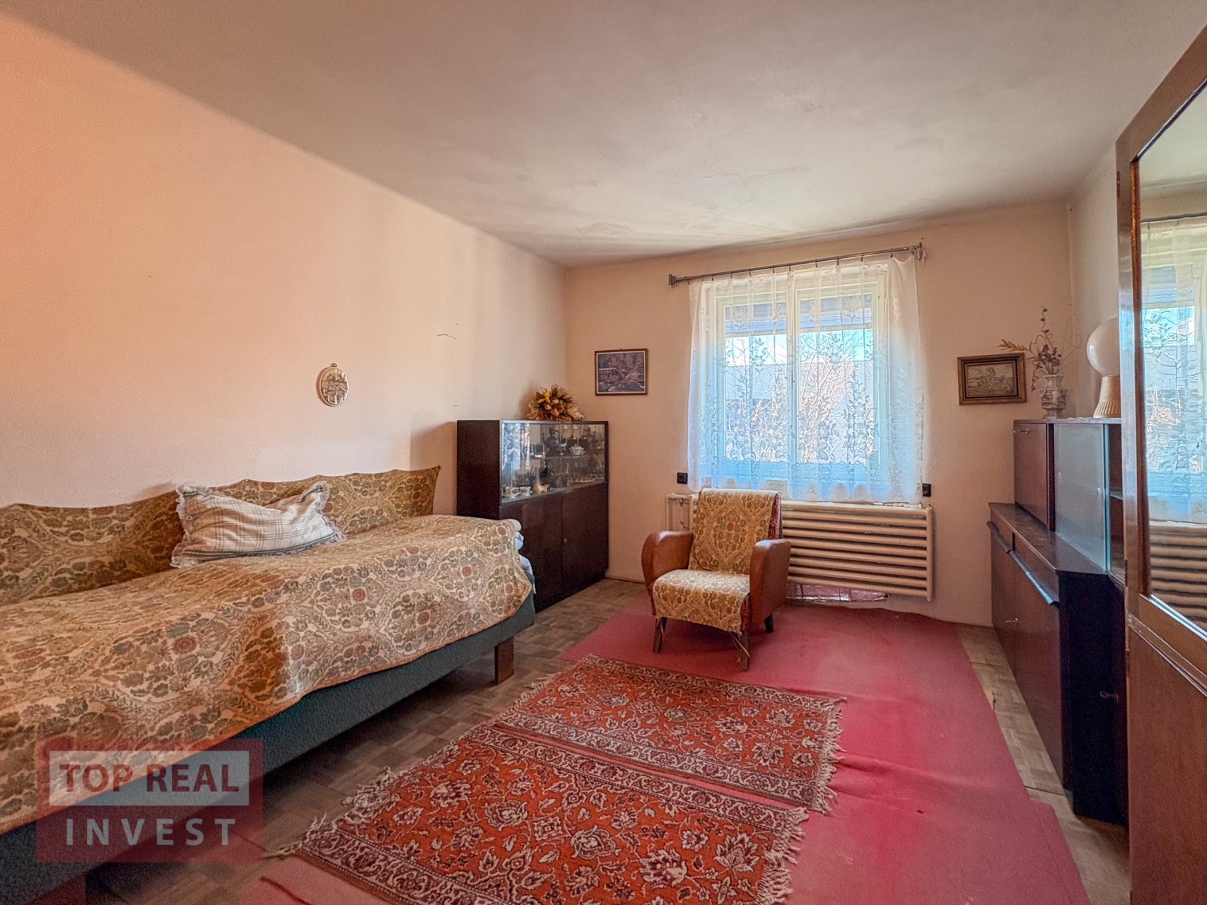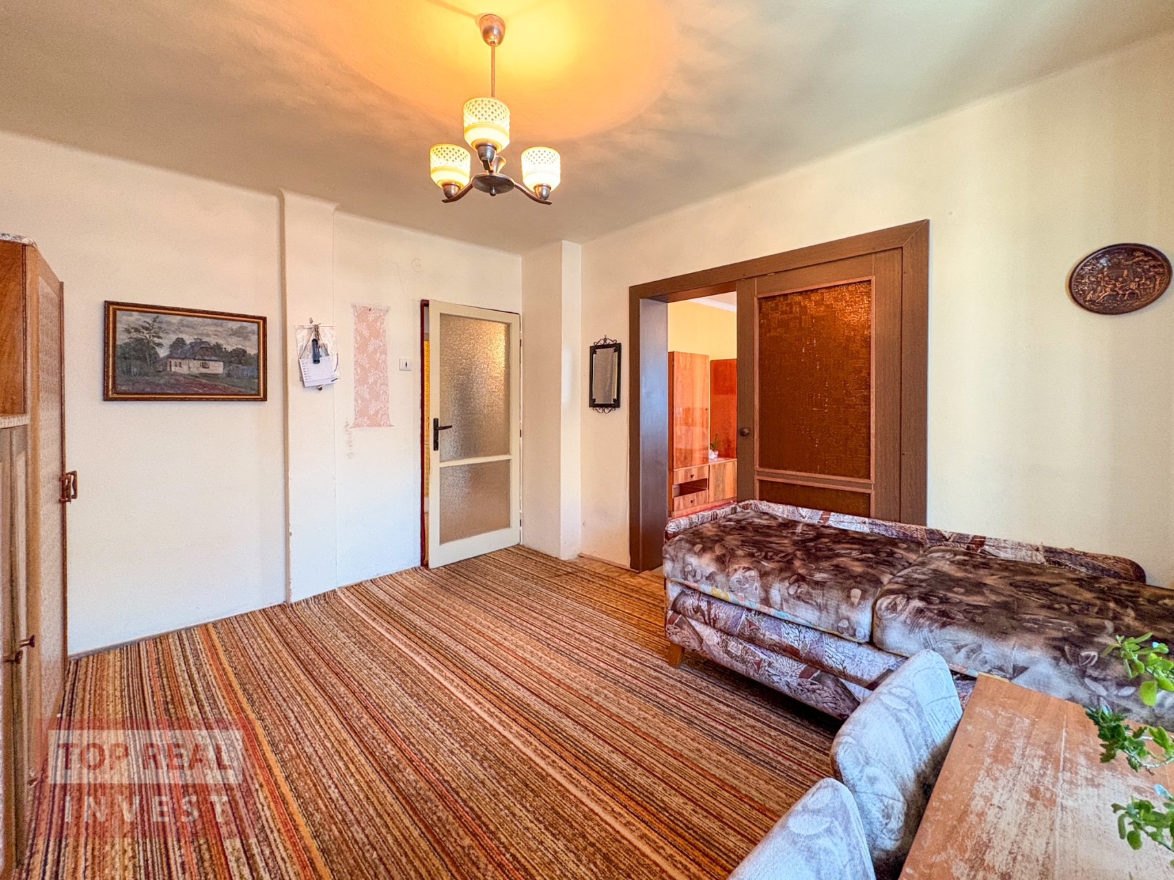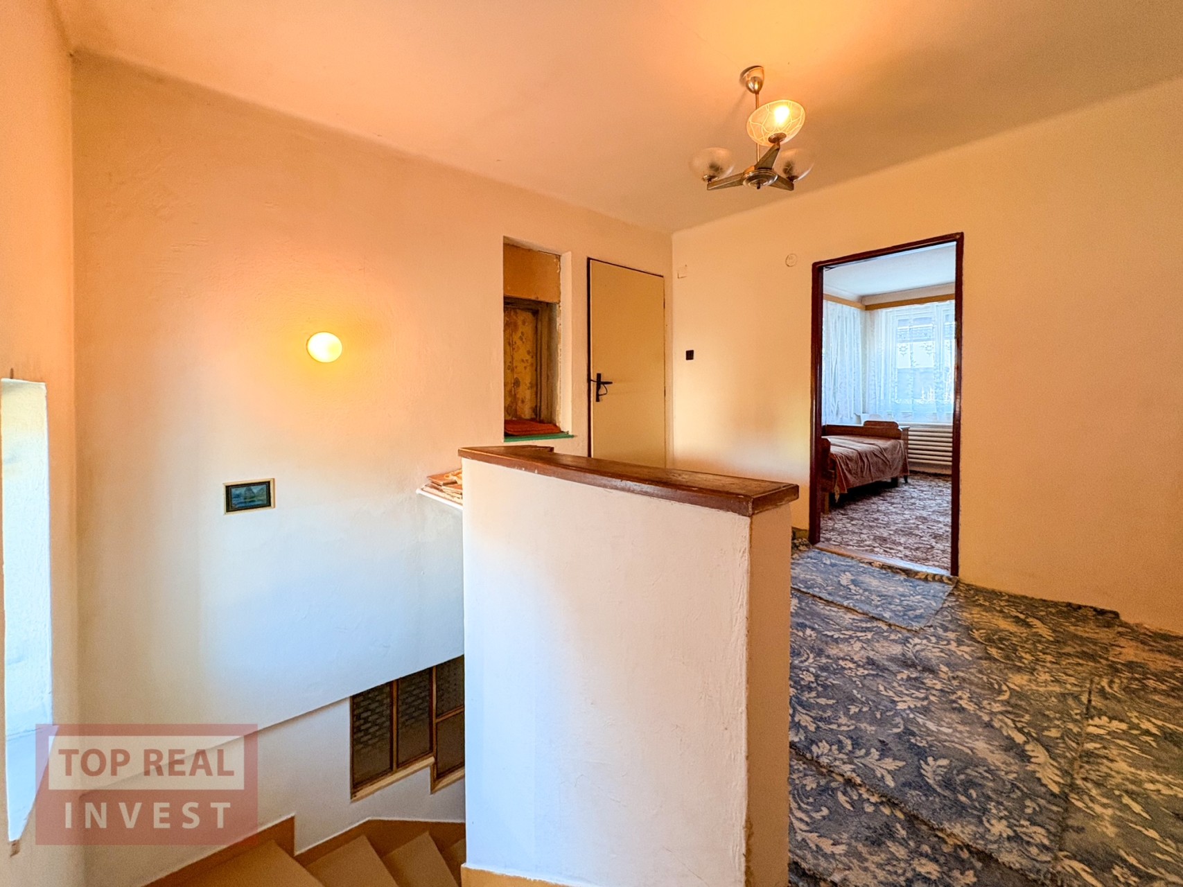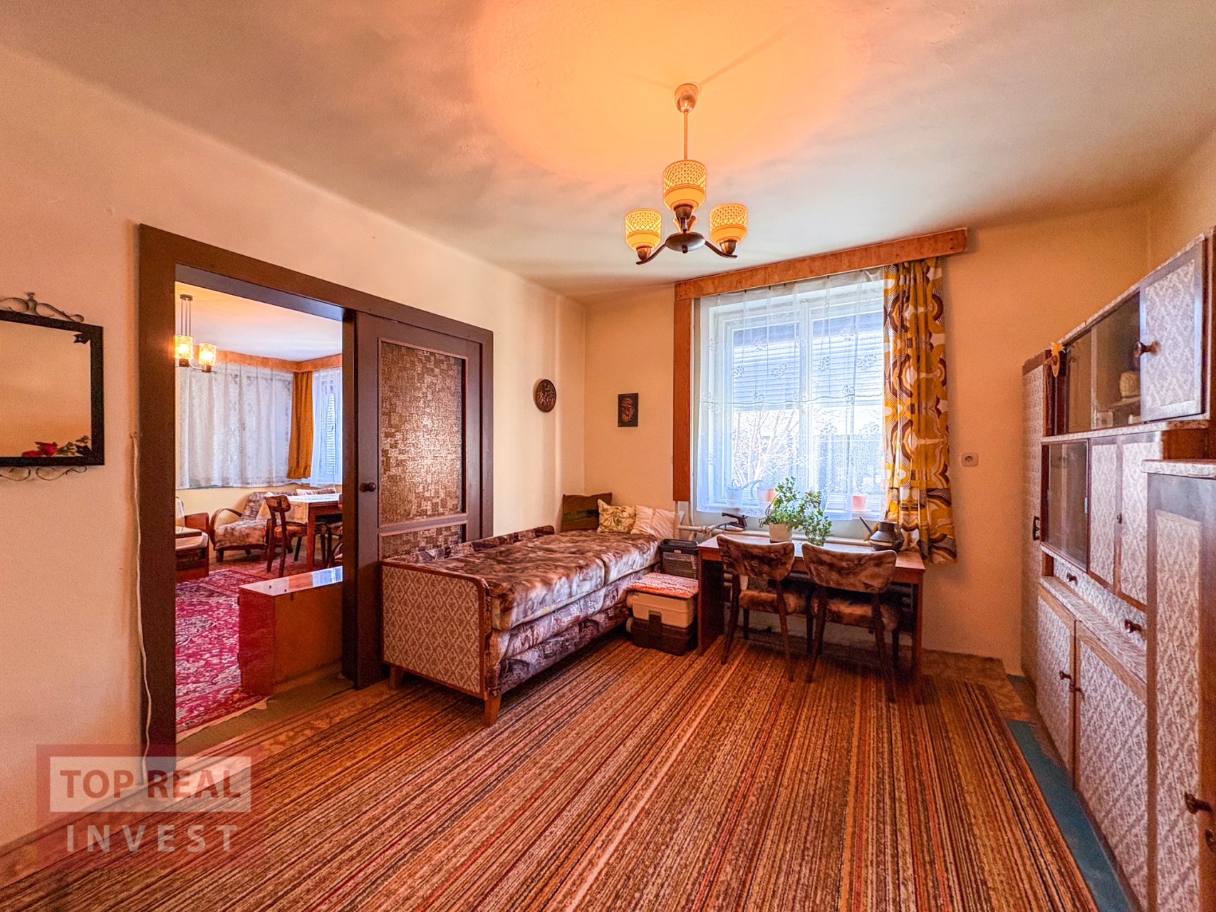 • prostorný obývací pokoj, samostatný pokoj (ideální jako pracovna či pokoj pro hosty nebo jídelna), kuchyně se spíží, koupelna propojená s WC (vana upravená na sprchový kout), zimní zahrada s krbem a vstupem na balkón s výhledem do zahrady