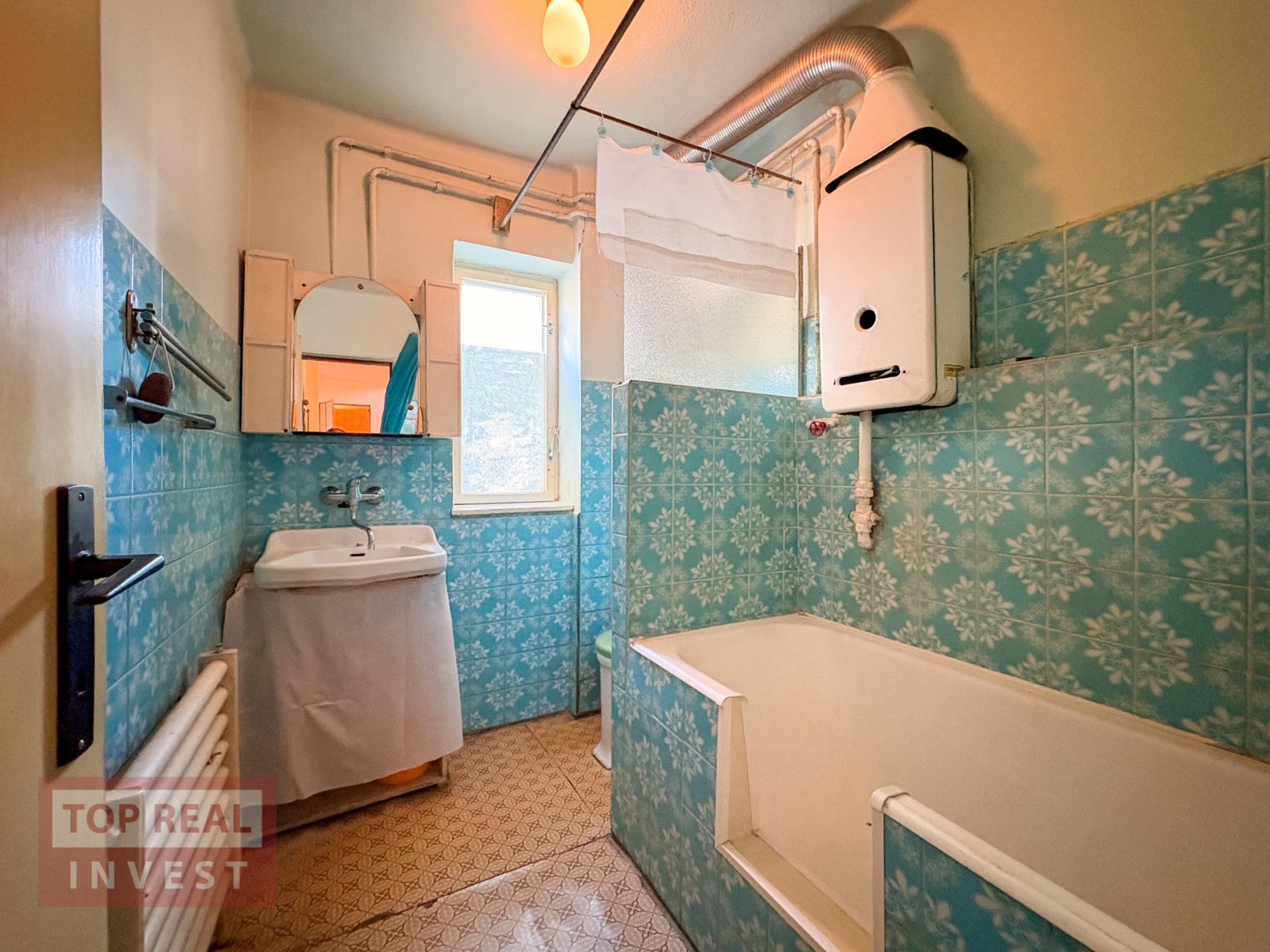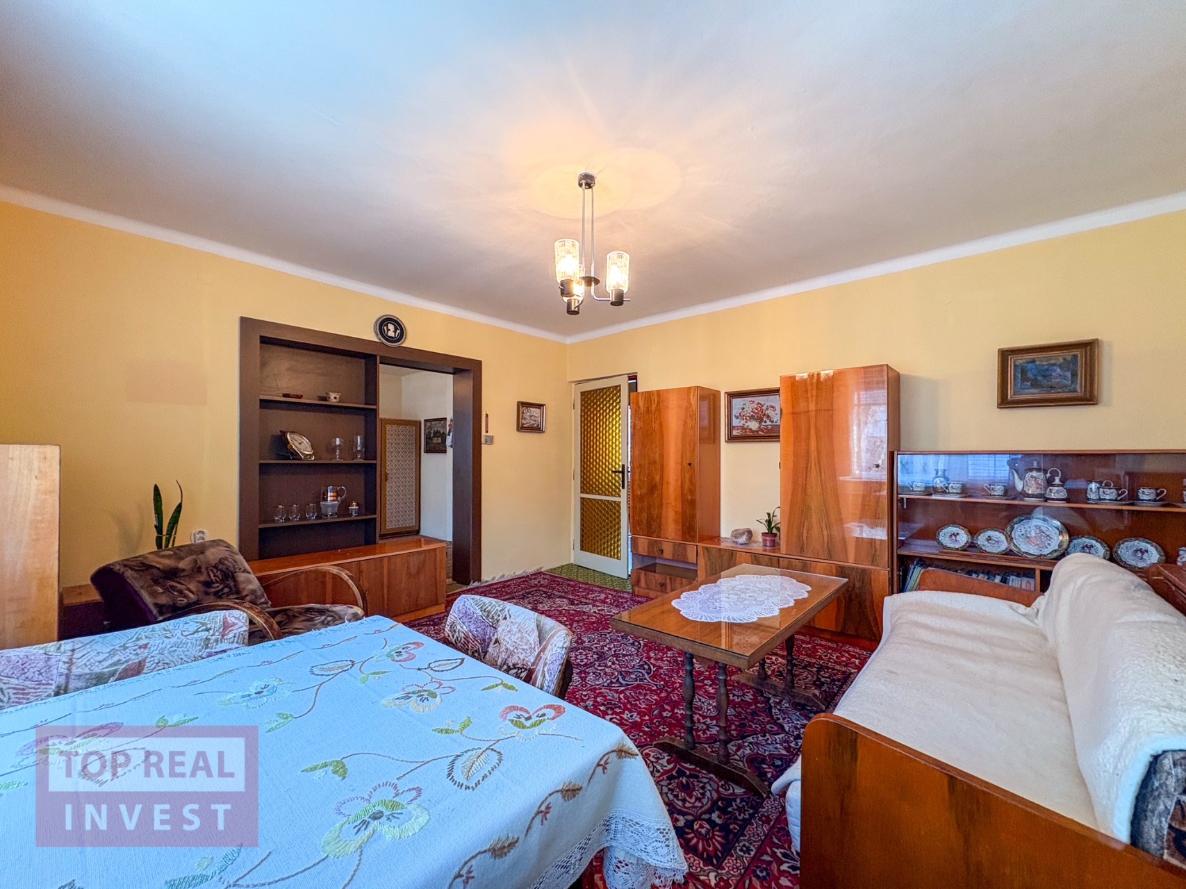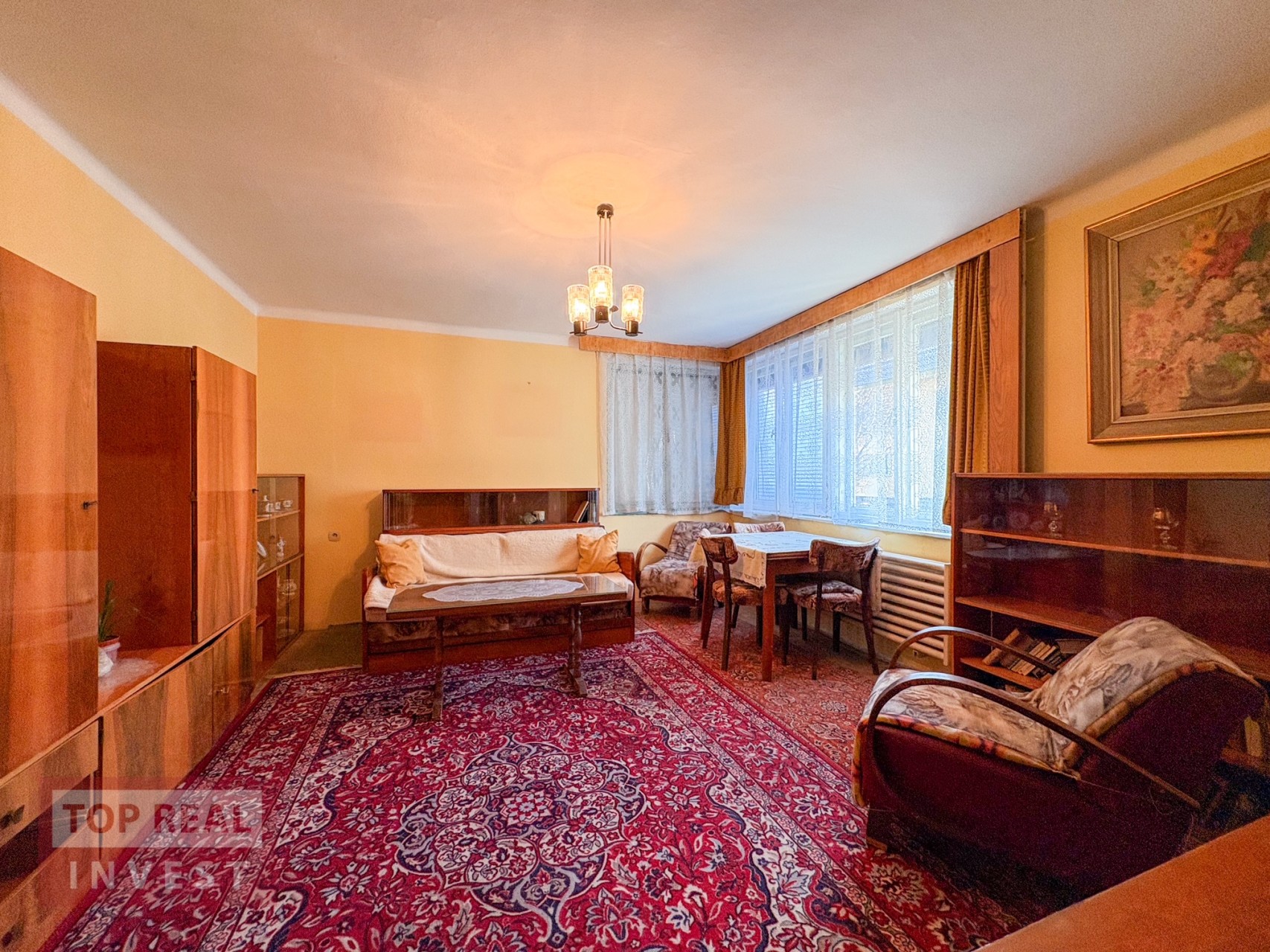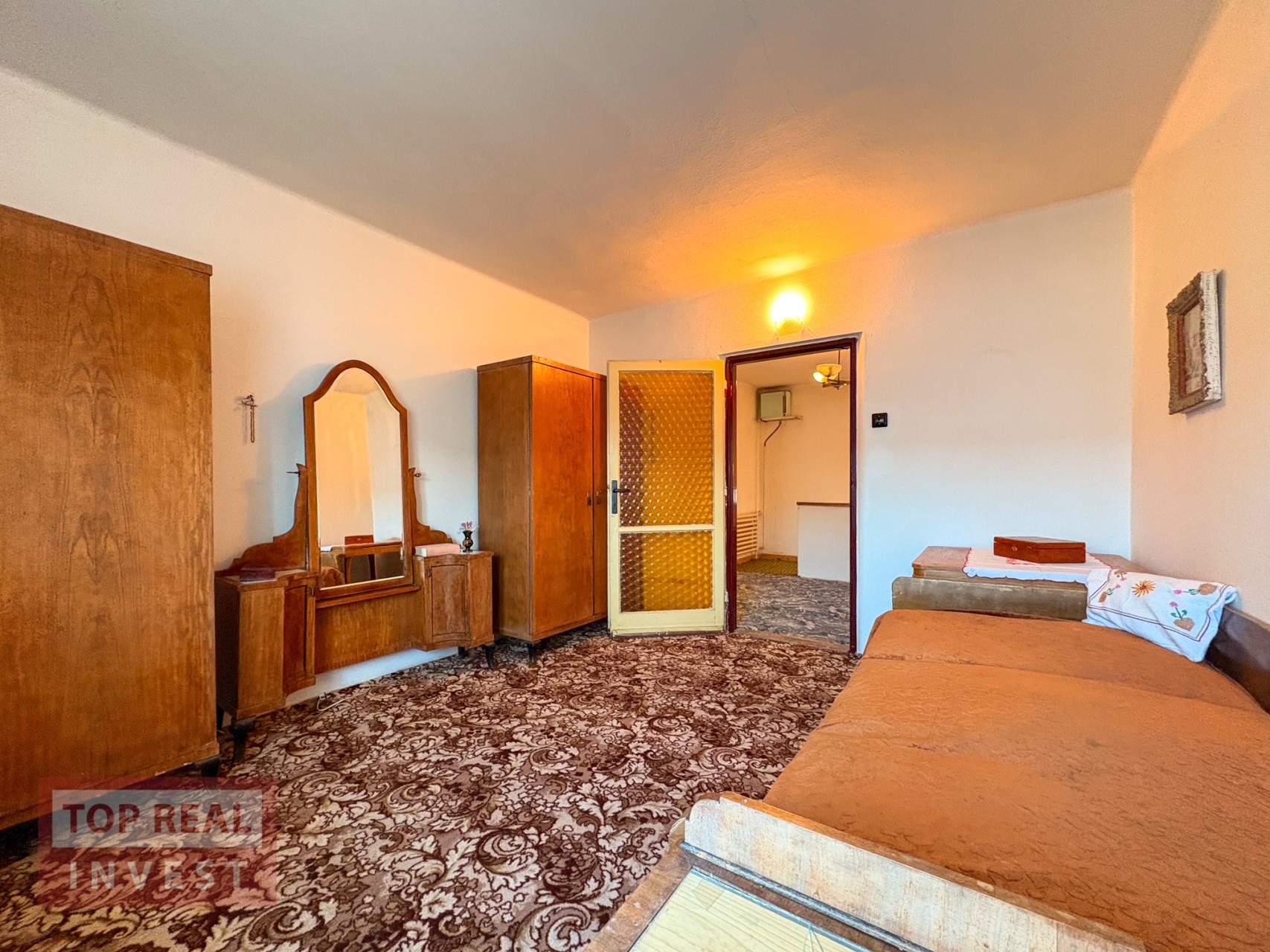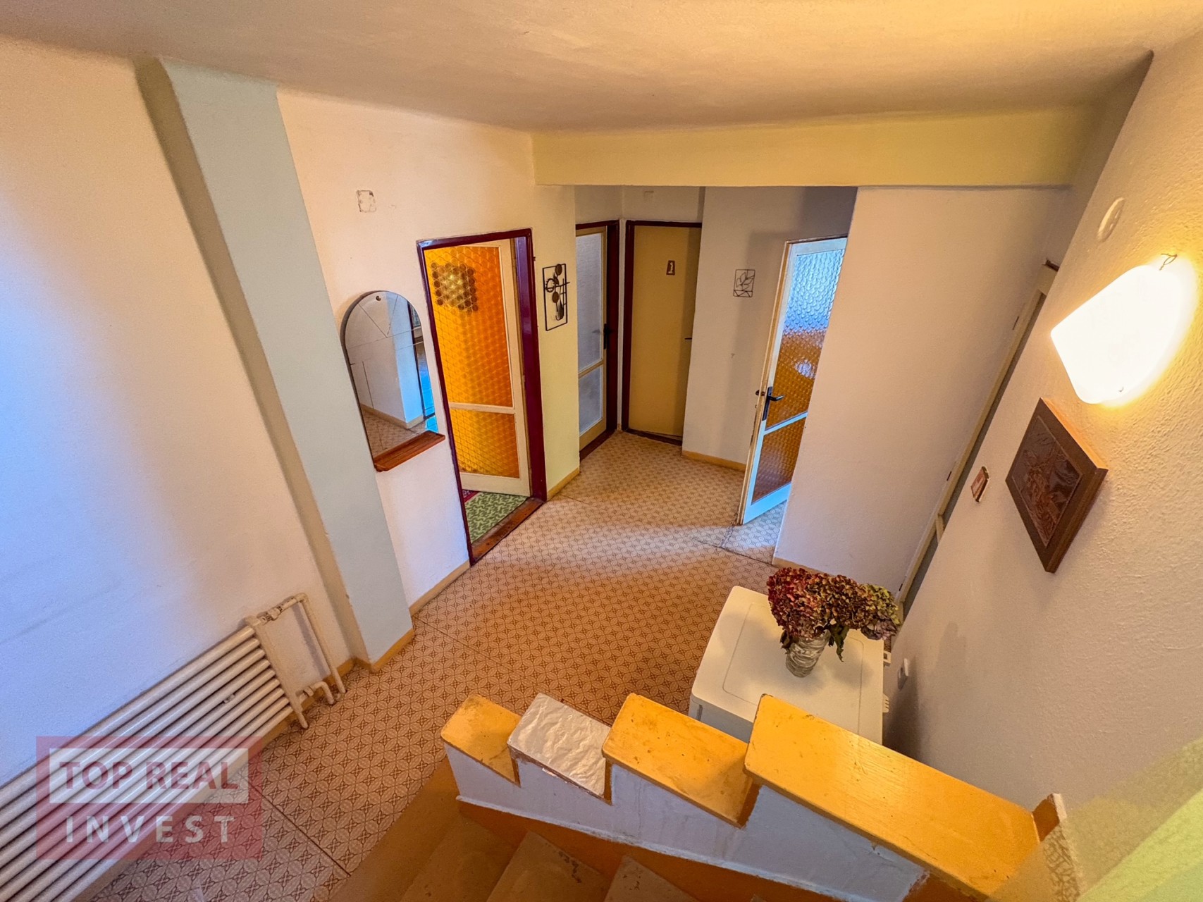 • prostorný obývací pokoj, samostatný pokoj (ideální jako pracovna či pokoj pro hosty nebo jídelna), kuchyně se spíží, koupelna propojená s WC (vana upravená na sprchový kout), zimní zahrada s krbem a vstupem na balkón s výhledem do zahrady