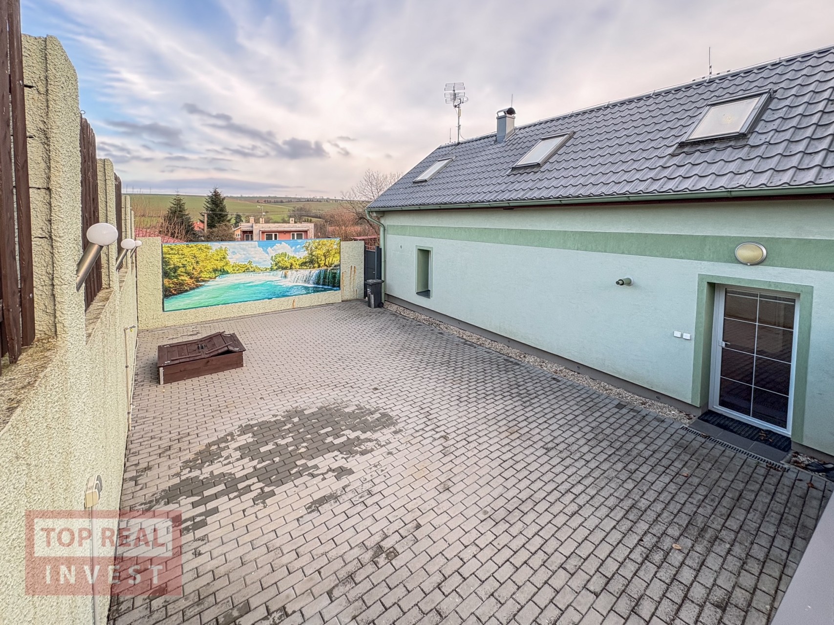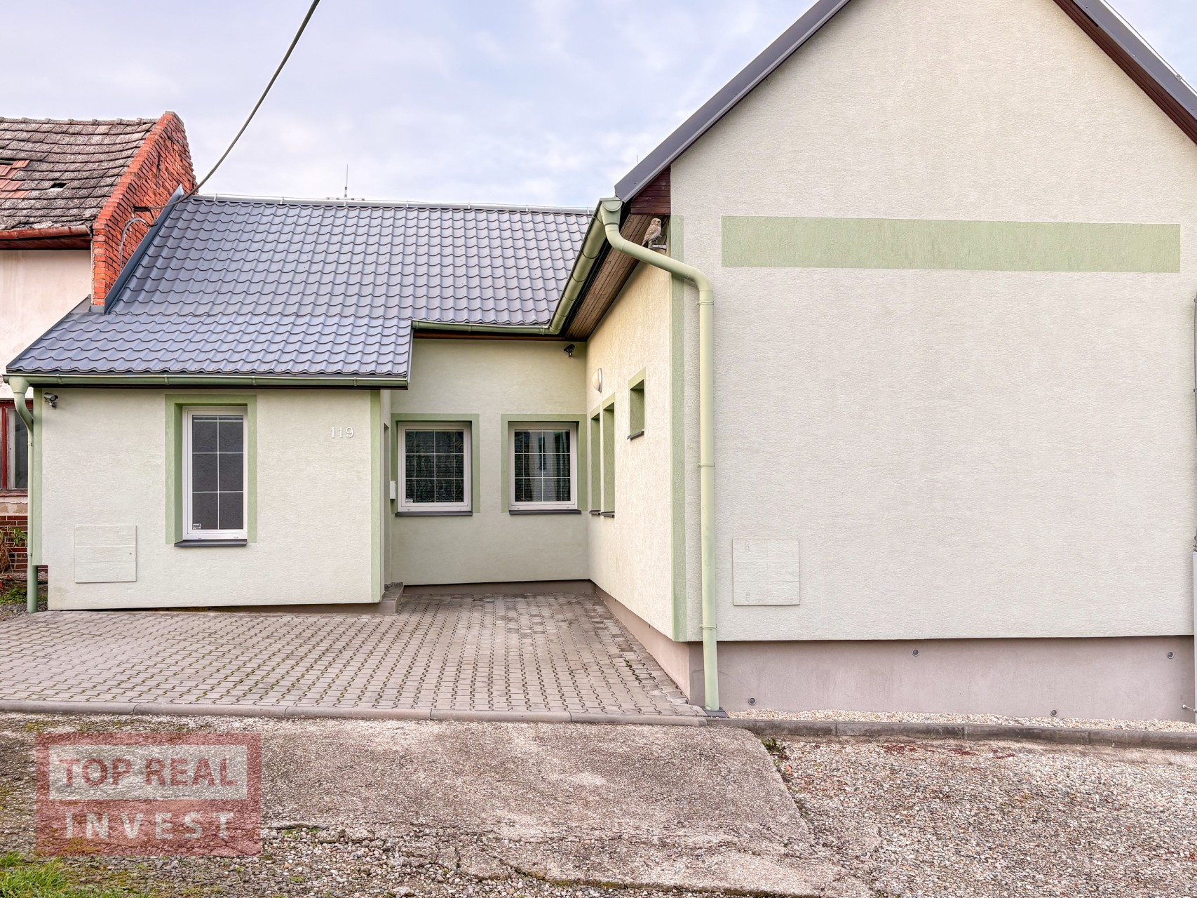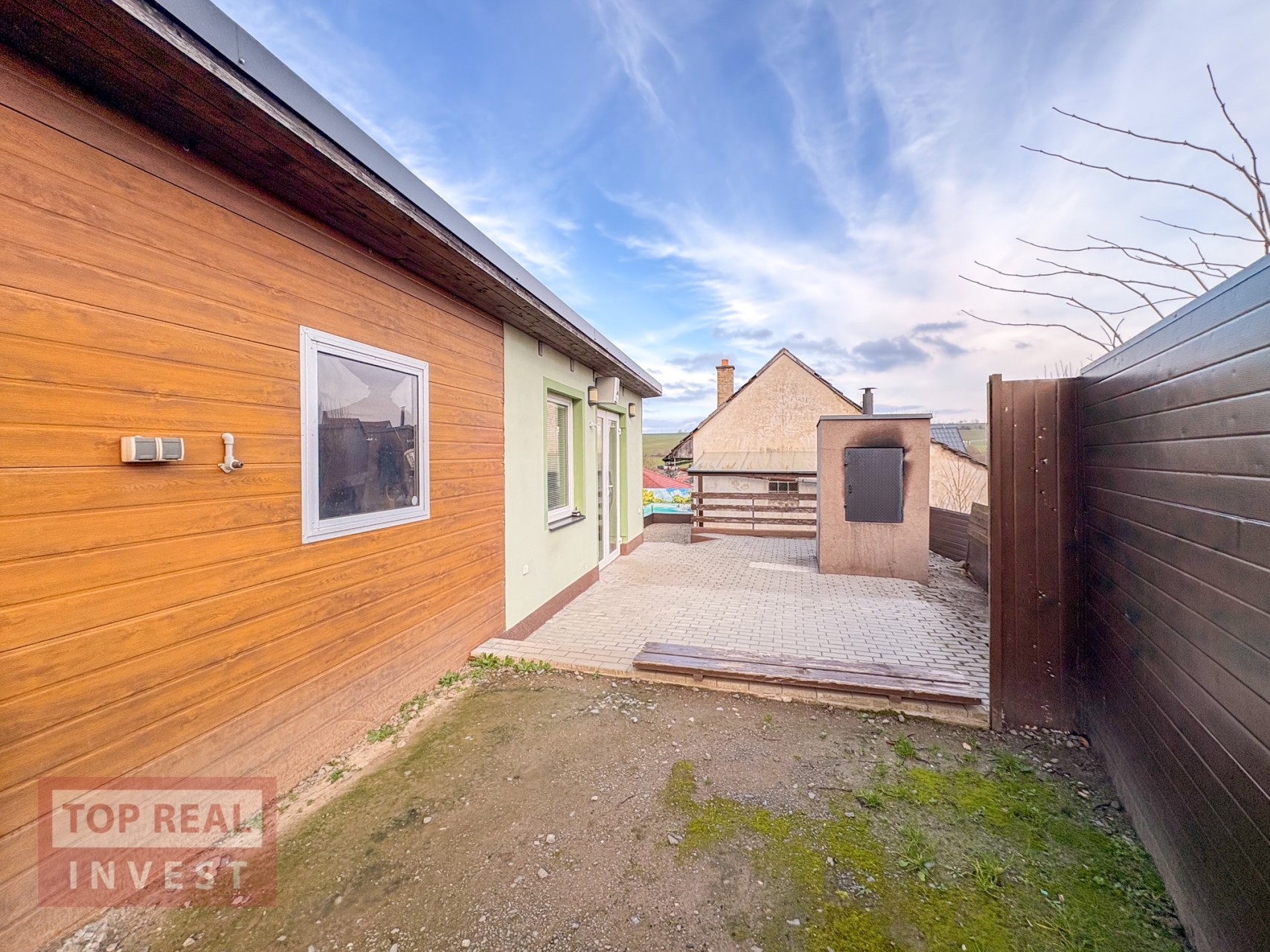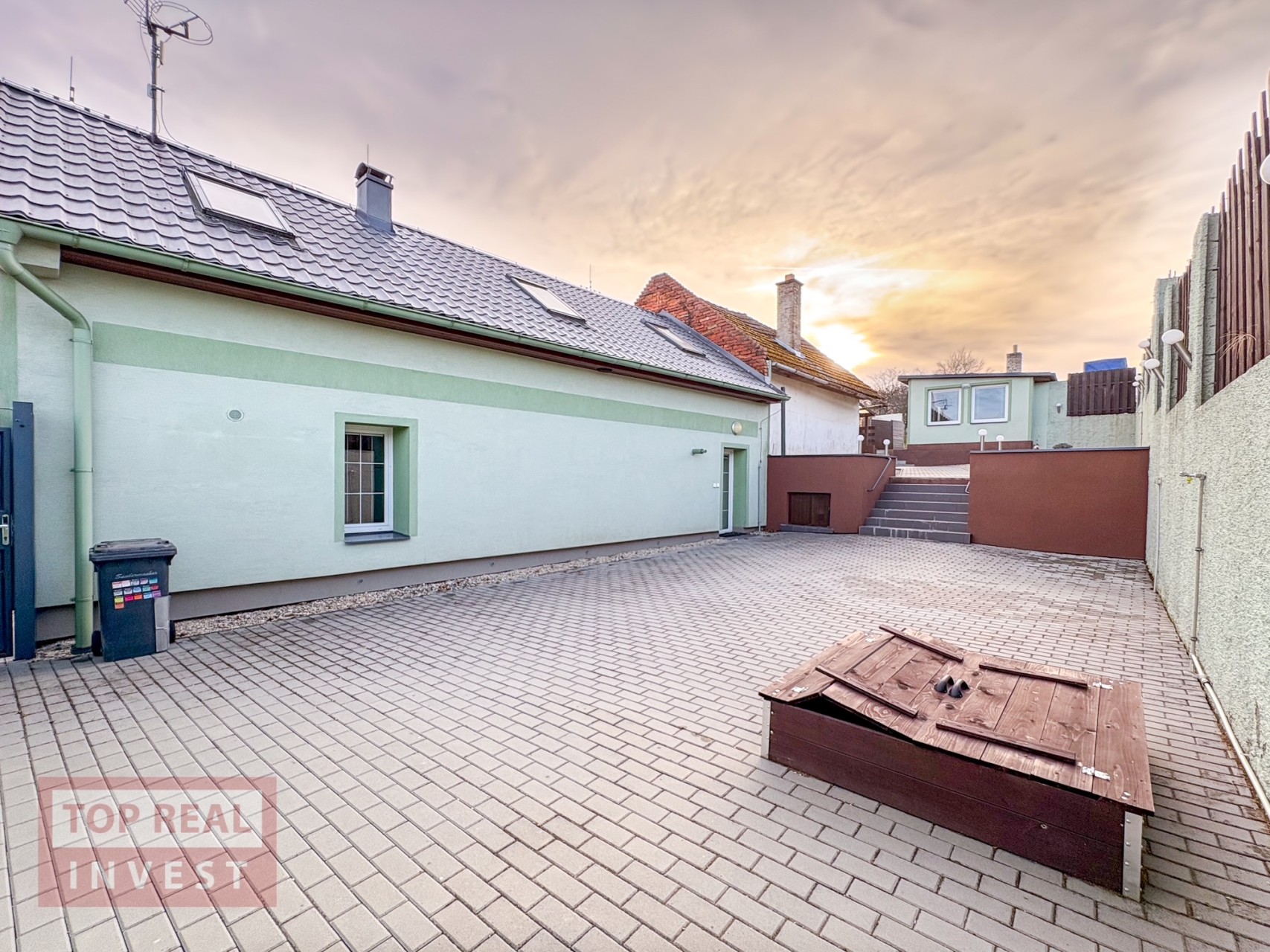 Dům prošel velmi důkladnou a zdařilou rekonstrukcí, díky které dnes nabízí moderní, funkční a příjemně členitý obytný prostor. V prvním nadzemním podlaží se nachází zádveří, ze kterého se vstupuje do kuchyně. Ta je světlá, prakticky řešená a disponuje přímým výstupem na vydlážděný dvůr, což oceníte při stolování venku i při každodenním provozu domácnosti. Kuchyně je vybavena vestavěnými spotřebiči – elektrická trouba a indukční deska. Na kuchyni navazuje průchozí obývací pokoj, který tvoří přirozené centrum domu. Dále se v přízemí nachází samostatný pokoj se šatnou, ideální jako ložnice, pracovna či pokoj pro hosty. Dispozici doplňuje chodba se schodištěm vedoucím do horního patra a prostorná koupelna vybavená rohovou vanou a toaletou.