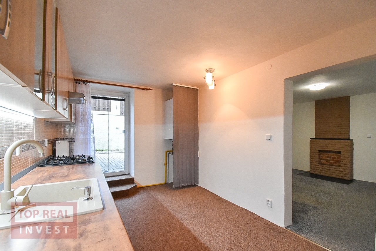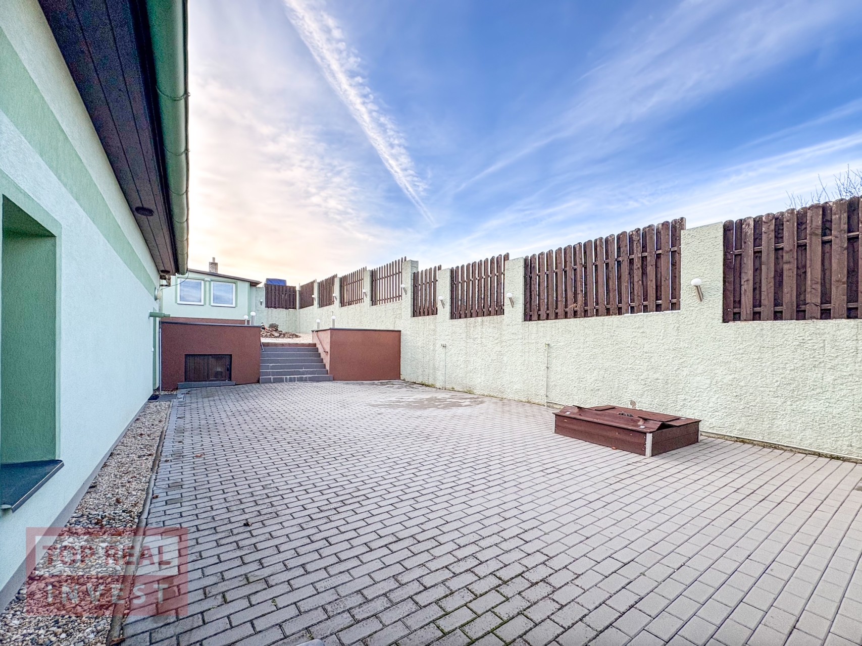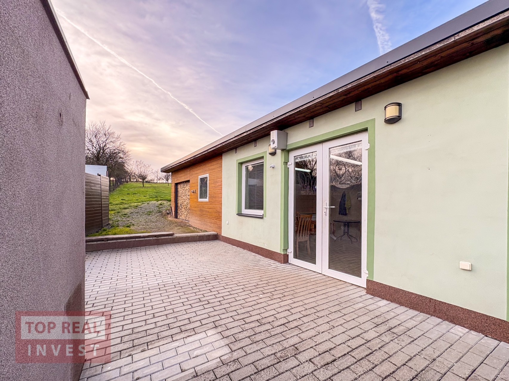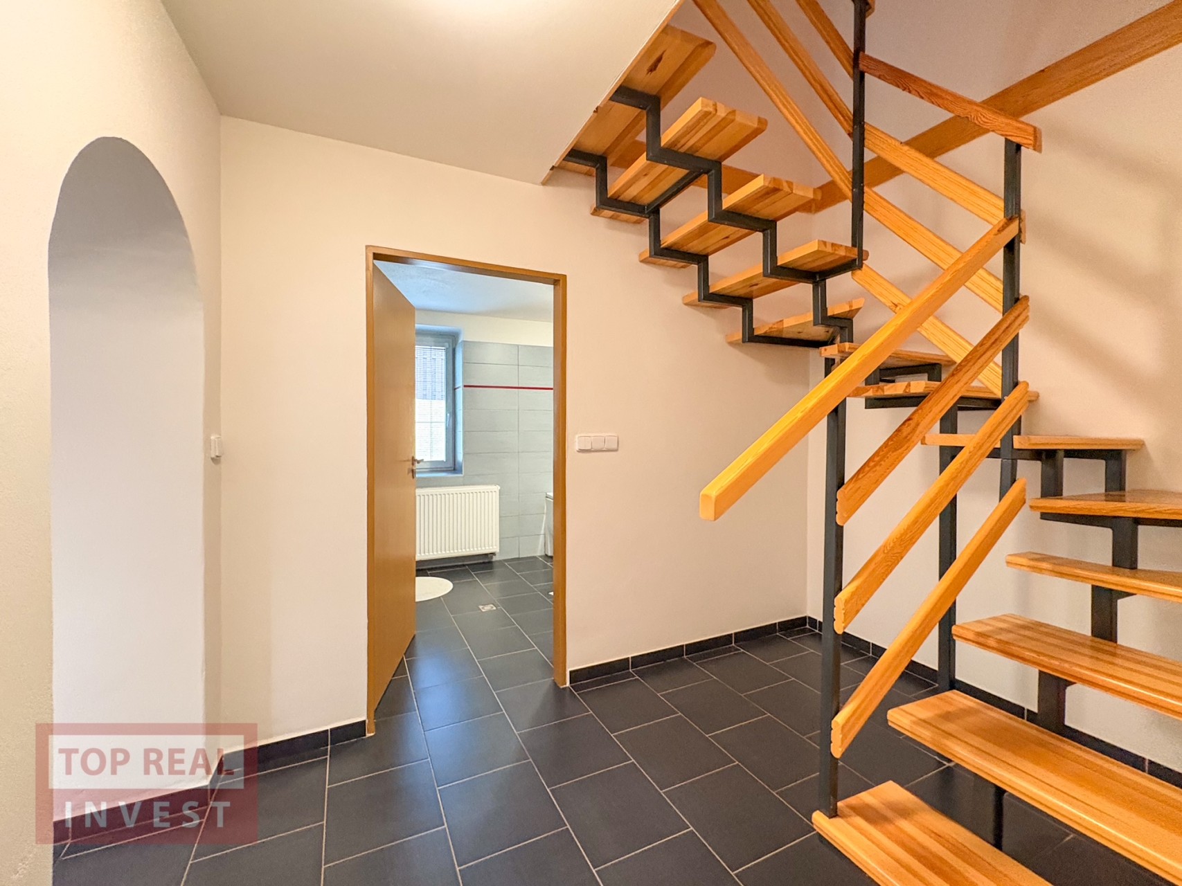 Dům prošel velmi důkladnou a zdařilou rekonstrukcí, díky které dnes nabízí moderní, funkční a příjemně členitý obytný prostor. V prvním nadzemním podlaží se nachází zádveří, ze kterého se vstupuje do kuchyně. Ta je světlá, prakticky řešená a disponuje přímým výstupem na vydlážděný dvůr, což oceníte při stolování venku i při každodenním provozu domácnosti. Kuchyně je vybavena vestavěnými spotřebiči – elektrická trouba a indukční deska. Na kuchyni navazuje průchozí obývací pokoj, který tvoří přirozené centrum domu. Dále se v přízemí nachází samostatný pokoj se šatnou, ideální jako ložnice, pracovna či pokoj pro hosty. Dispozici doplňuje chodba se schodištěm vedoucím do horního patra a prostorná koupelna vybavená rohovou vanou a toaletou.