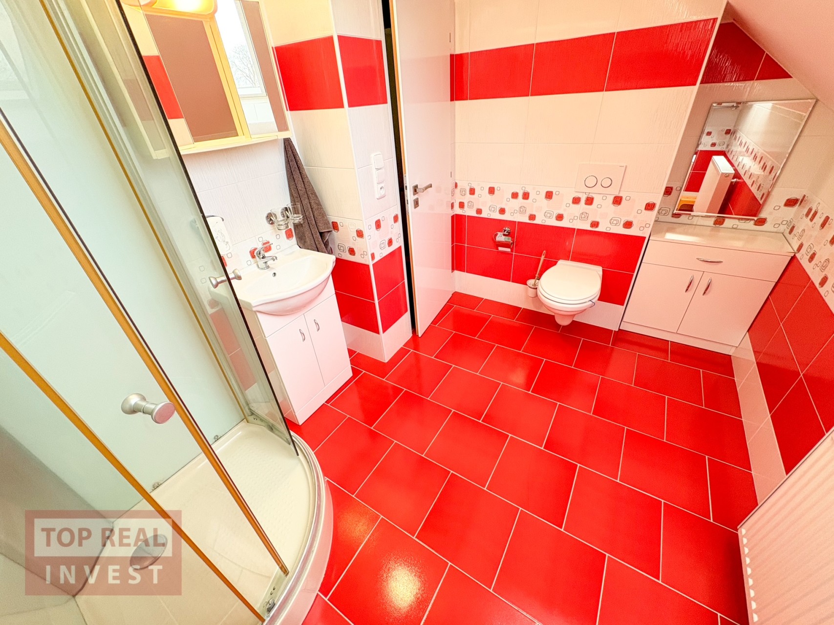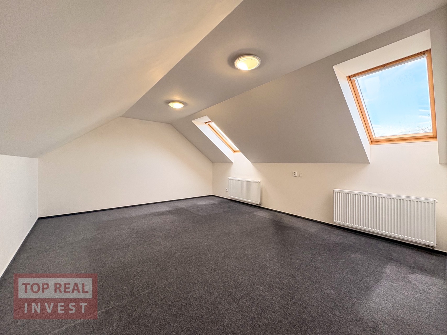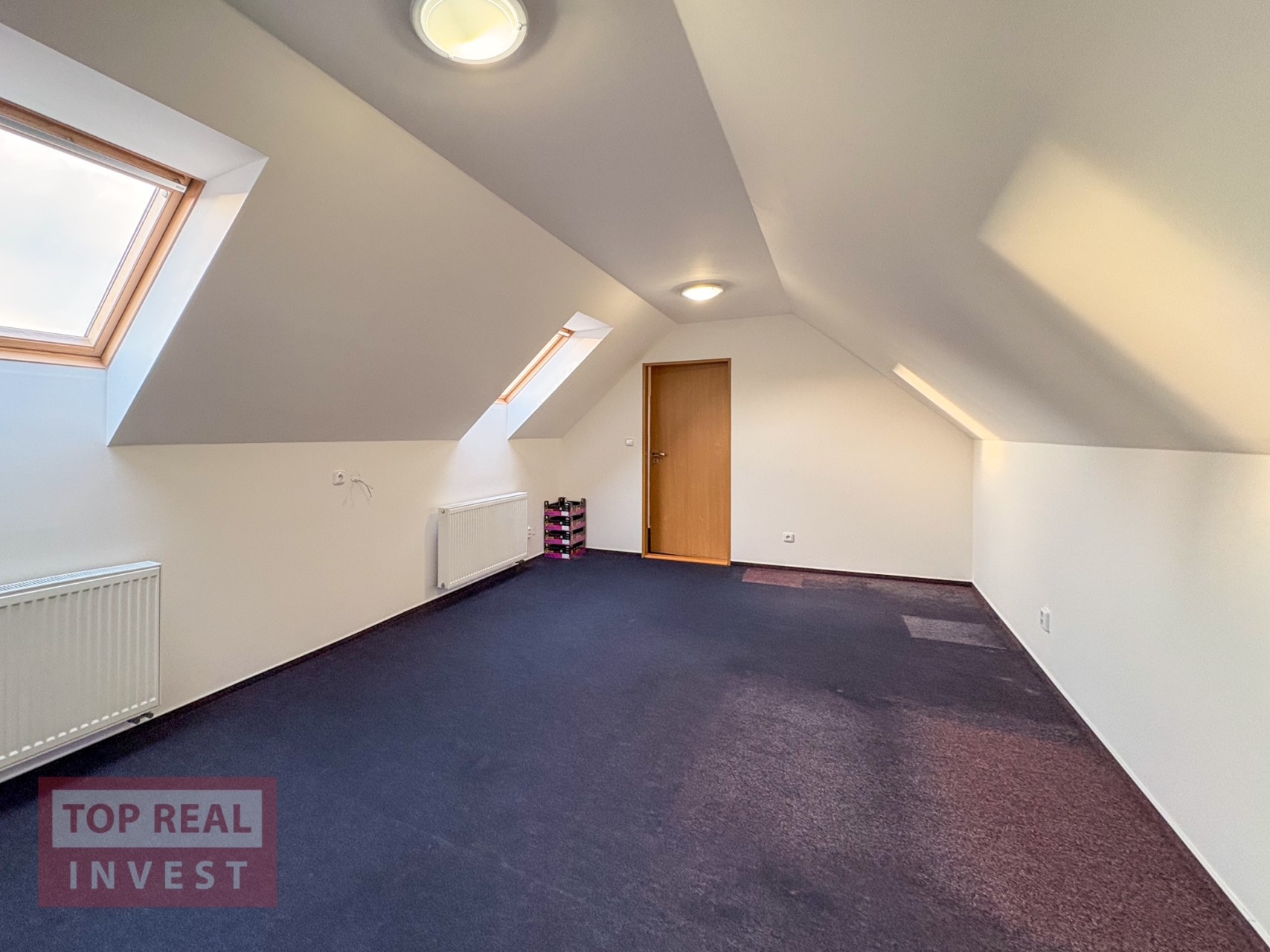 Druhé nadzemní podlaží nabízí klidovou zónu domácnosti. Nacházejí se zde dva prostorné podkrovní pokoje, které poskytují dostatek místa jak pro odpočinek, tak pro pracovní či dětský koutek. Patro dále disponuje velkou šatnou v jednom z pokojů a druhou koupelnou se sprchovým koutem a WC, což výrazně zvyšuje komfort každodenního života.