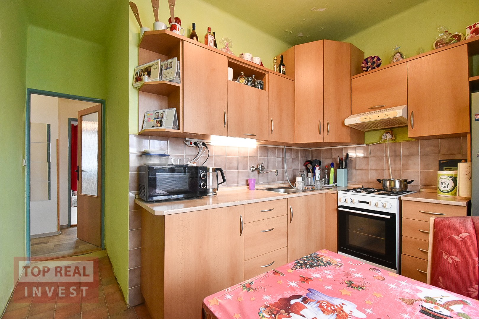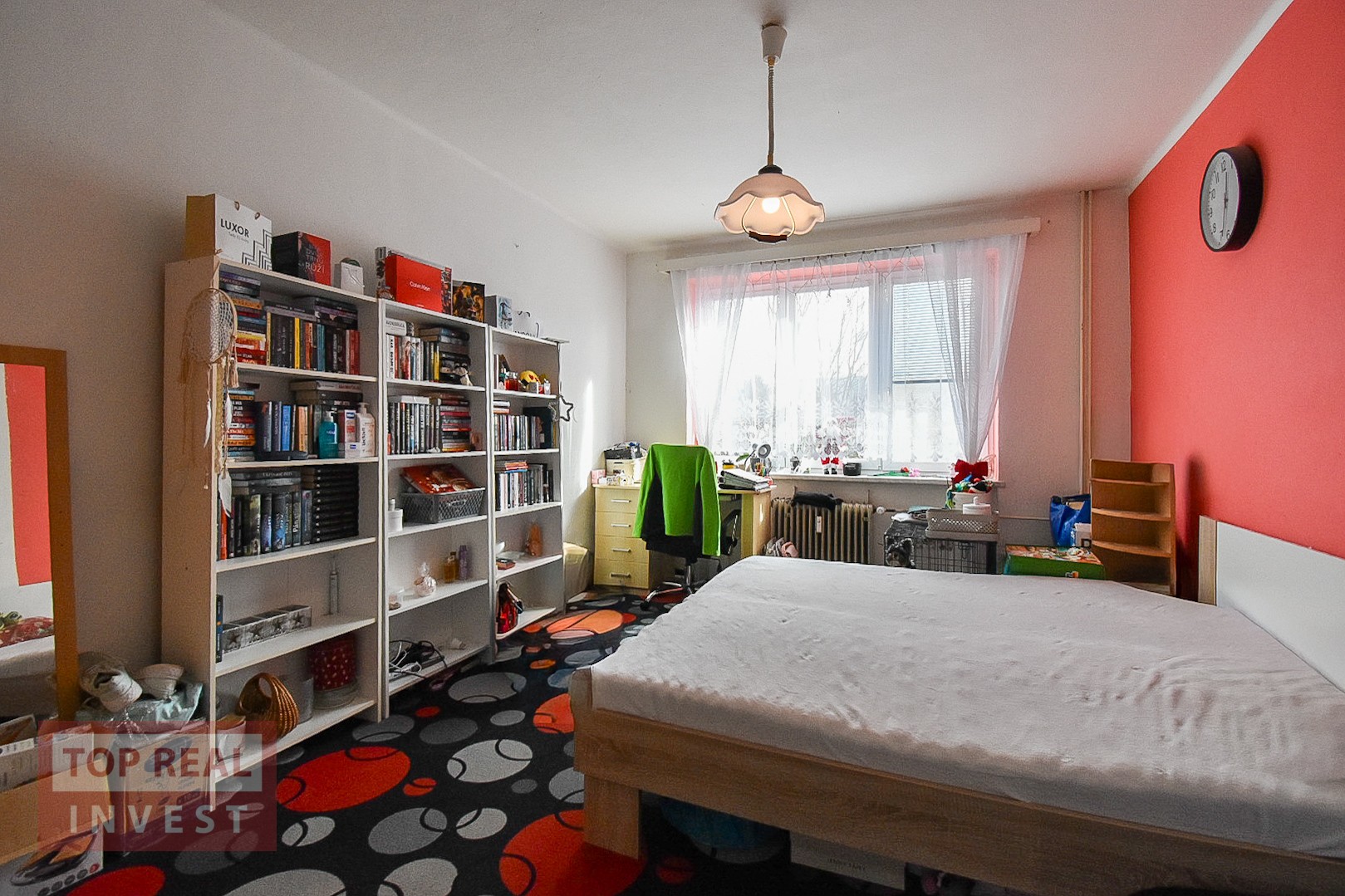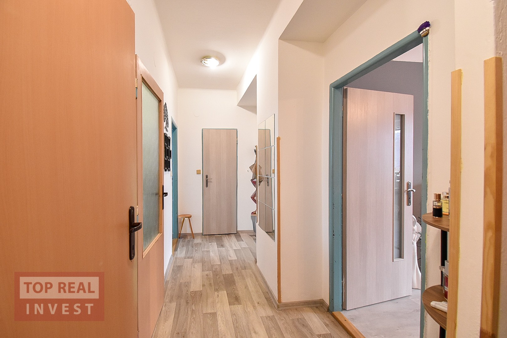 Byt je udržovaný a prakticky řešený, ideální pro někoho, kdo hledá klidné bydlení s dostatkem prostoru. Dispozice bytu je řešena dlouhou chodbou, ze které se vstupuje do všech místností – žádný pokoj není průchozí, což je velká výhoda z hlediska soukromí. Na konci chodby se nachází prostorná komora, která nabízí praktický úložný prostor přímo v bytě.