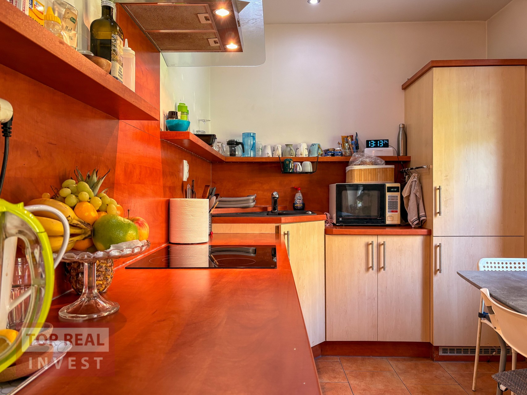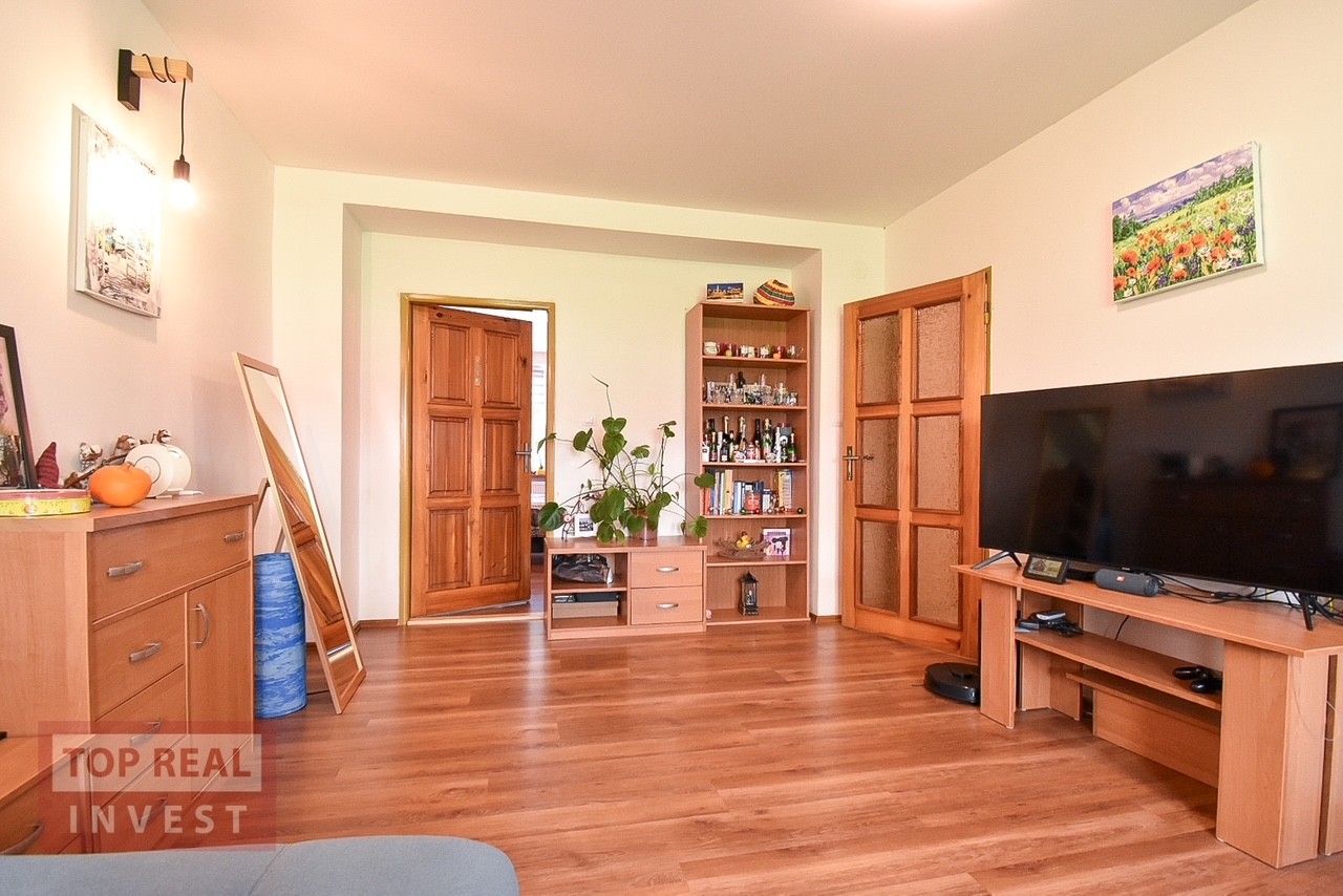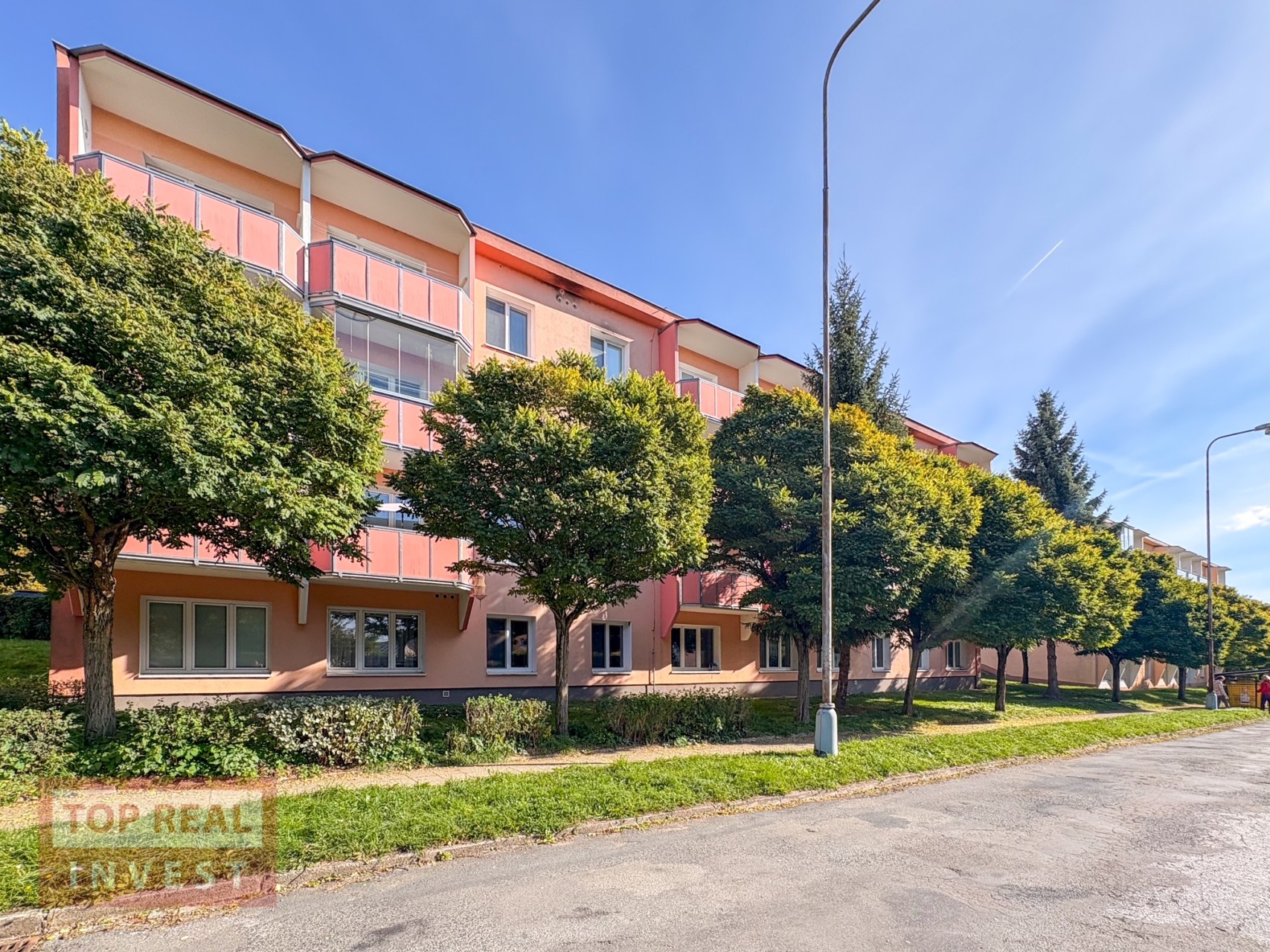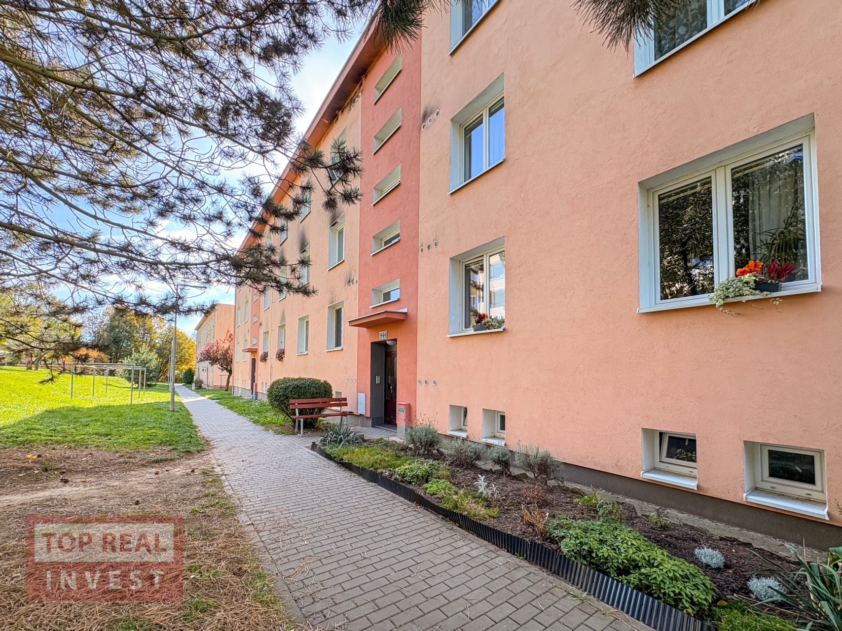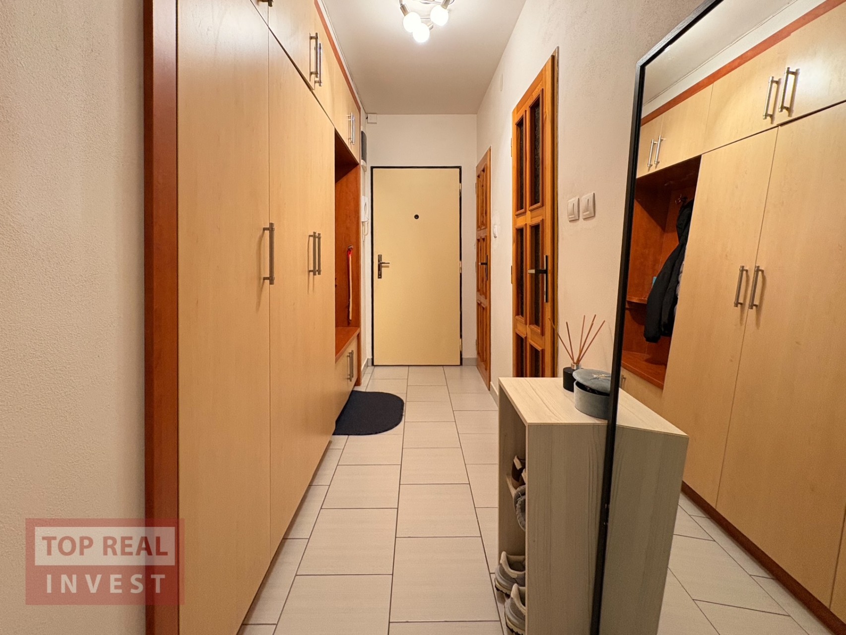 Dispozice bytu je velmi praktická a nabízí dostatek prostoru. Vstupní chodba je vybavena vestavěnými skříněmi. Odtud je vstup do koupelny s vanou a na samostatné WC. Z chodby dále vstoupíte do prostorného obývacího pokoje spojeného s kuchyňským koutem, který je vybaven vestavěnou lednicí, sklokeramickou deskou, horkovzdušnou troubou a místem pro pračku. Na obývací pokoj navazuje ložnice, ze které je přístup na prostornou lodžii.