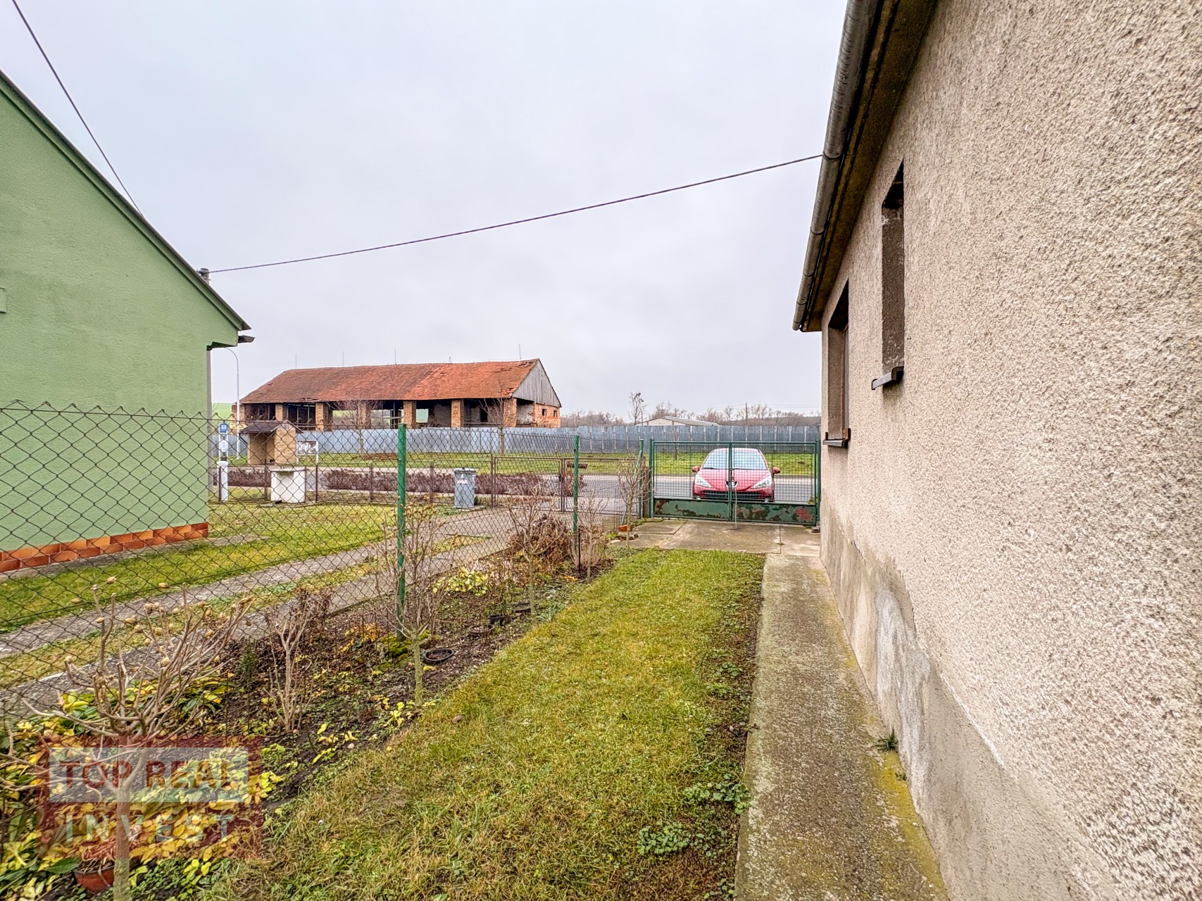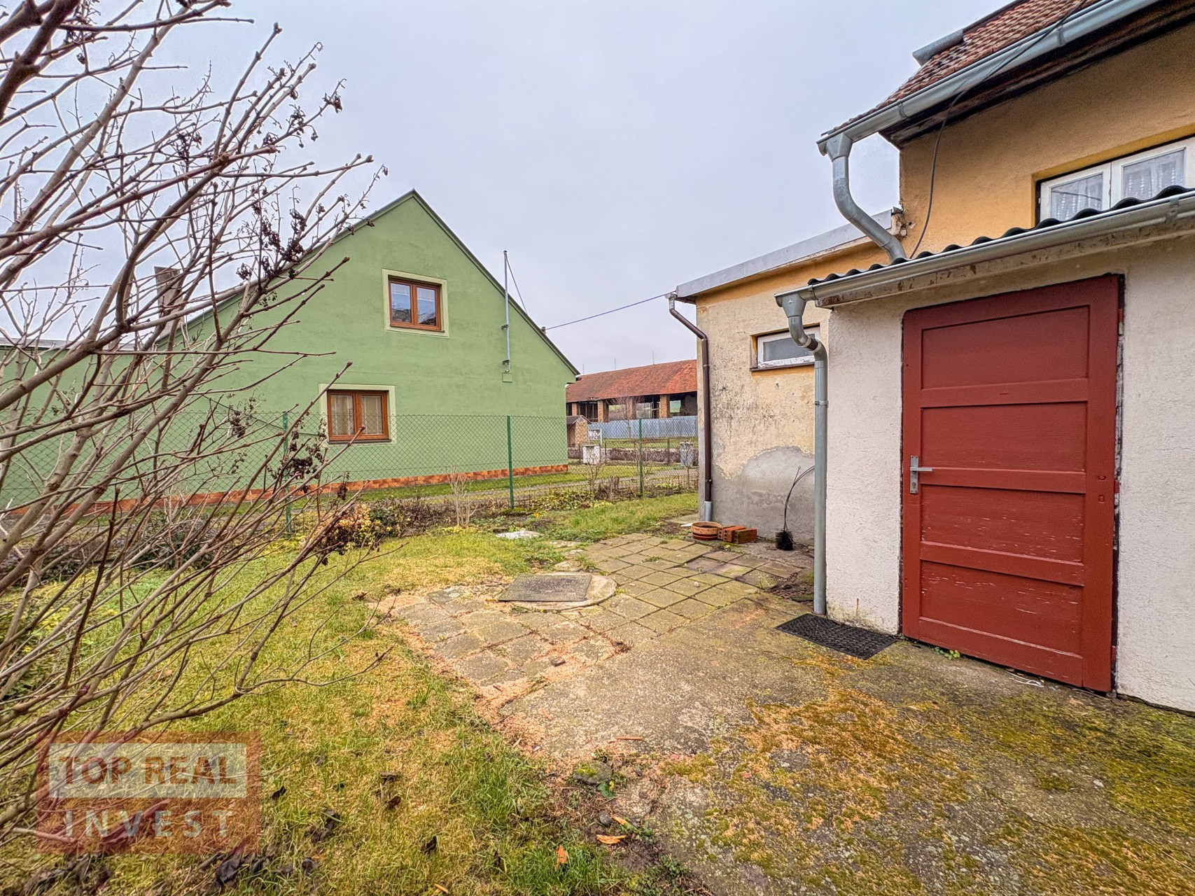 Velkou výhodou domu je prostorná zahrada s bočním vjezdem na pozemek, kde je možné parkování dvou aut přímo na pozemku. Další parkovací místo je možné ve vjezdu nebo před domem, kde obec vybudovala veřejná parkovací stání. Zahrada nabízí dostatek soukromí i prostoru pro trávení volného času, pěstování nebo další úpravy.