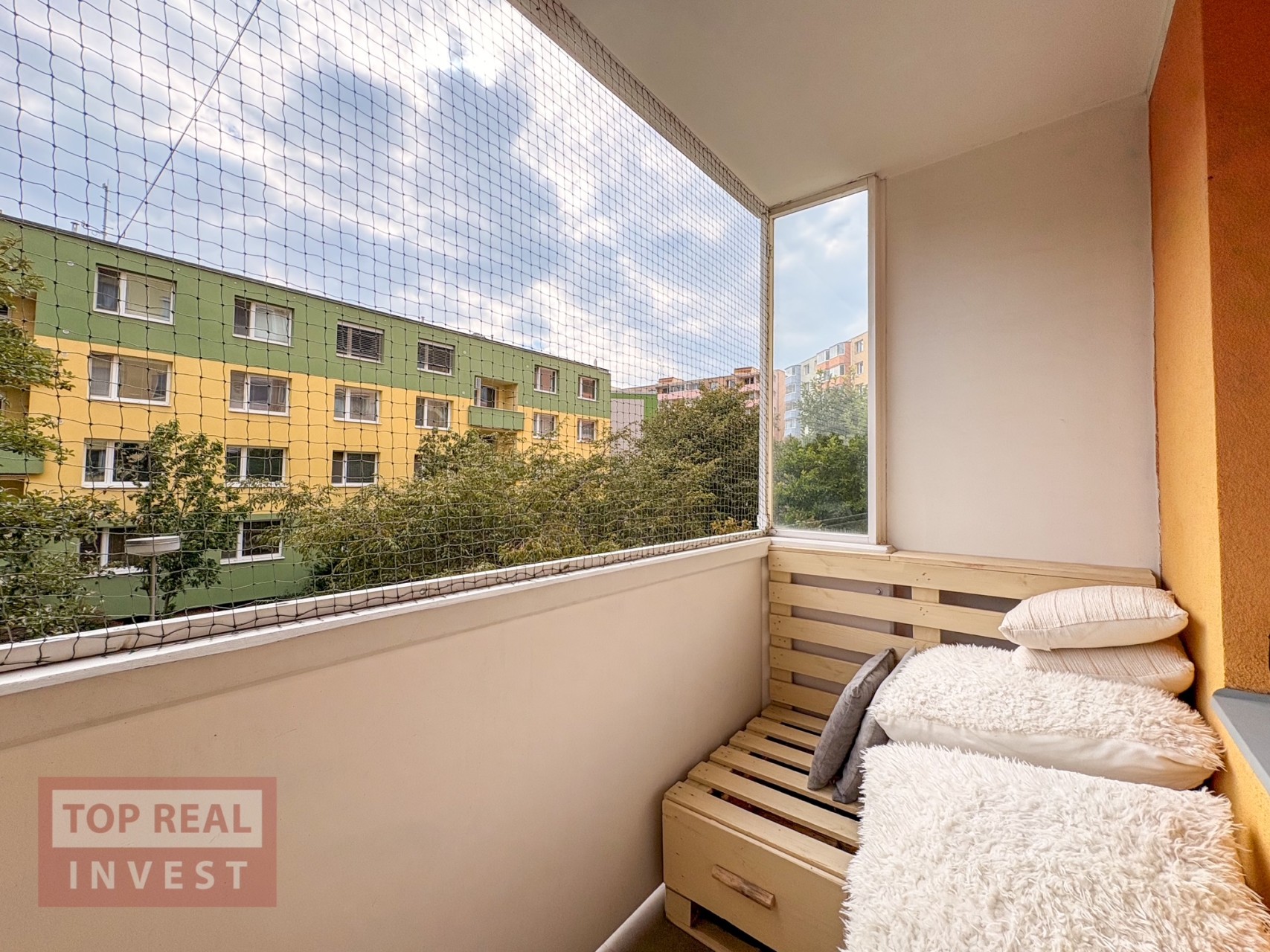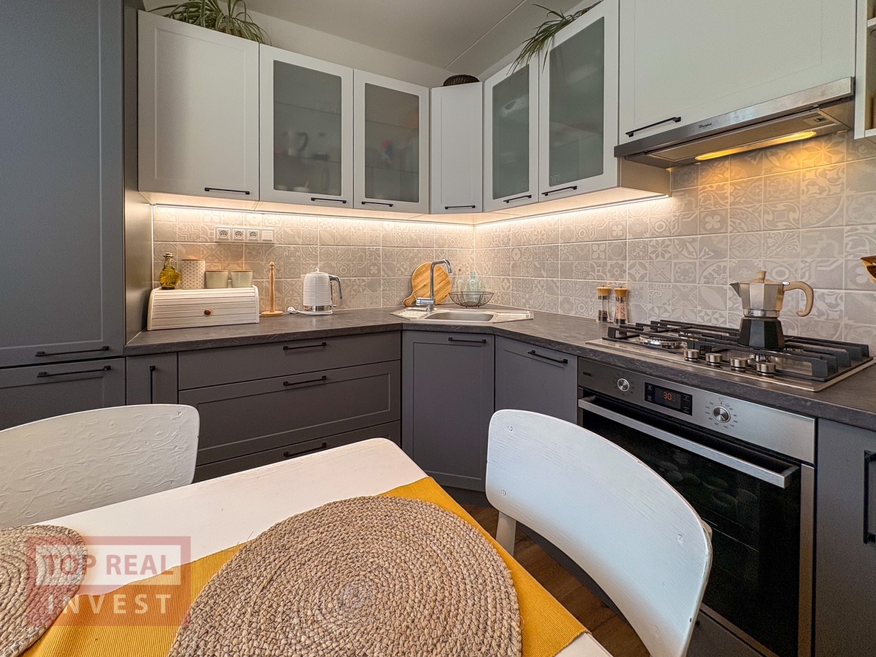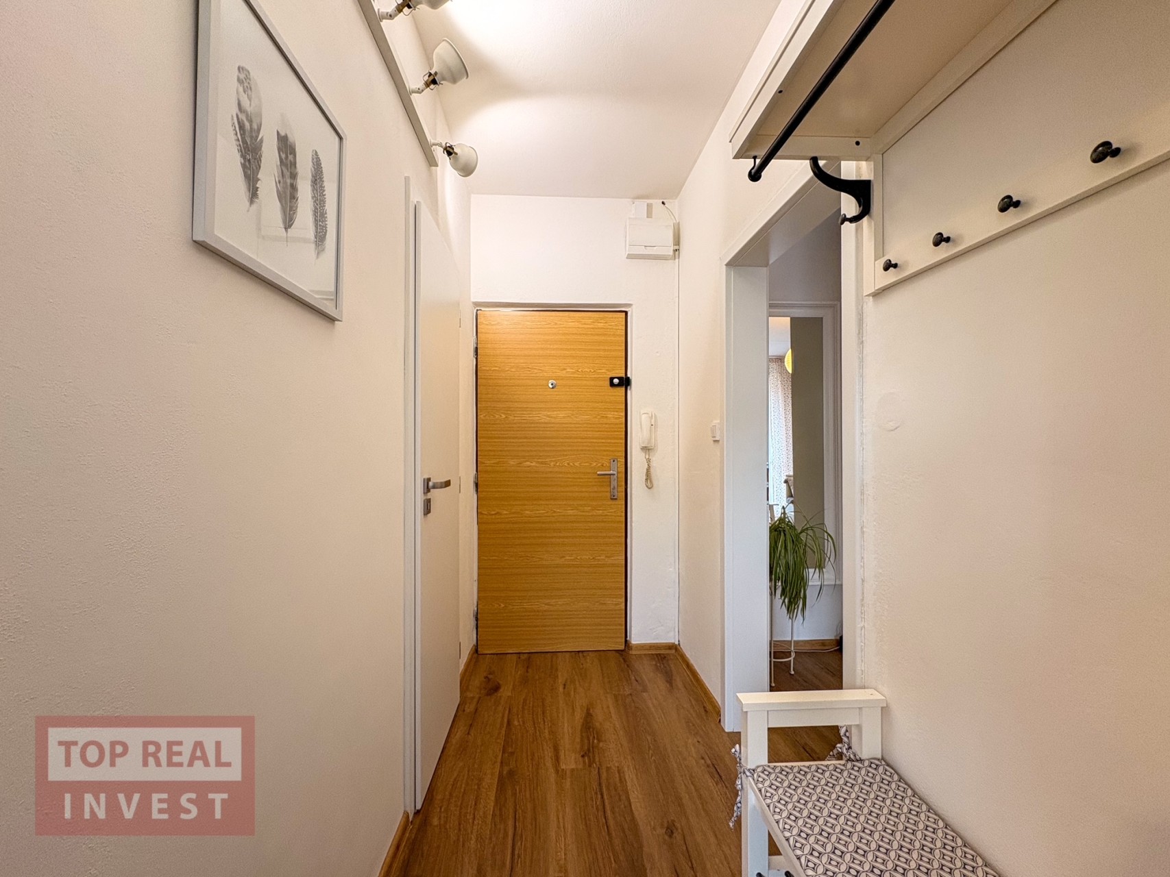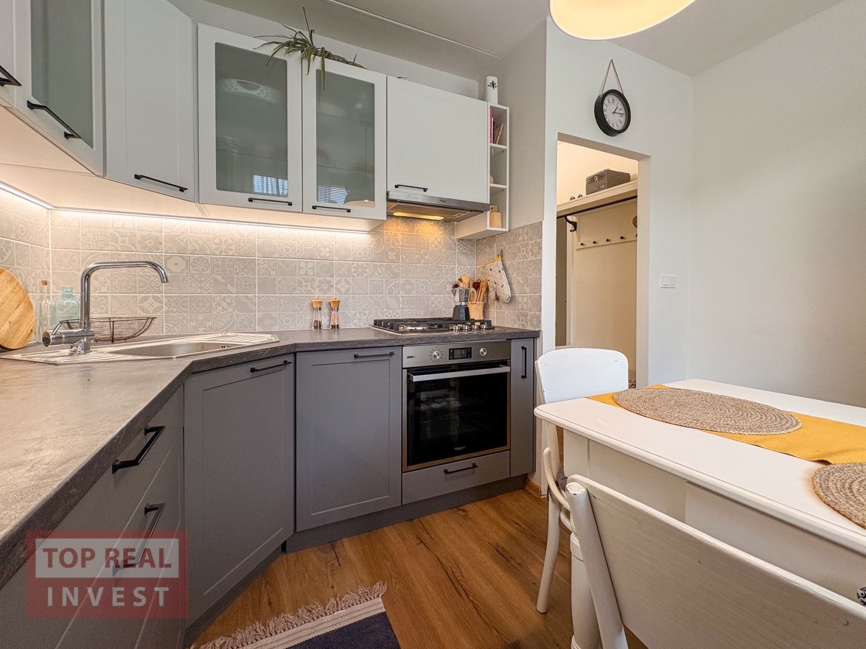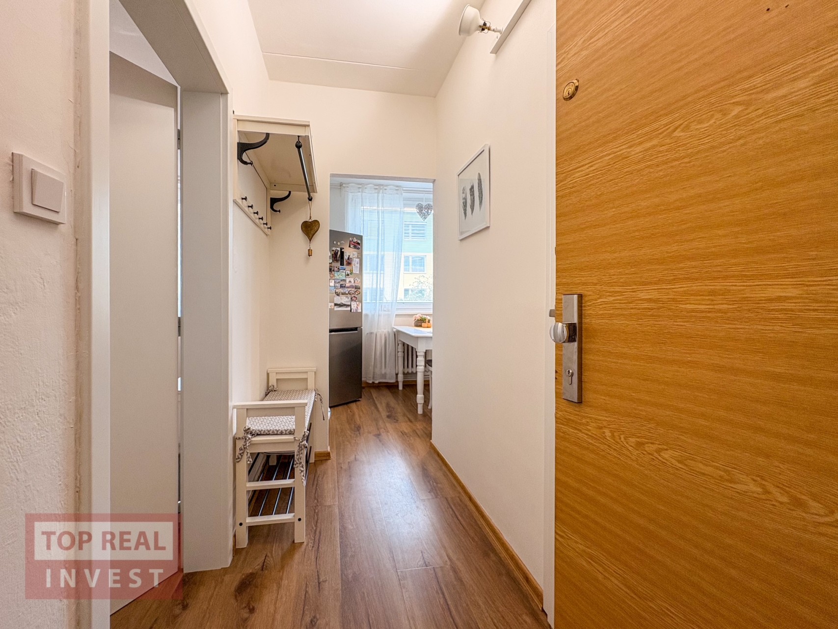 Celý byt propojuje vstupní chodba, ze které vedou samostatné vstupy do kuchyně a pokoje. V kuchyni jsou umístěny vestavěné spotřebiče (plynová vařící plocha, elektrická trouba, své místo zde má i plynový kotel, schovaný v kuchyňské lince), součástí pronájmu není jídelní stůl a židle. Koupelna je spojená s WC. Má k dispozici prostorný sprchový kout a umyvadlo se skříňkou. Pračka není součástí pronájmu. Na podlahách je položena vinylová podlaha a dlažba. Byt má k dispozici lodžii. Dům prošel revitalizací.