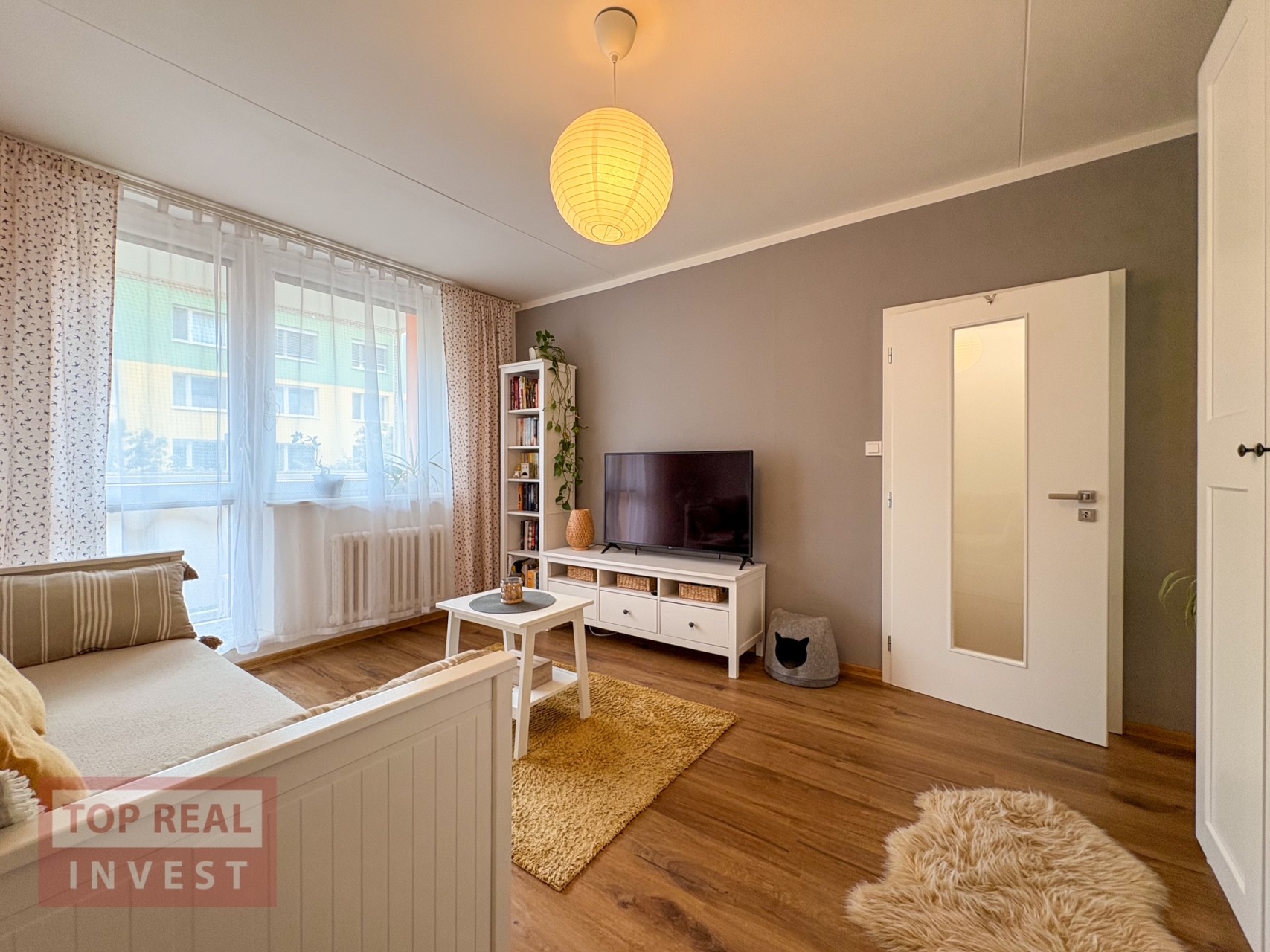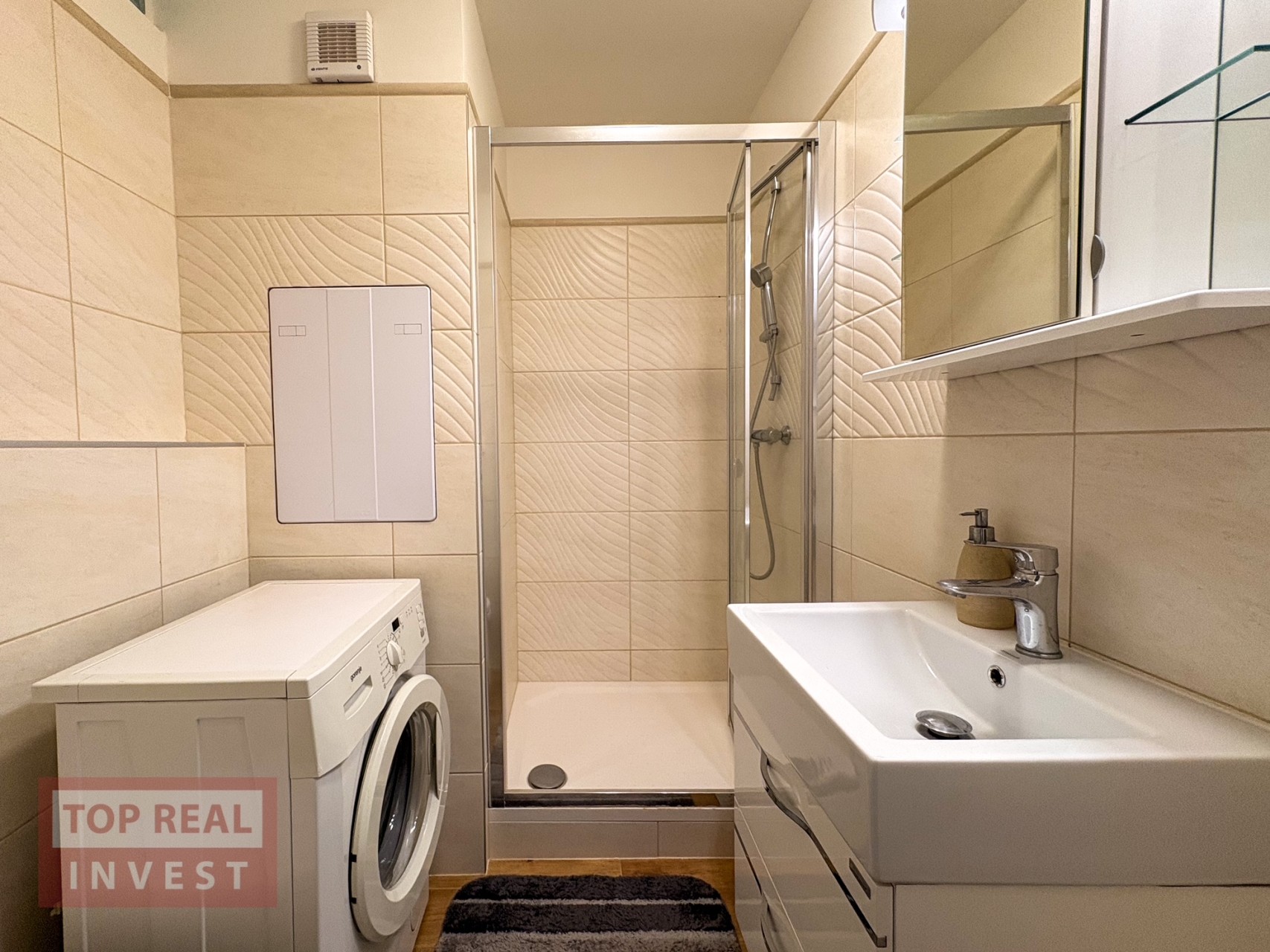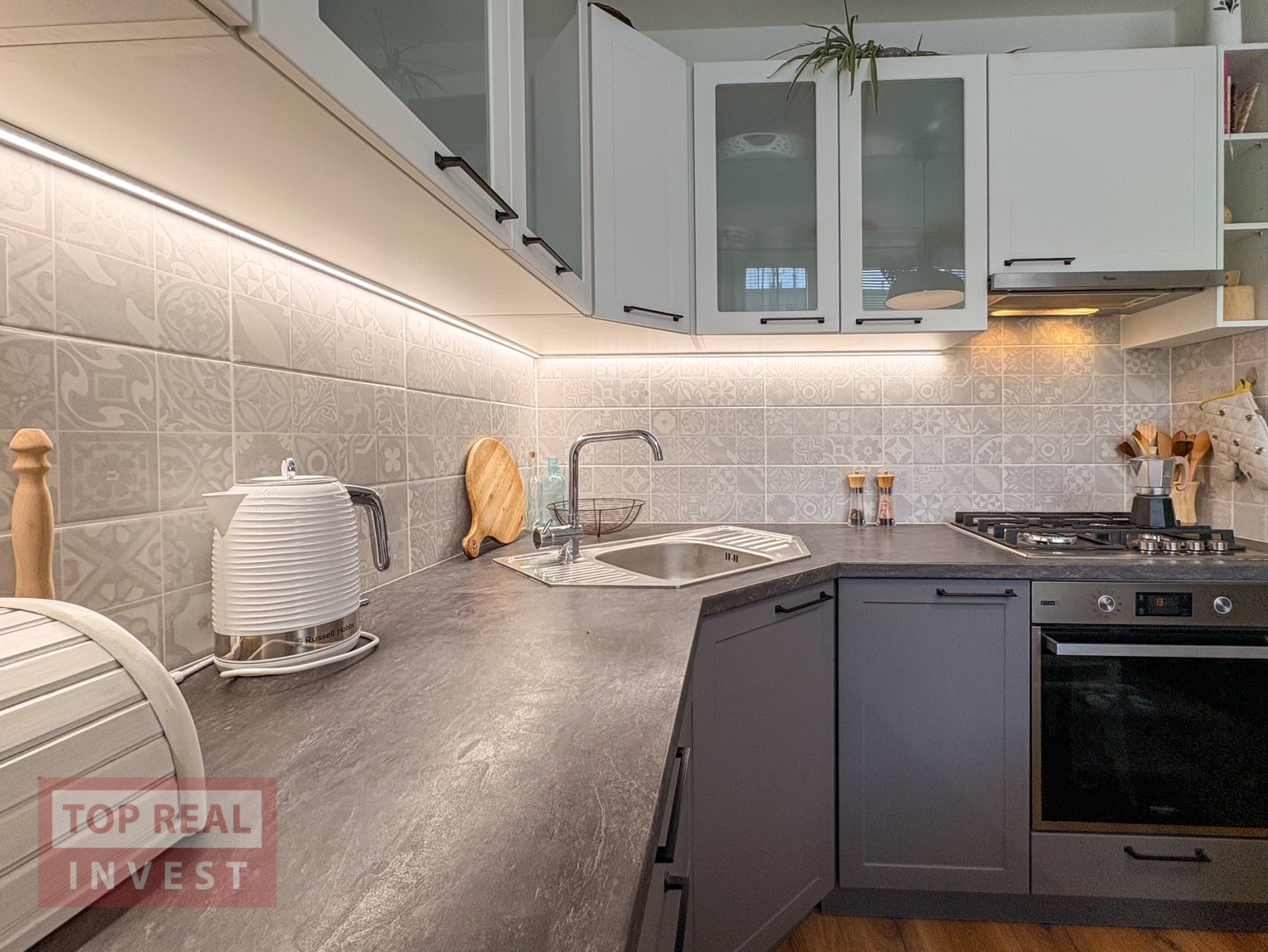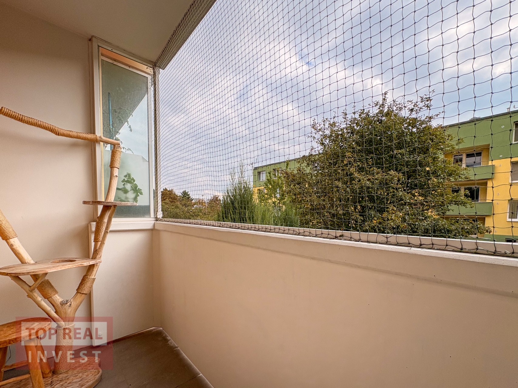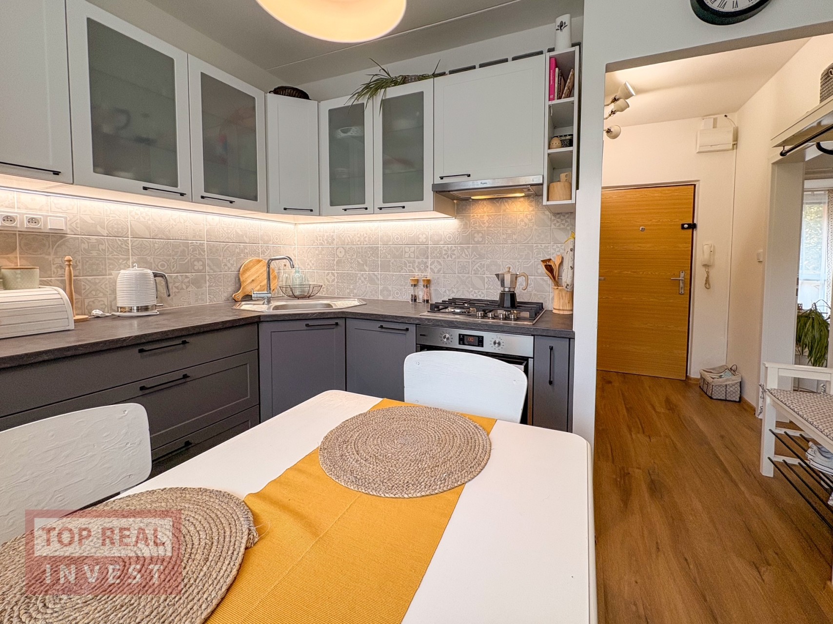 Celý byt propojuje vstupní chodba, ze které vedou samostatné vstupy do kuchyně a pokoje. V kuchyni jsou umístěny vestavěné spotřebiče (plynová vařící plocha, elektrická trouba, své místo zde má i plynový kotel, schovaný v kuchyňské lince), součástí pronájmu není jídelní stůl a židle. Koupelna je spojená s WC. Má k dispozici prostorný sprchový kout a umyvadlo se skříňkou. Pračka není součástí pronájmu. Na podlahách je položena vinylová podlaha a dlažba. Byt má k dispozici lodžii. Dům prošel revitalizací.