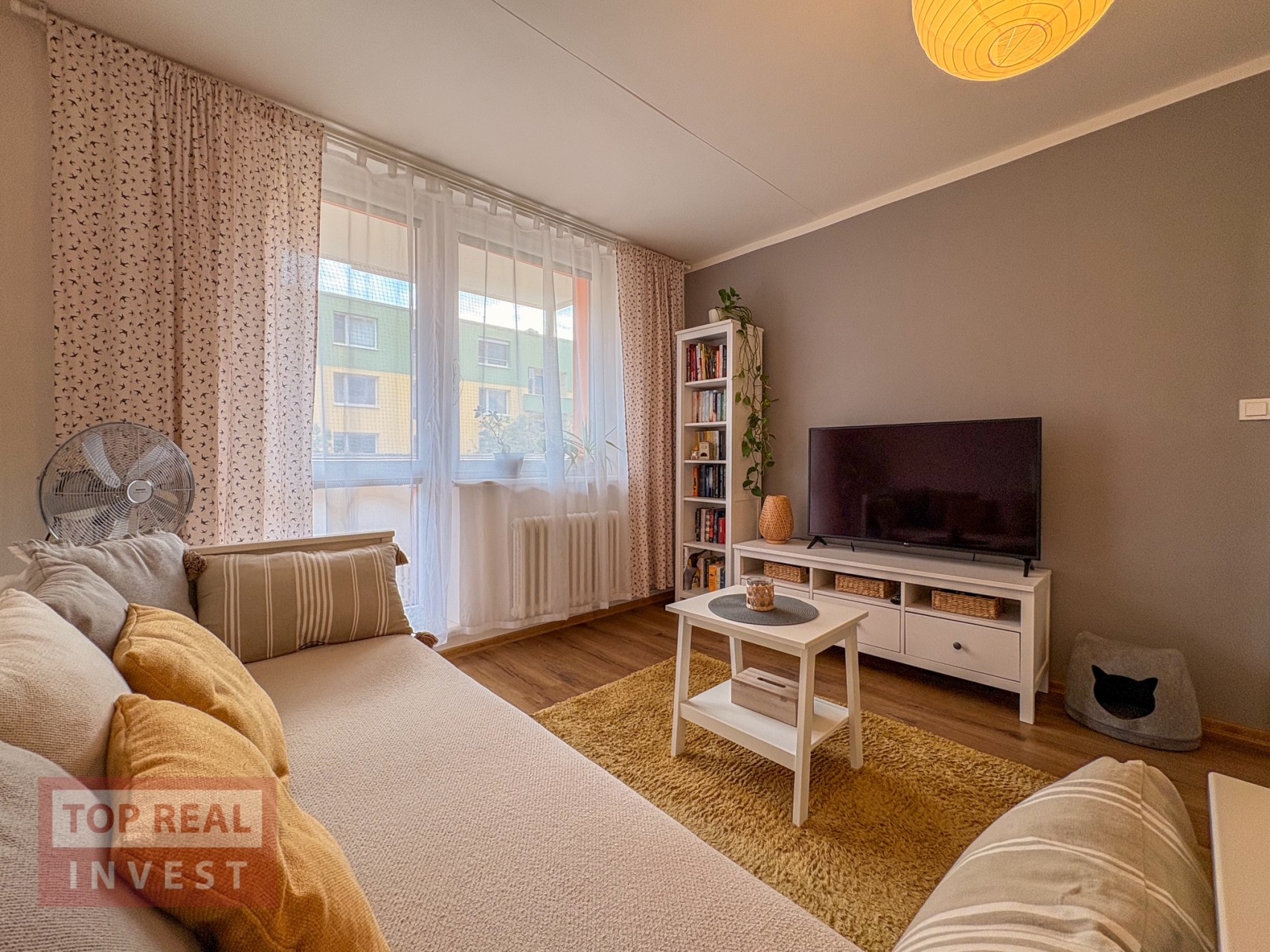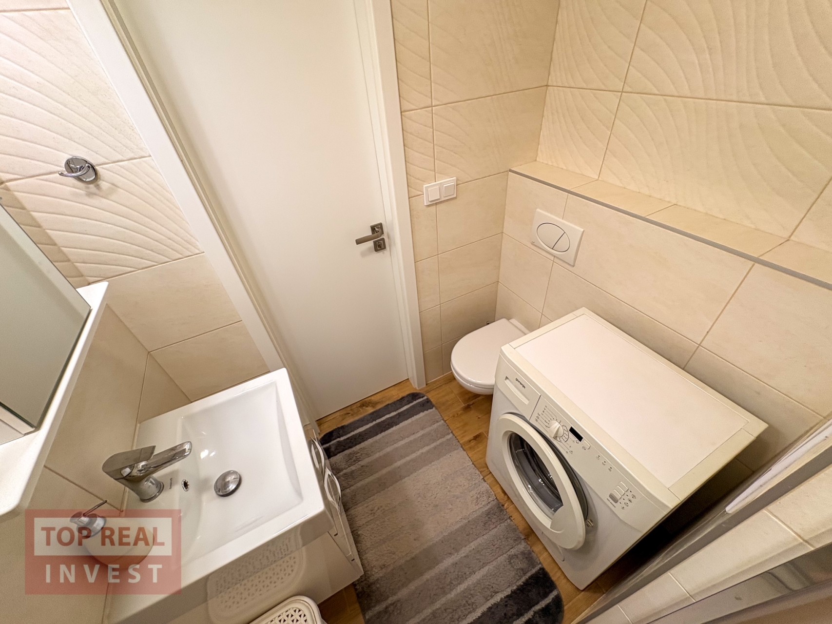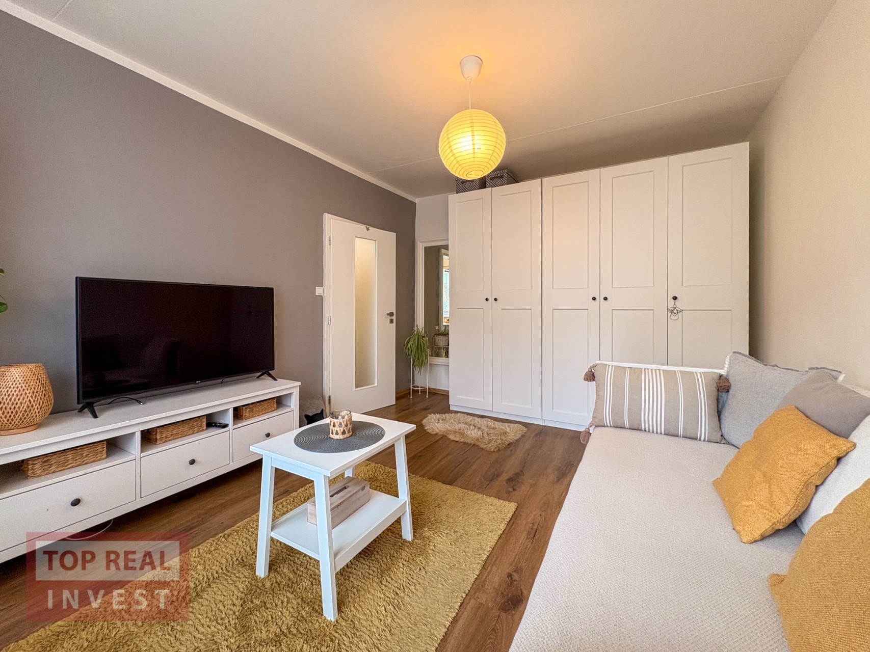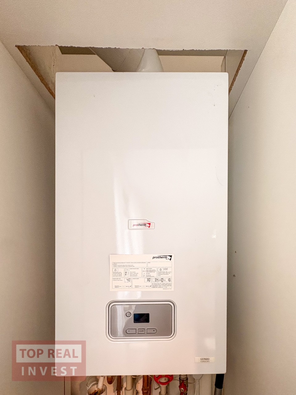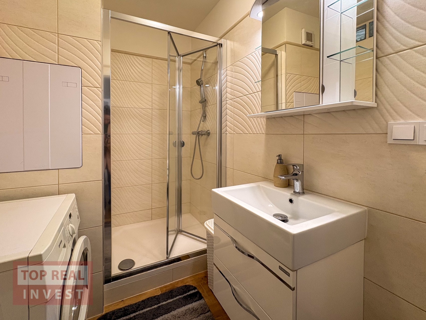Celý byt propojuje vstupní chodba, ze které vedou samostatné vstupy do kuchyně a pokoje. V kuchyni jsou umístěny vestavěné spotřebiče (plynová vařící plocha, elektrická trouba, své místo zde má i plynový kotel, schovaný v kuchyňské lince), součástí pronájmu není jídelní stůl a židle. Koupelna je spojená s WC. Má k dispozici prostorný sprchový kout a umyvadlo se skříňkou. Pračka není součástí pronájmu. Na podlahách je položena vinylová podlaha a dlažba. Byt má k dispozici lodžii. Dům prošel revitalizací.