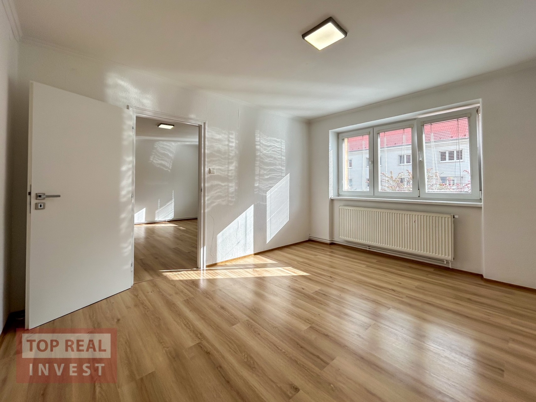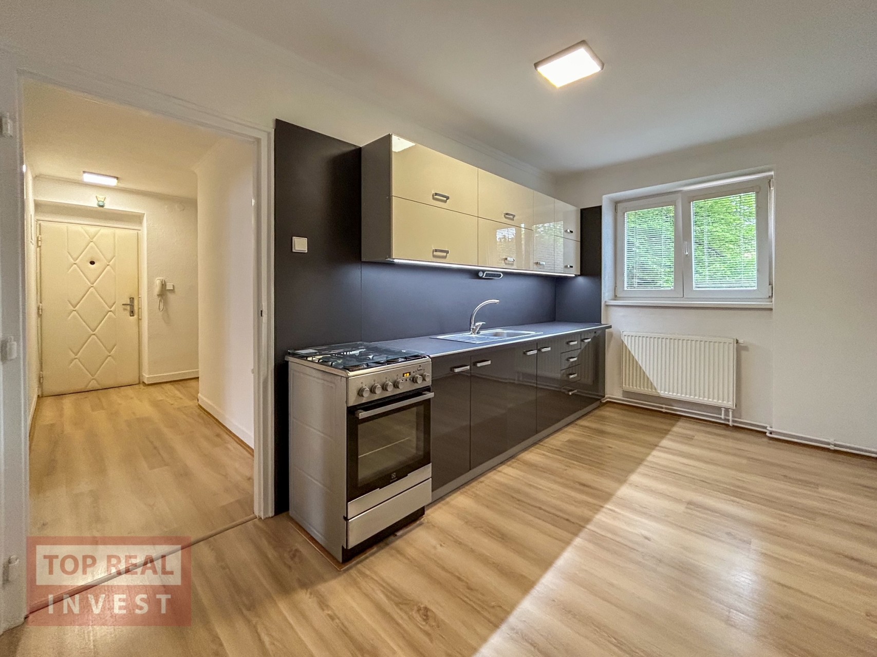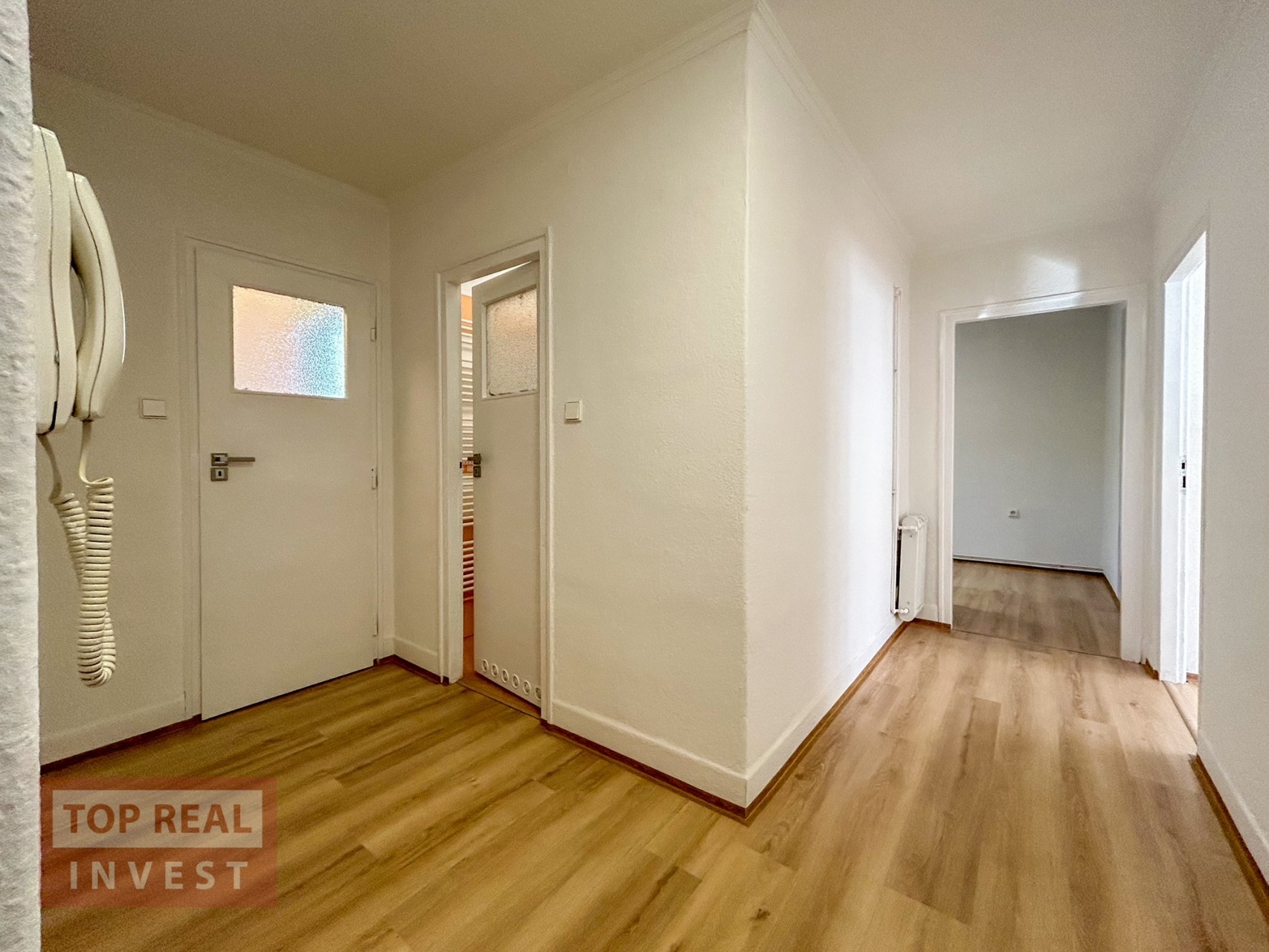 Celková plocha bytu činí 56 m2 a nachází se na 2.NP (první patro). Byt propojuje prostorná vstupní chodba, ze které se vchází do průchozího pokoje, kuchyně, prostorné koupelny spojené s WC. Velkým plusem tohoto prostorného bytu je i špajz v bytě. Další pokoj se nachází za obývacím pokojem. V koupelně je k dispozici vana. Kuchyně je vybavena samostatně stojícím plynovým sporákem s elektrickou troubou. V bytě byly položeny nové podlahy, vymalováno a instalovaná nová, moderní kuchyňská linka. K bytu patří sklep.