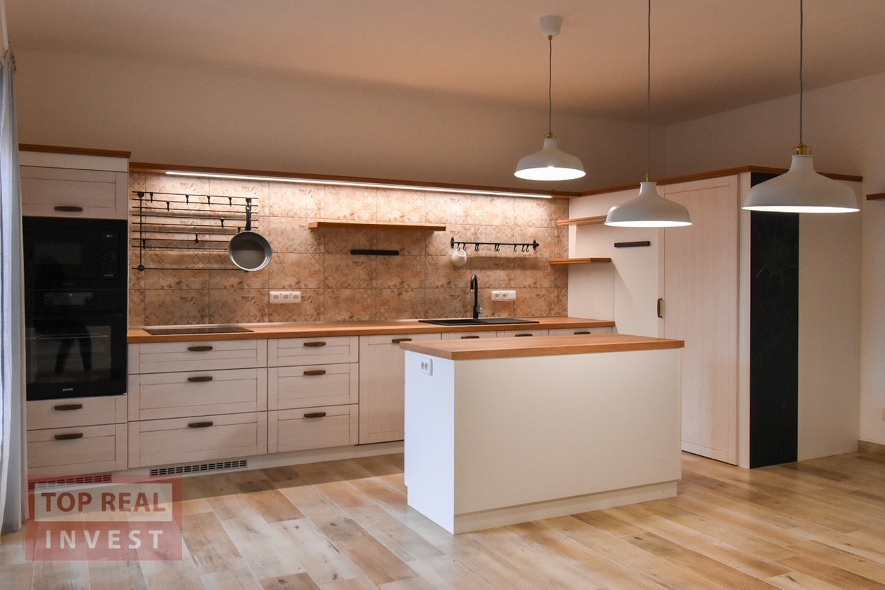 Zděný byt 2+kk se nachází na prvním nadzemním podlaží (přízemí) na ulici Kojetínská (blíže k centru). Byt se skládá z velké kuchyně spojené s jídelnou a vešel by se sem i kotek pro pracovnu. Přes obývací pokoj se nachází místo pro ložnici. Kuchyň je vybavena vestavnými spotřebiči - myčka nádobí, mikrovlnná trouba, elektrická horkovzdušná trouba, indukční varná deska. V kuchyňské části je vybudovaná i praktická komora, pro uložení potravin. Prostorná koupelna je spojena s WC, zde je k dispozici sprchový kout i místo pro pračku.
