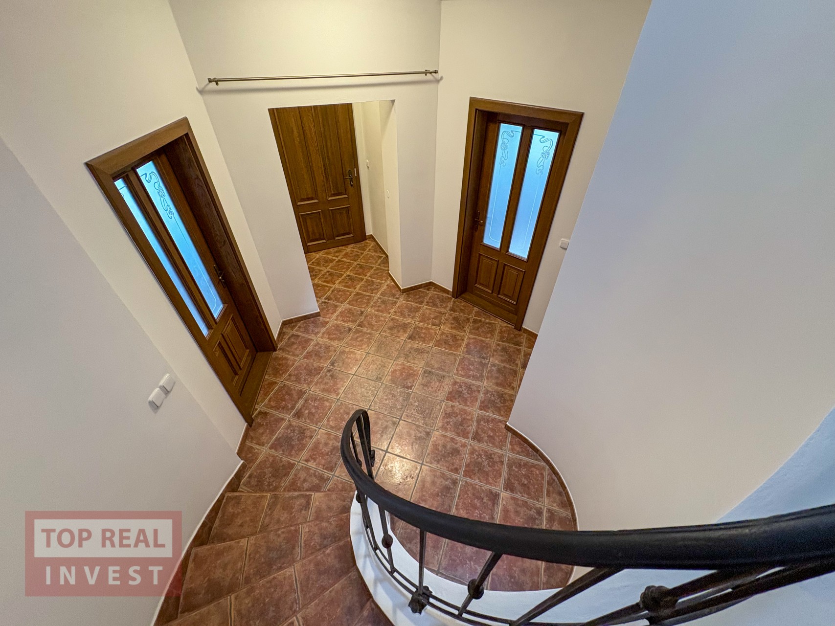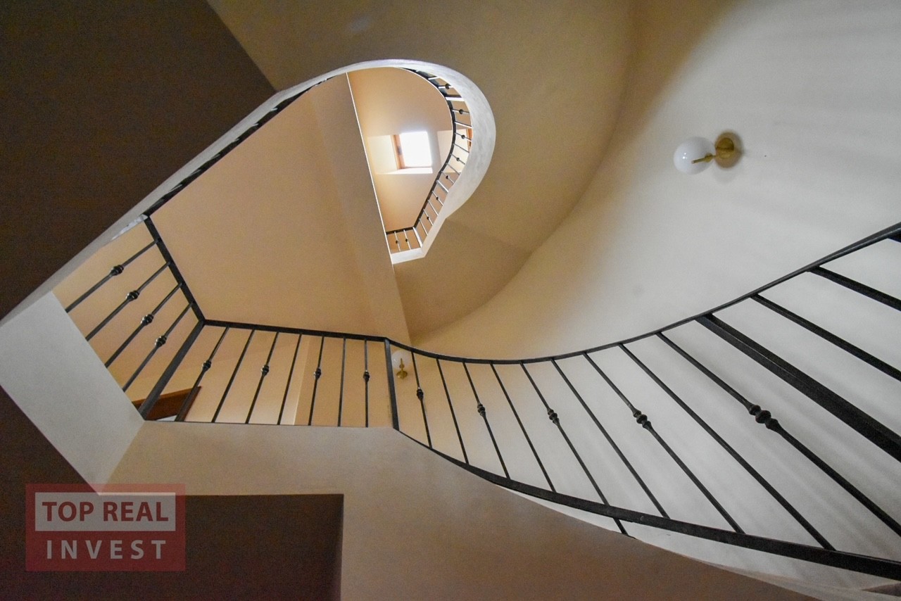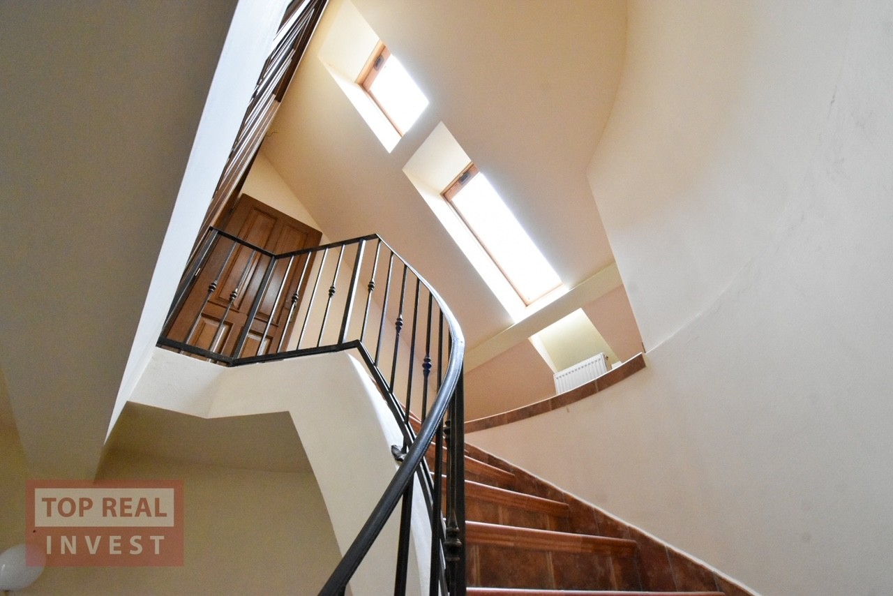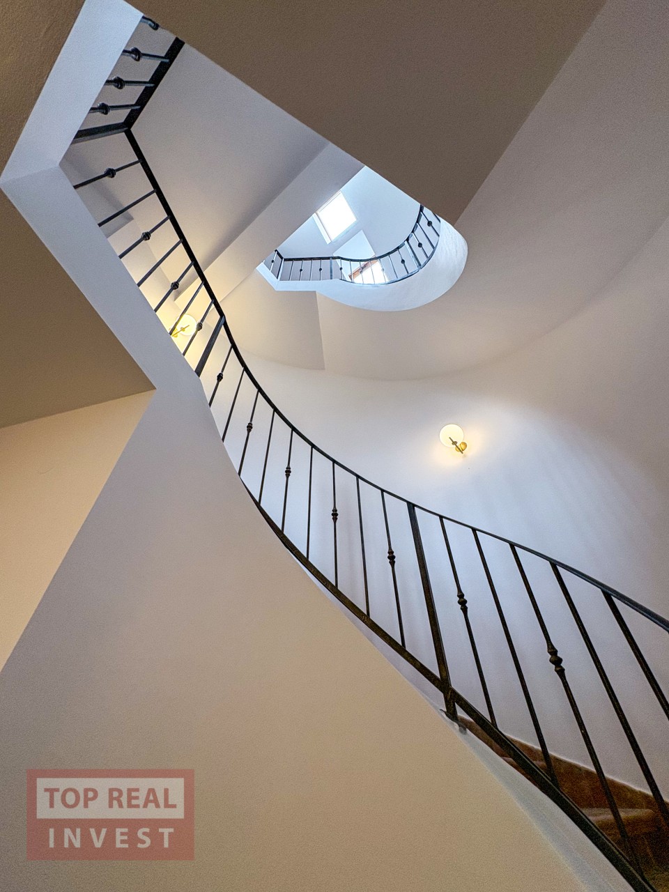 Po vstupu do domu, Vás upoutá členění domu na levou a pravou stranu, kde středem prochází úchvatné, otevřené schodiště, které se stáčí kolem sochy a propojuje všechny patra domu. Světlo do prostoru schodiště a vstupní haly, prochází skrz střešní okna.