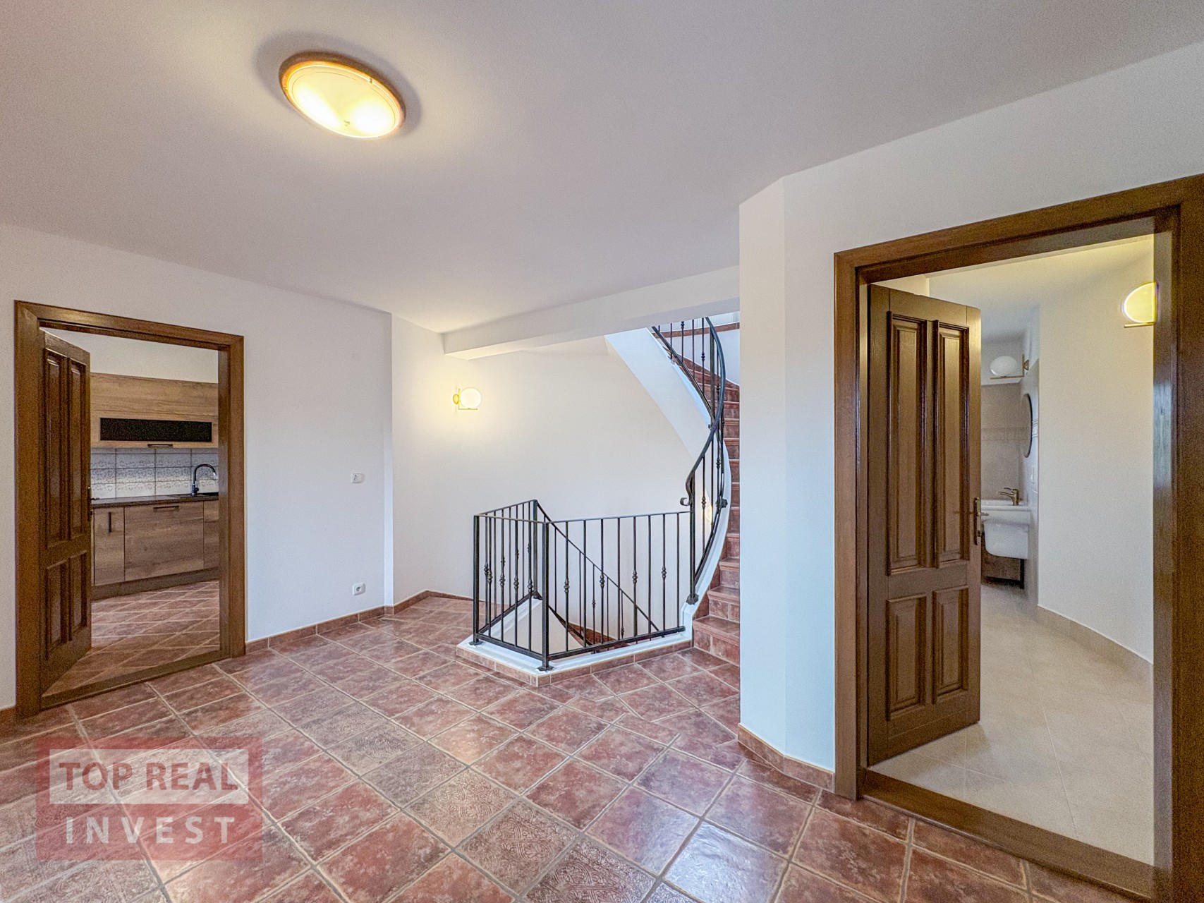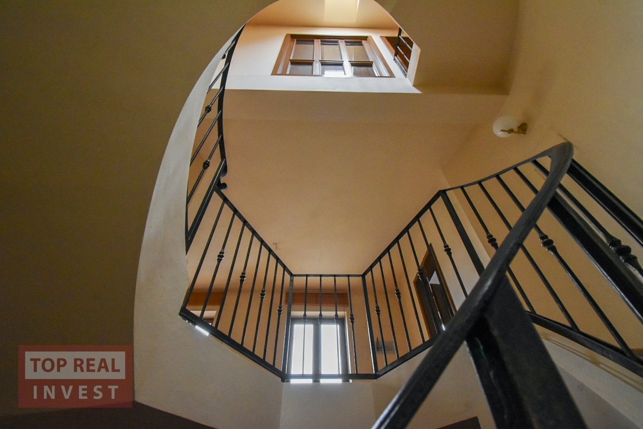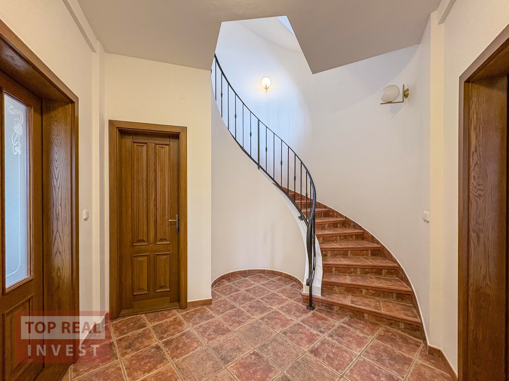 Po vstupu do domu, Vás upoutá členění domu na levou a pravou stranu, kde středem prochází úchvatné, otevřené schodiště, které se stáčí kolem sochy a propojuje všechny patra domu. Světlo do prostoru schodiště a vstupní haly, prochází skrz střešní okna.