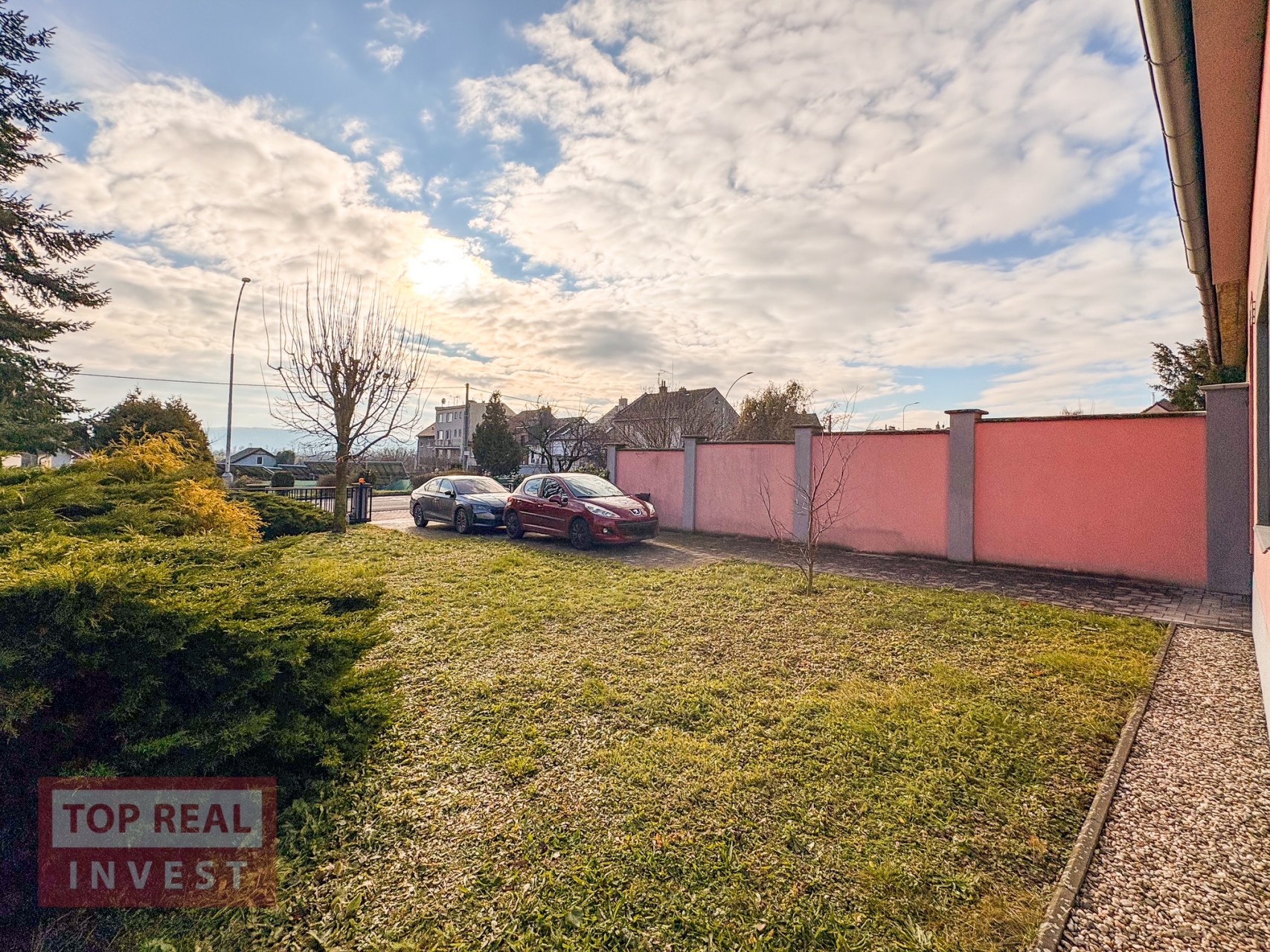 Kolem domu je zahrada, uprostřed s brankou pro větší soukromí a je vysázena okrasnými stromy a keři.
